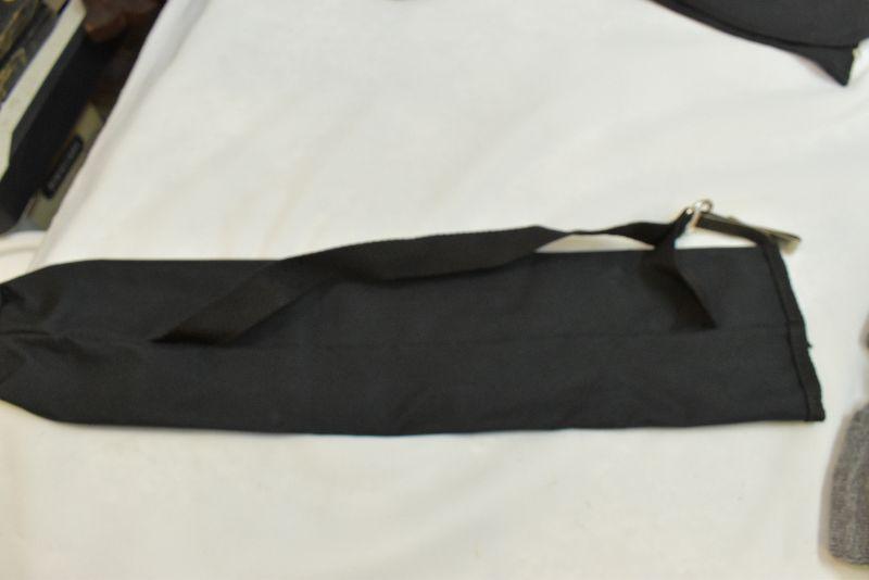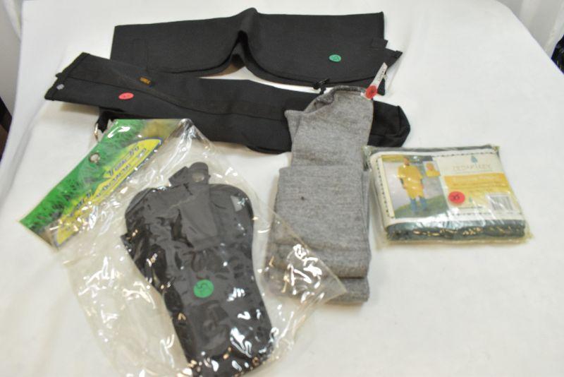 Rifle sock, holster, rain coat, two nylon cases, all new.