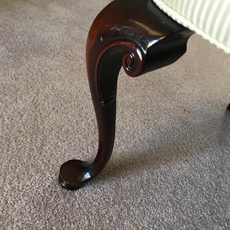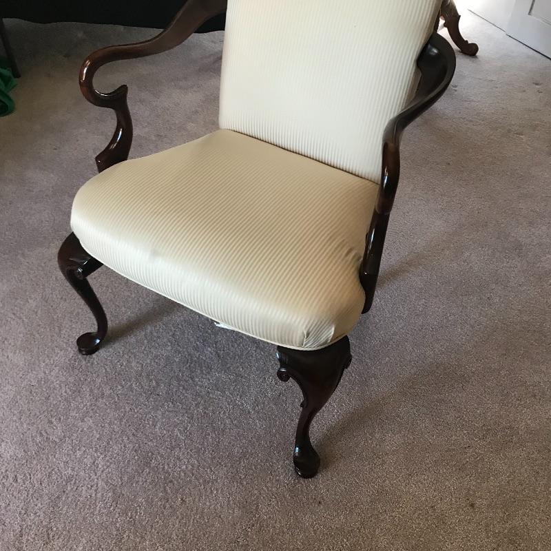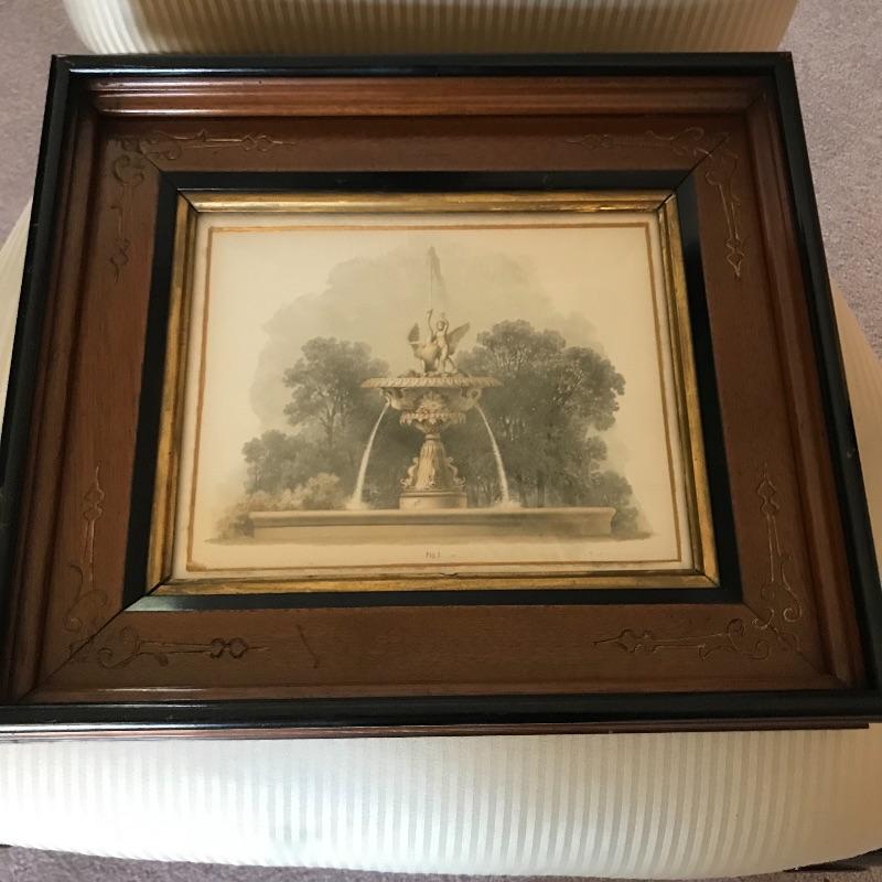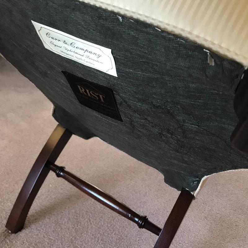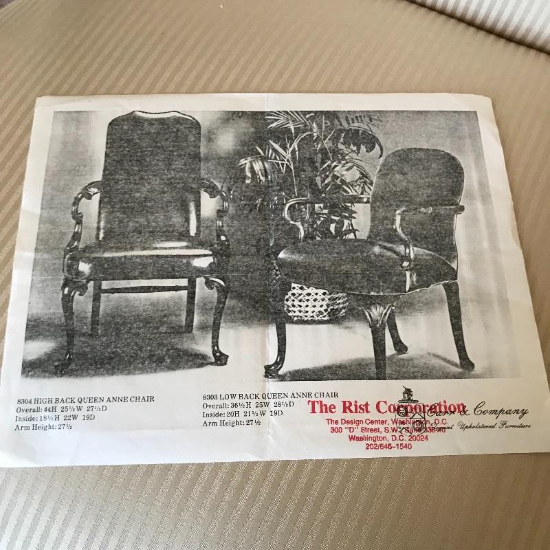 This elegant lot includes a high back Queen Anne chair marked Rist Corporation as well as Carr and Company from Morganton, NC. It also includes a framed fountain print. Chair is approx. 27” x 25” x 44” h and in great condition aside from some small stains on upholstery fabric. Print is approx. 15” x 13”. Local pickup only.