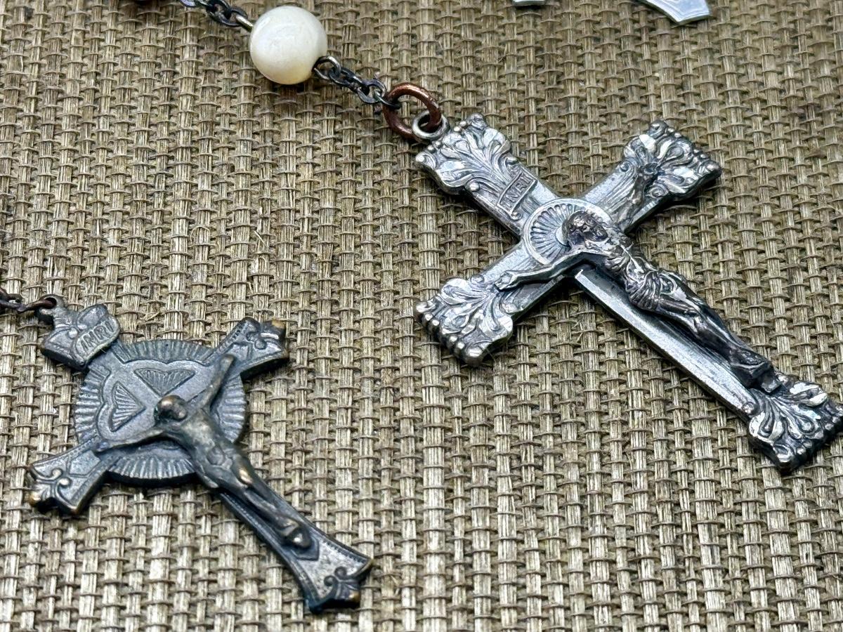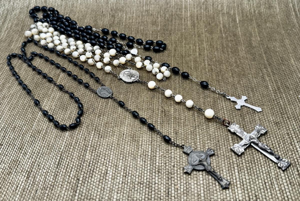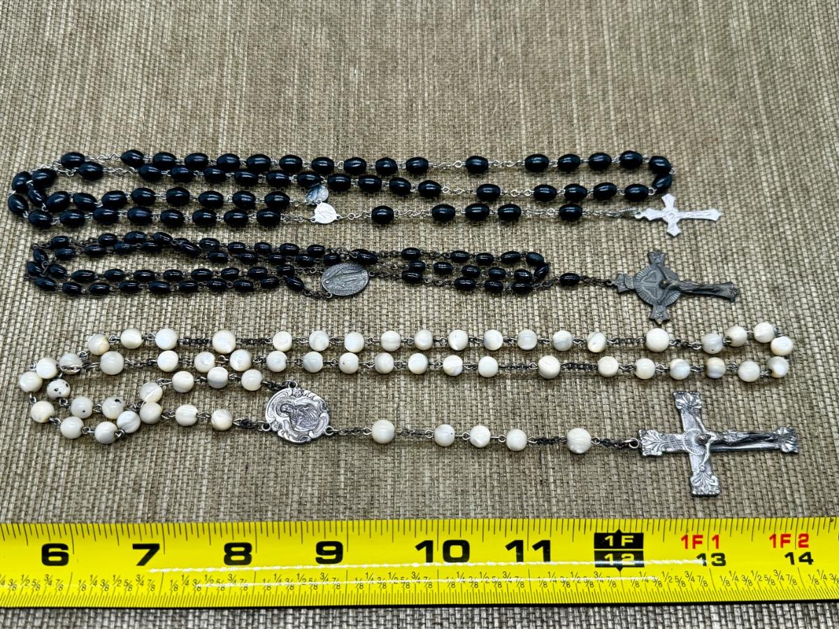 LOT 35 - Rosary Lot - One features a sterling cross (marked Sterling) and Mother of Pearl white beads. The other two have plastic beads and metal crosses without any markings. Some patina to the crosses, overall good condition.