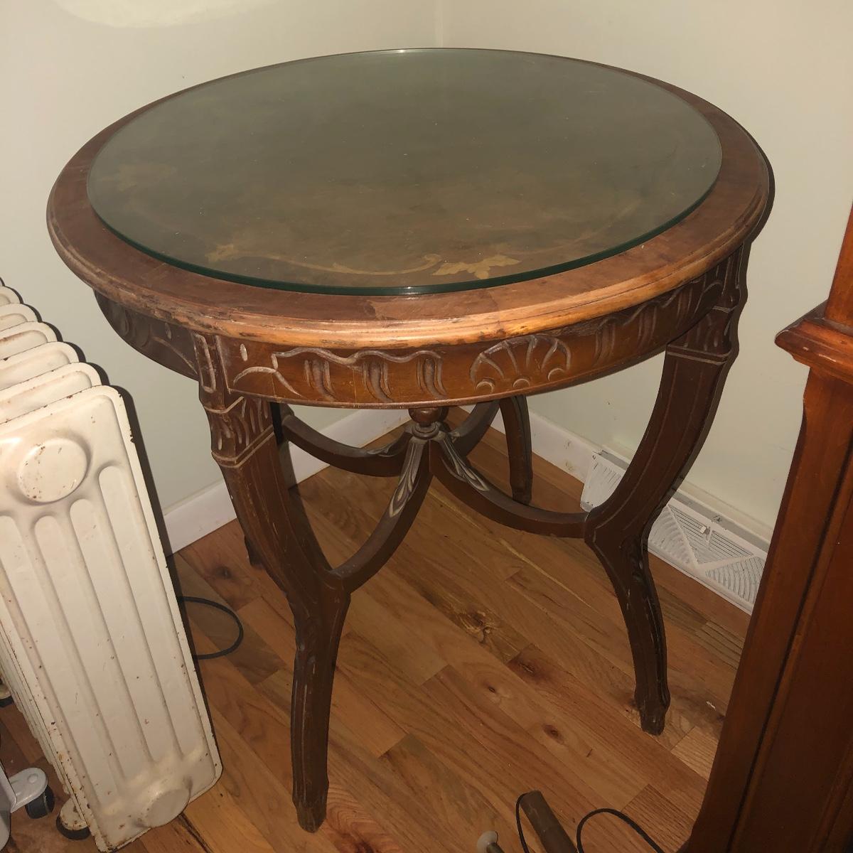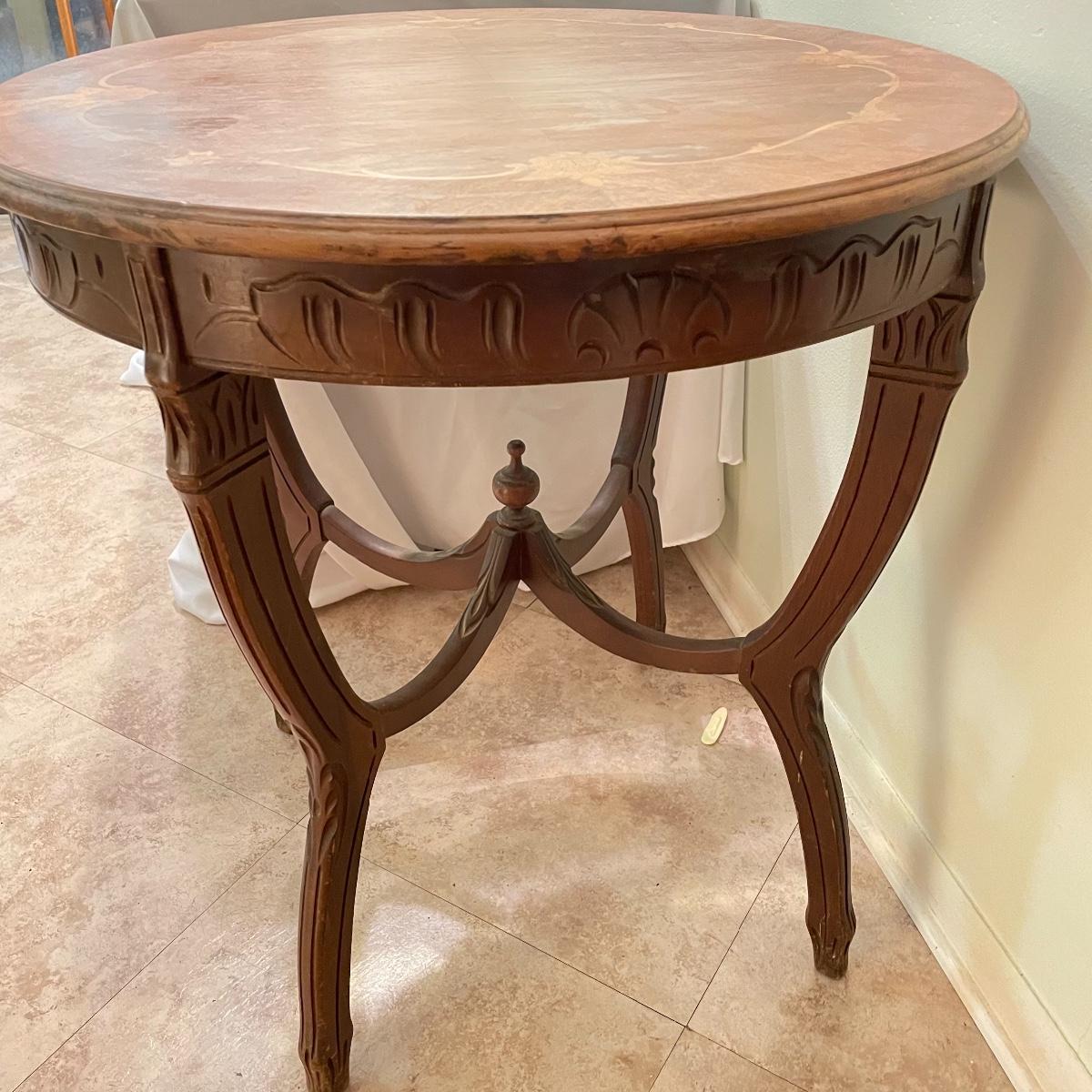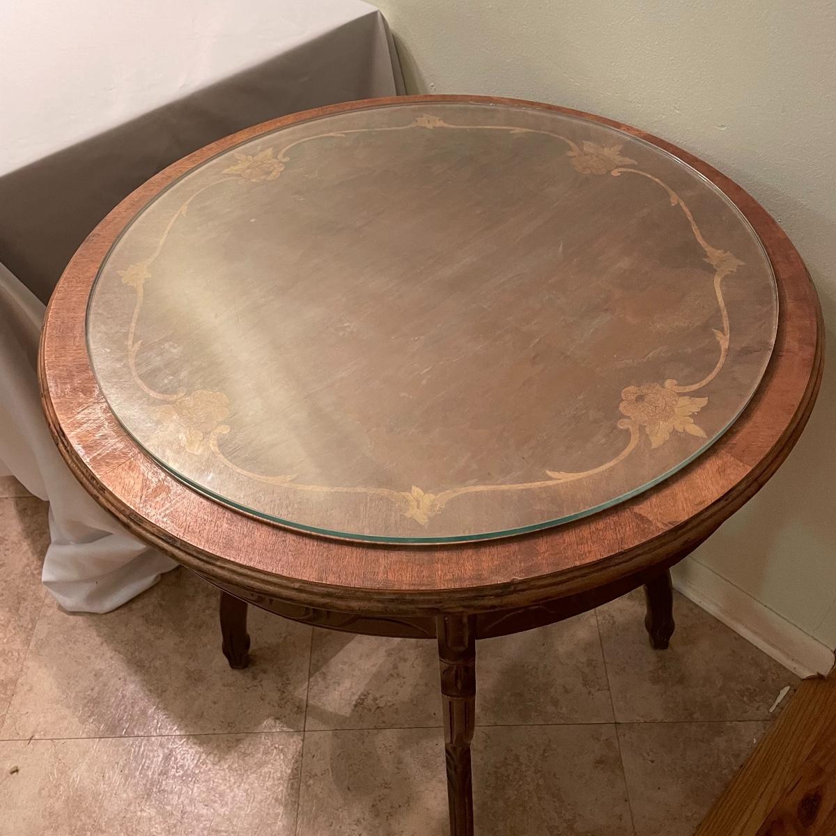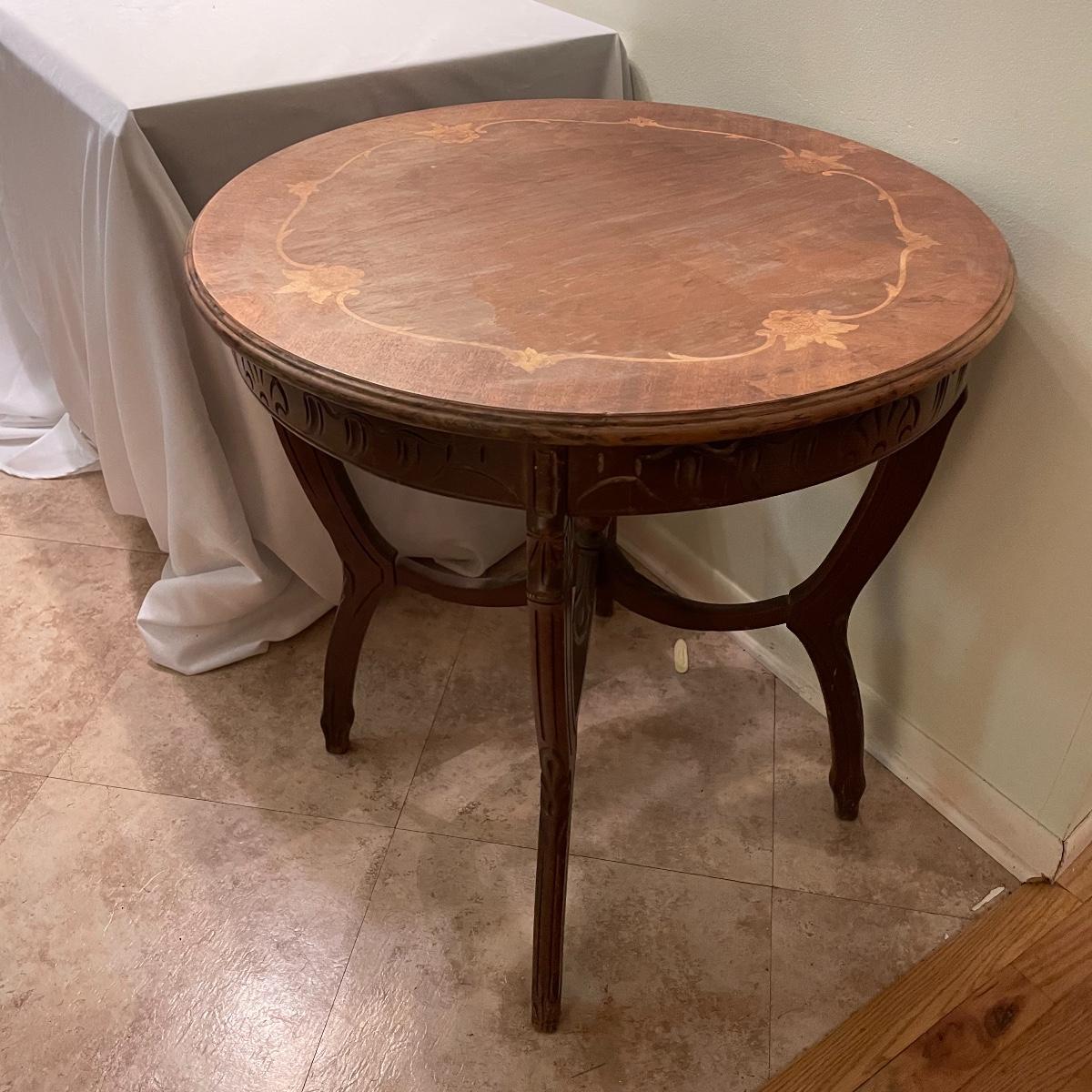 Stunning wooden table with what appears to be inlay foliage design on top. The ornate legs and carved design really add some unique style to the piece. This table with a glass top that covers the inlay, but not the entire surface. It’s about 30 inches tall with the same diameter. Local pick up only.