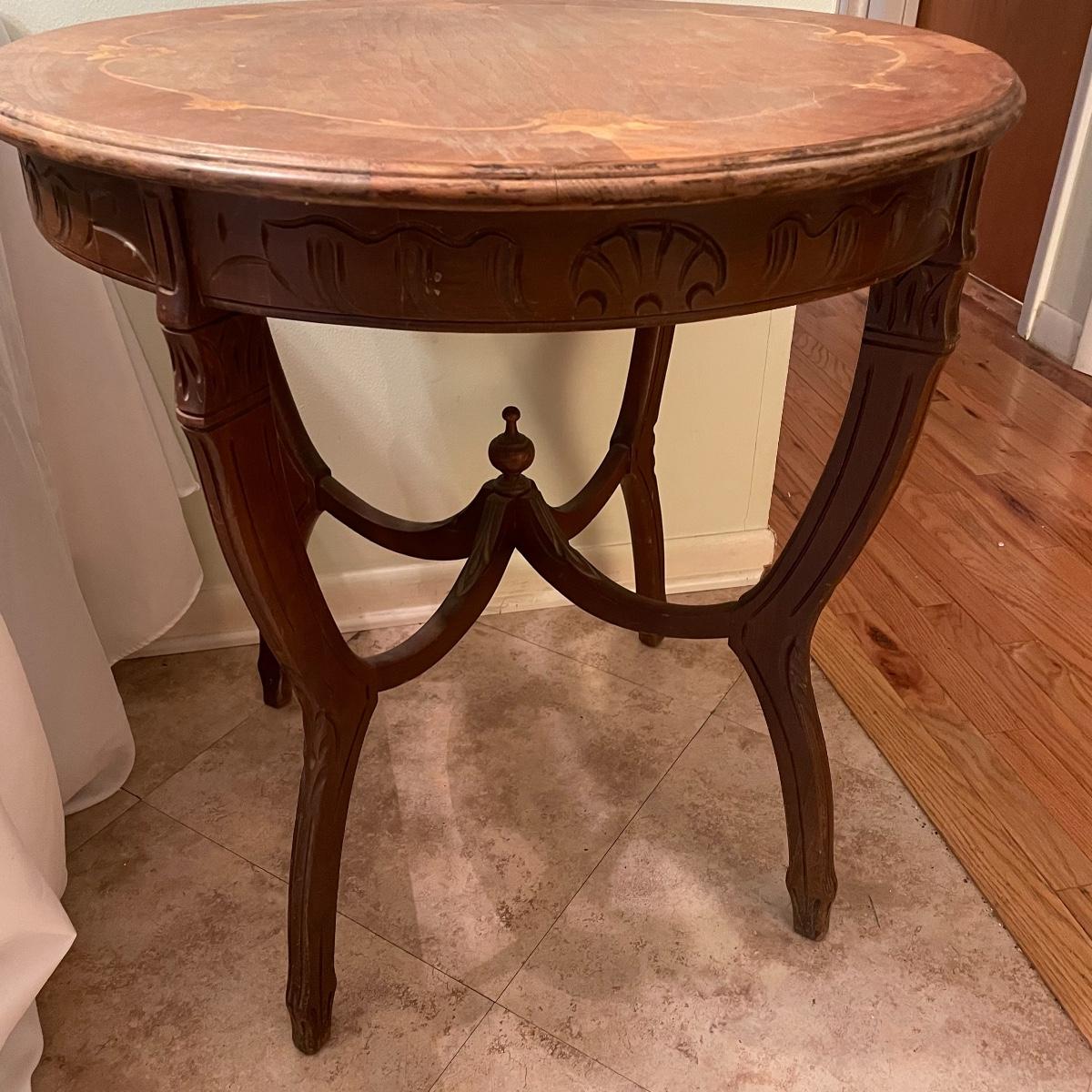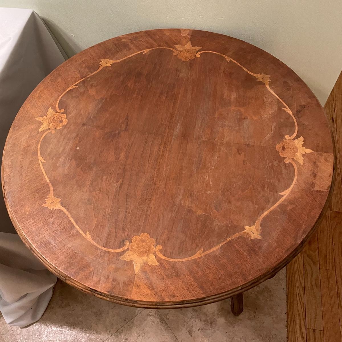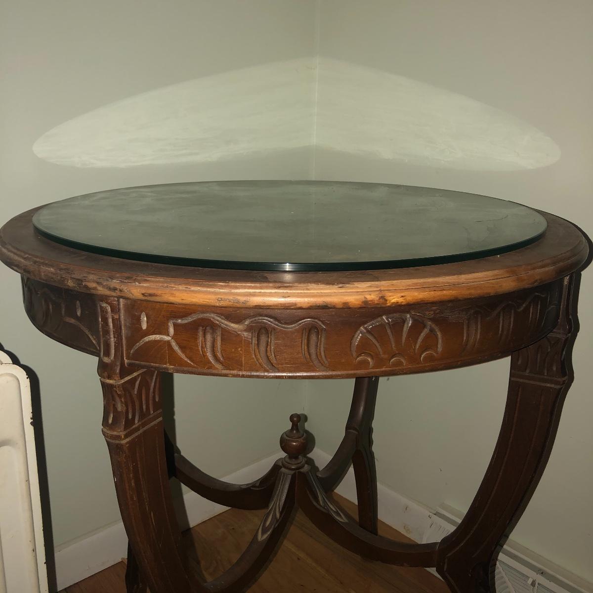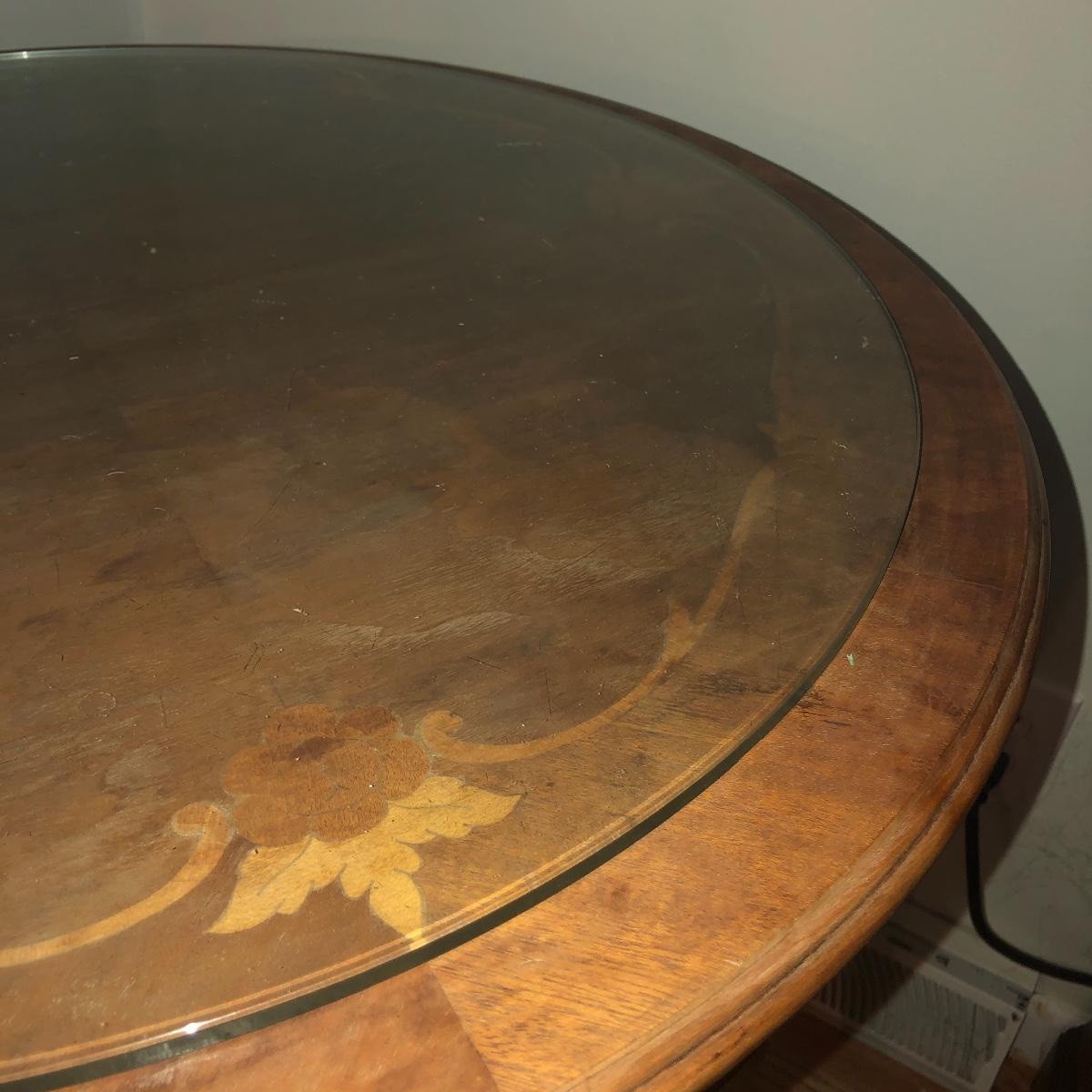 Stunning wooden table with what appears to be inlay foliage design on top. The ornate legs and carved design really add some unique style to the piece. This table with a glass top that covers the inlay, but not the entire surface. It’s about 30 inches tall with the same diameter. Local pick up only.