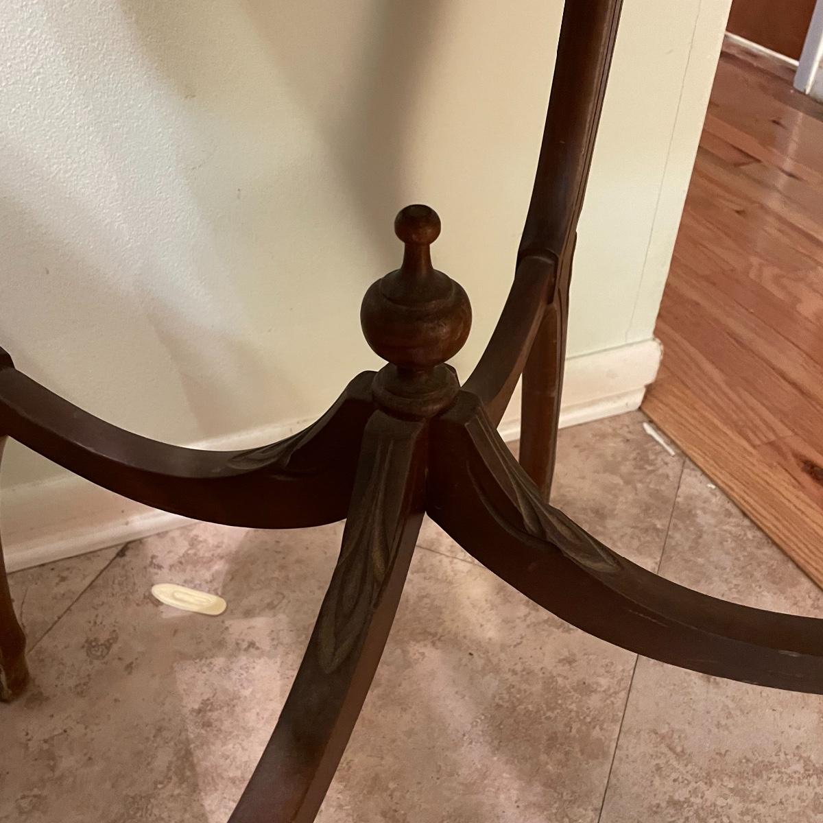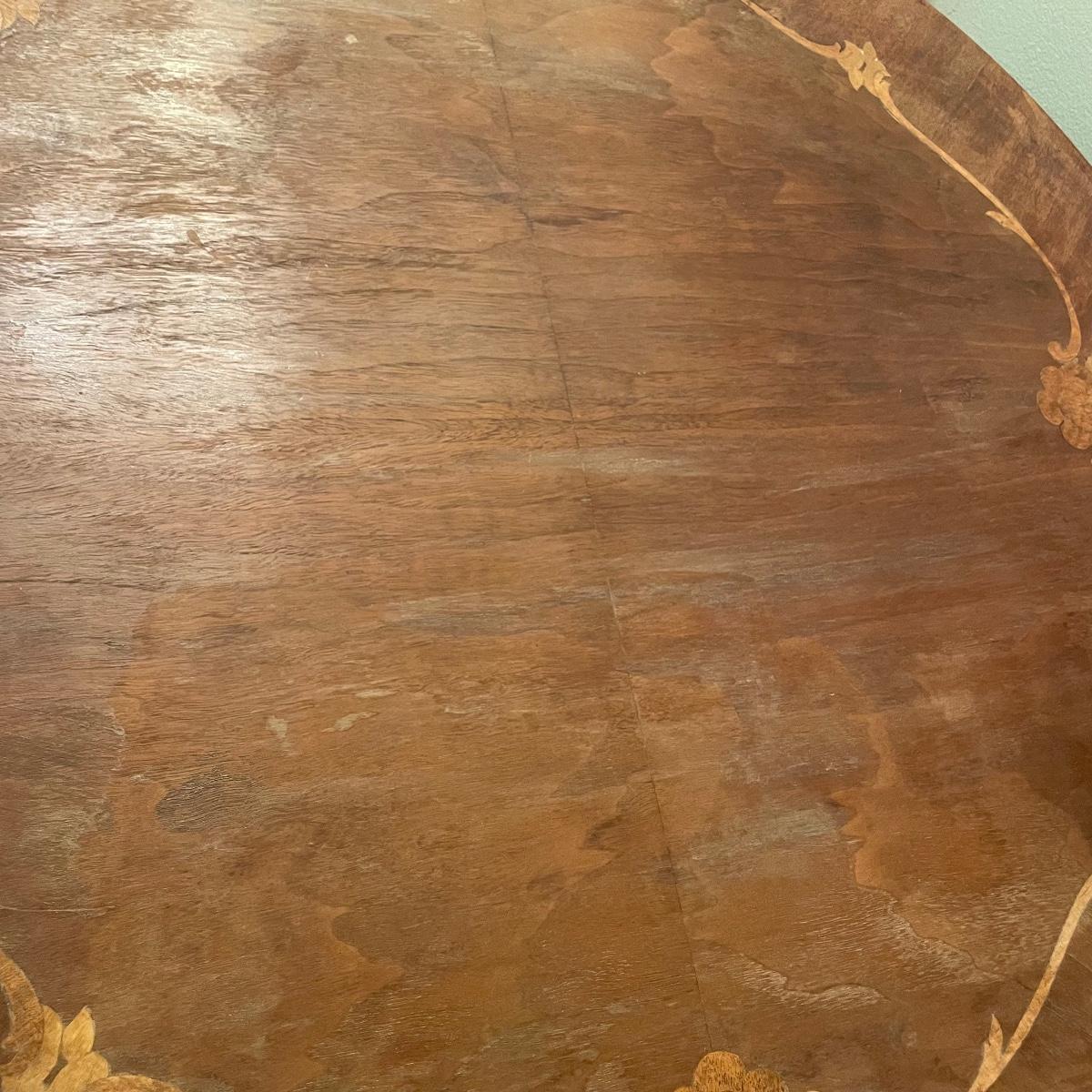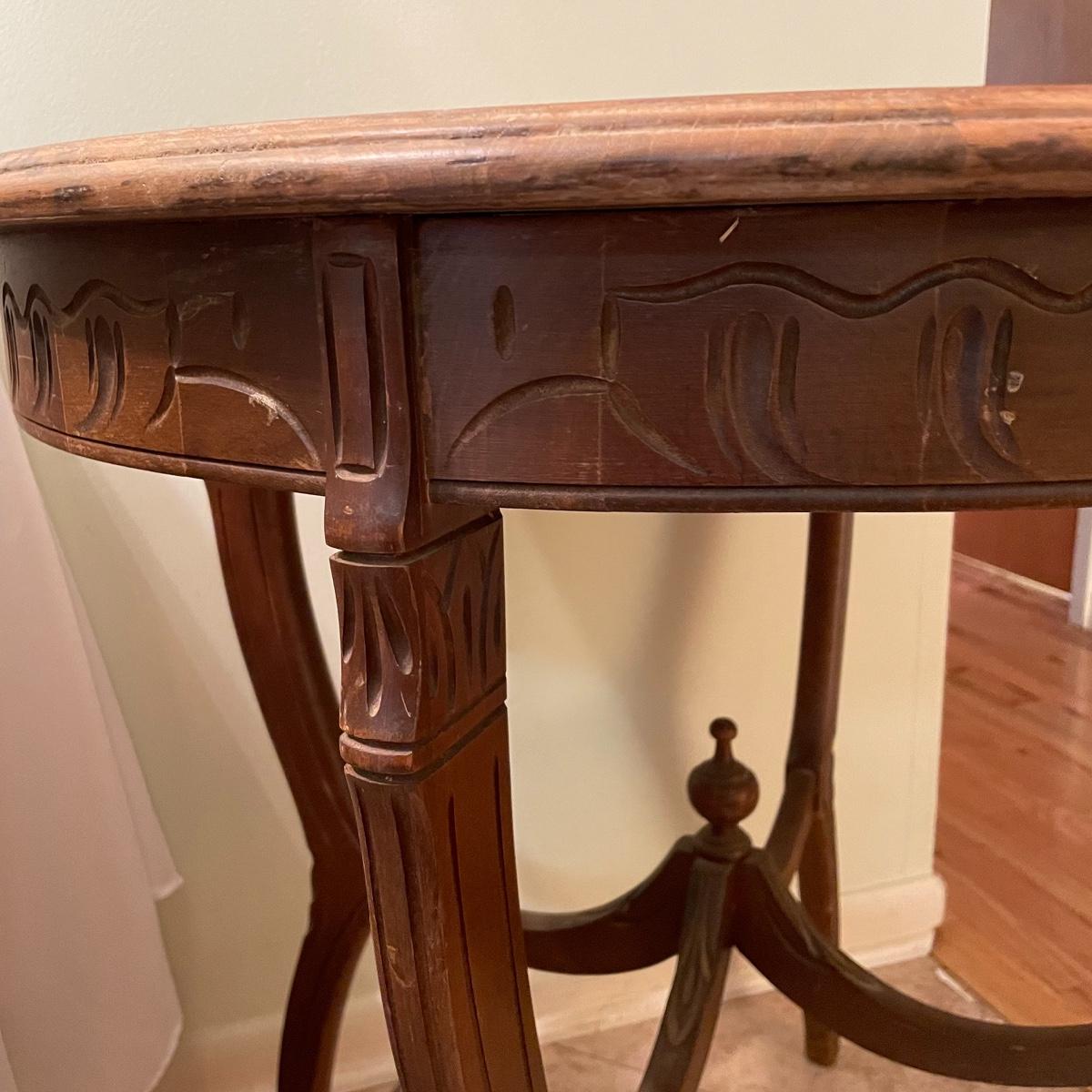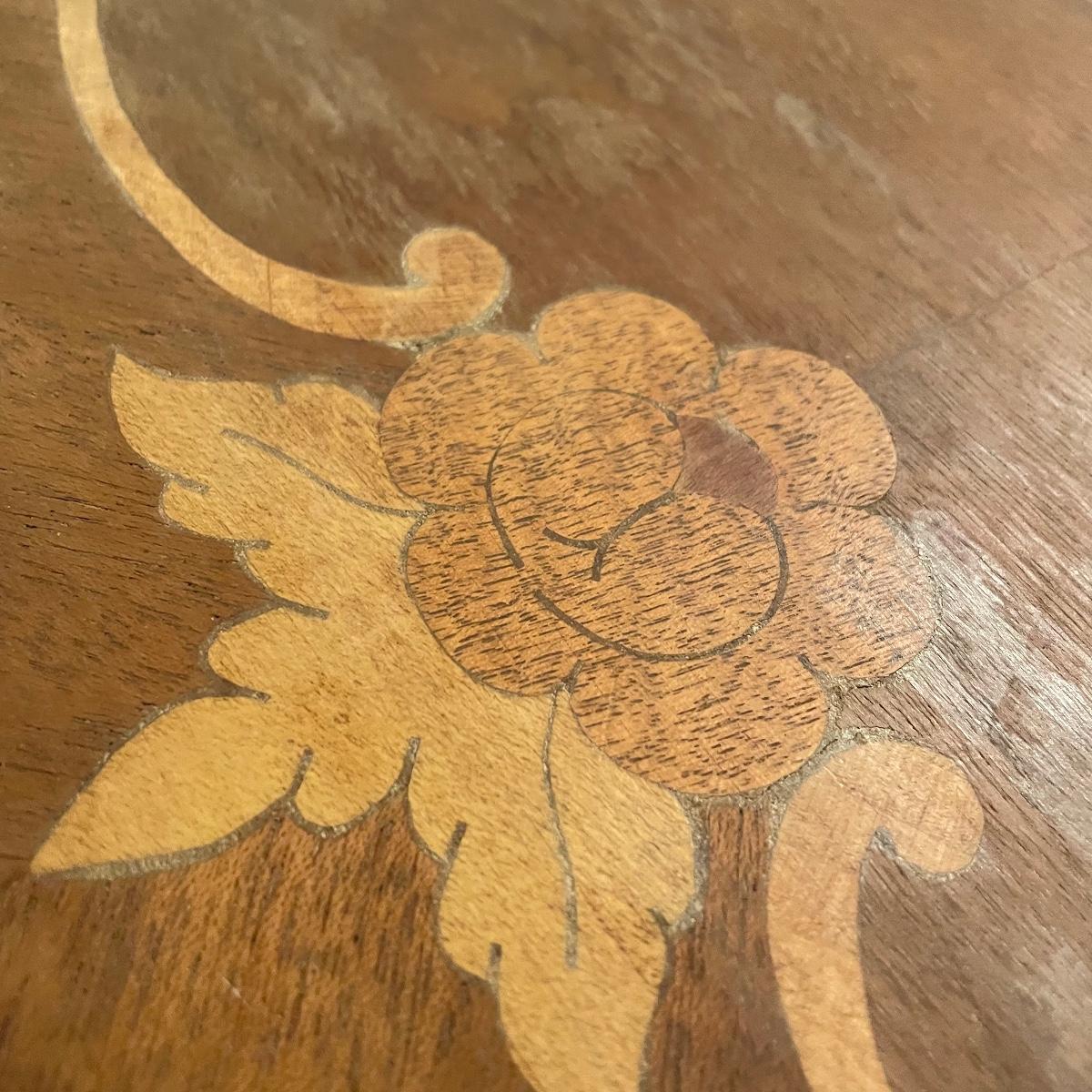 Stunning wooden table with what appears to be inlay foliage design on top. The ornate legs and carved design really add some unique style to the piece. This table with a glass top that covers the inlay, but not the entire surface. It’s about 30 inches tall with the same diameter. Local pick up only.