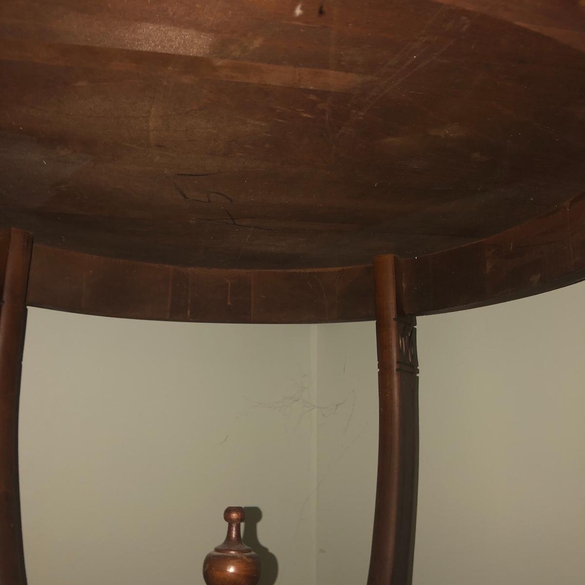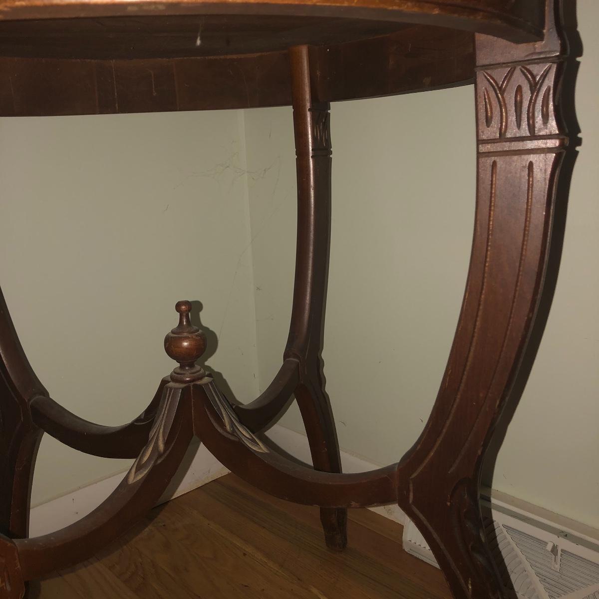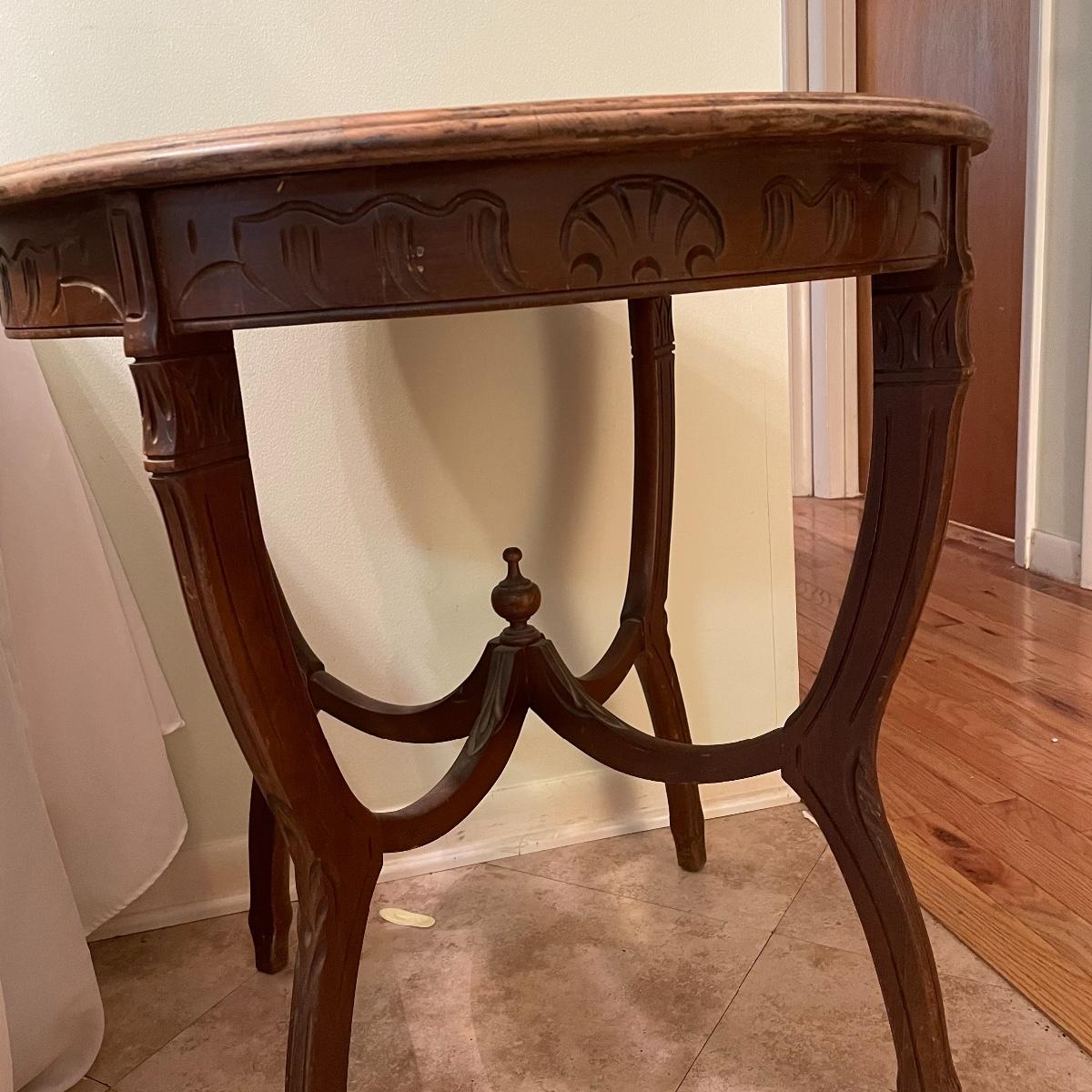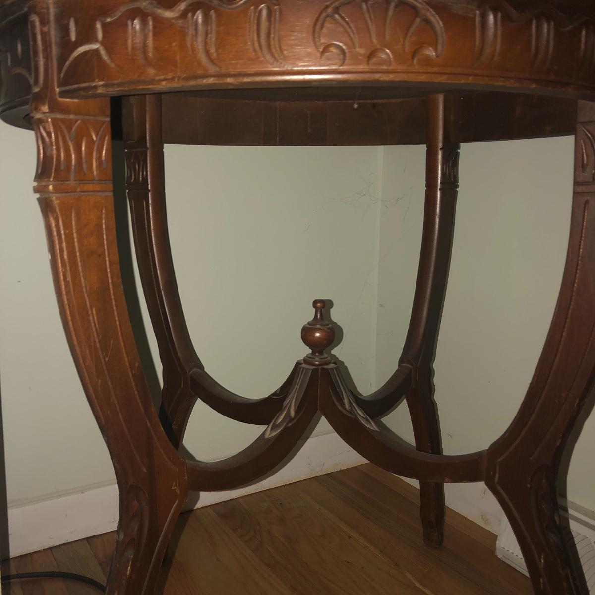 Stunning wooden table with what appears to be inlay foliage design on top. The ornate legs and carved design really add some unique style to the piece. This table with a glass top that covers the inlay, but not the entire surface. It’s about 30 inches tall with the same diameter. Local pick up only.