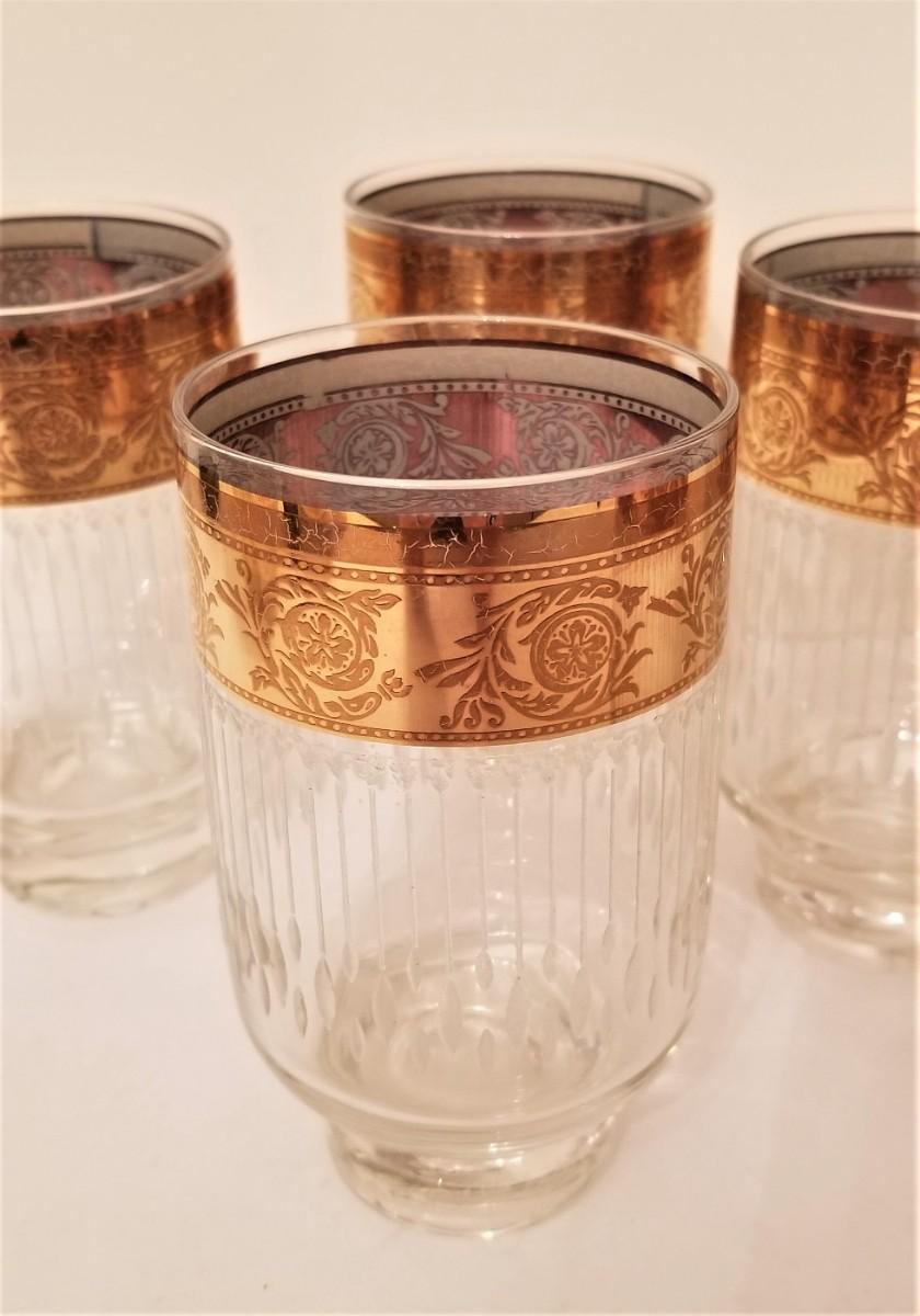A classic mid-century design - ribbed drinking glasses with a gold foliate band around the top. Note: these should be hand-washed (not dishwasher safe). Good vintage condition. Each stands 5" tall.
