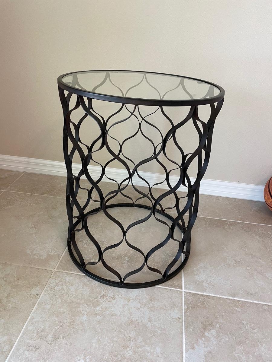 Black Metal side table with glass top. Table measures 25" tall and is 20" in diameter.