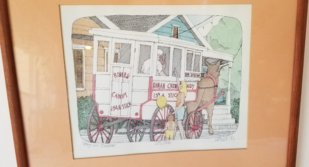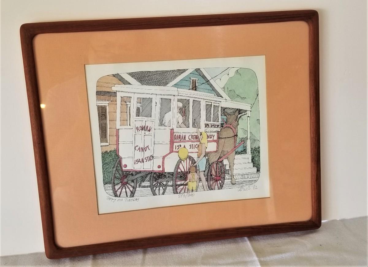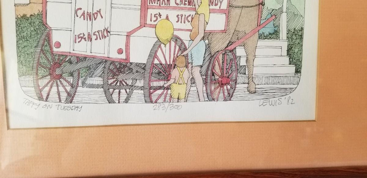 "Taffy on Tuesdays" is the title of this charming signed/numbered print - 283/300, pencil signed. Done in 1982. Framed/matted. Measures 14.5" x 11.5" Good condition.