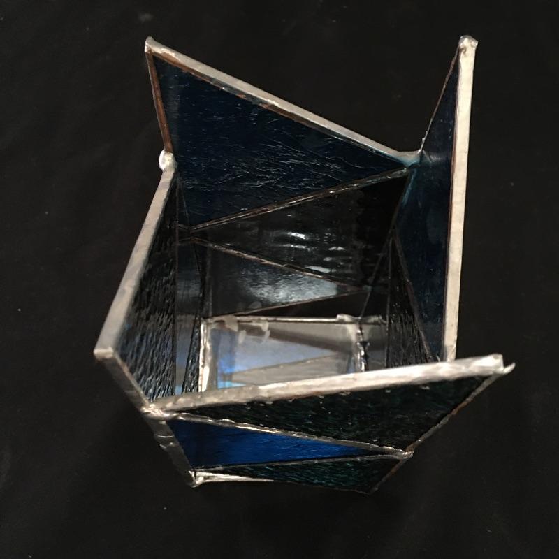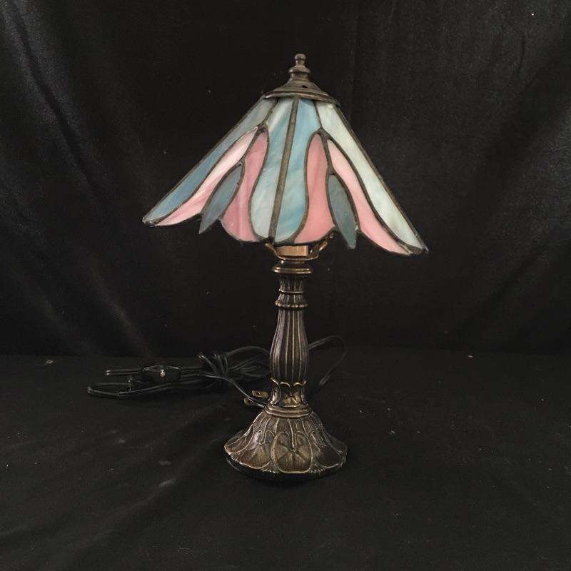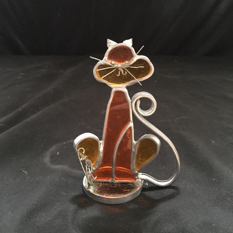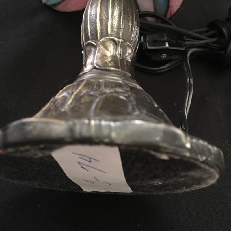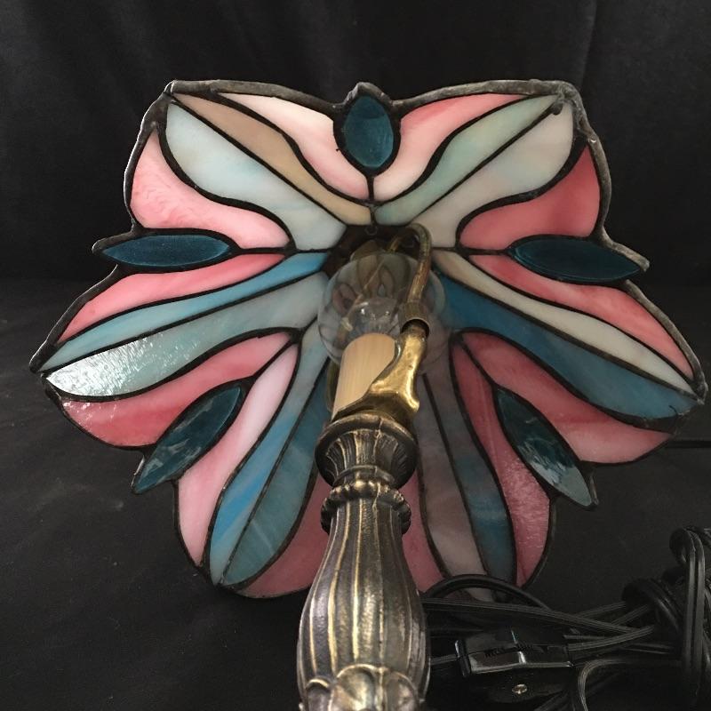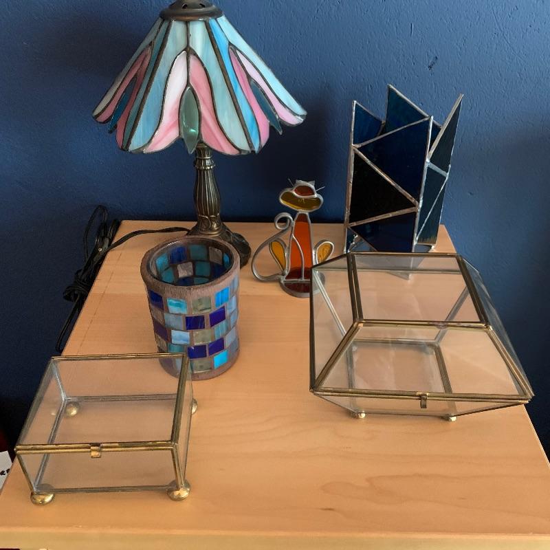 Stained glass and more. Lot includes small Tiffany style lamp, stained glass cat statue, signed cup and tea light holder. Also includes two small glass boxes with hinged lids. Lamp measures 8”D x 11” tall. Lamp worked when tested.