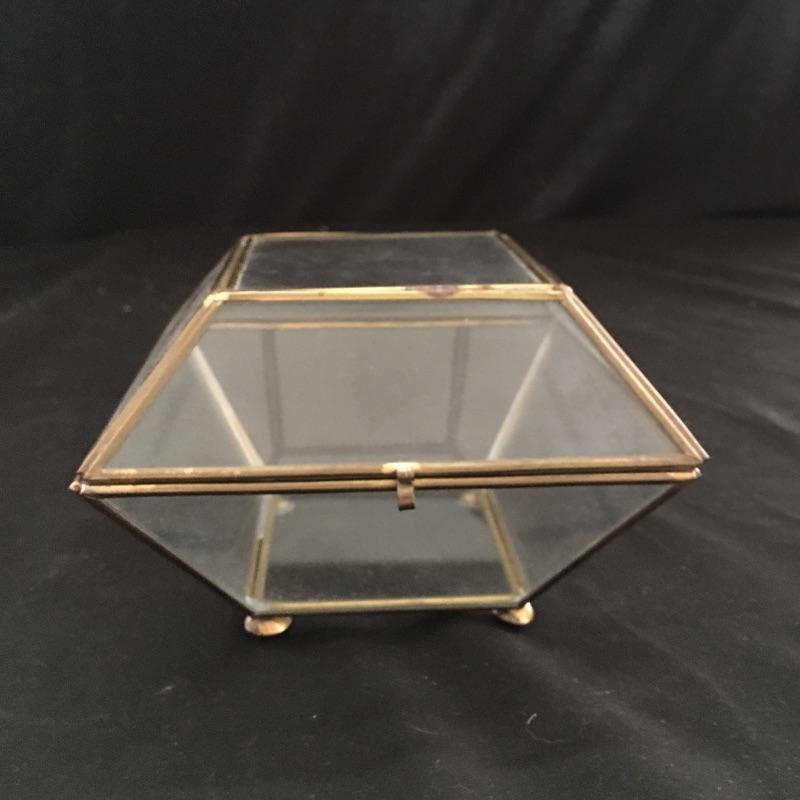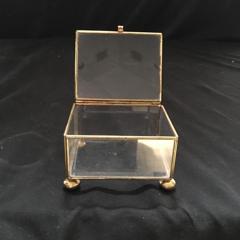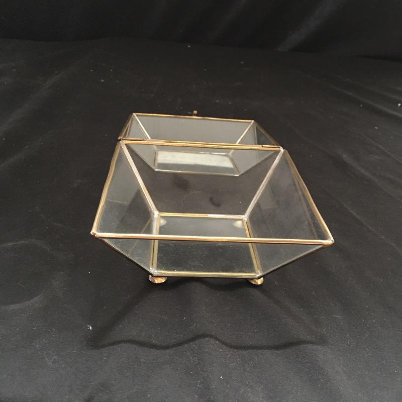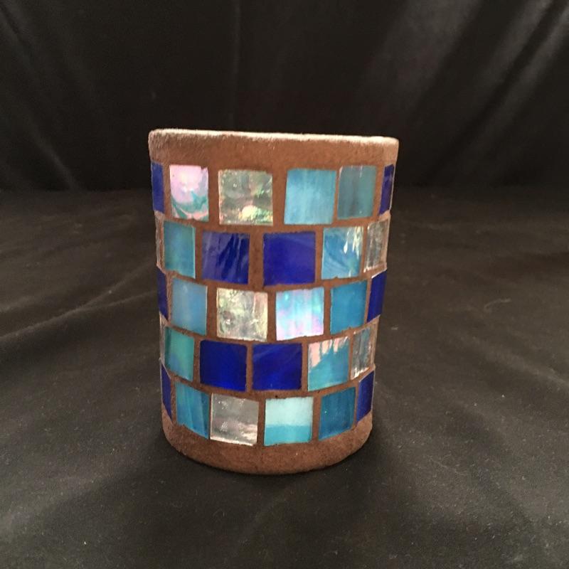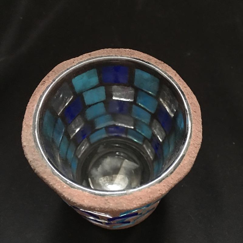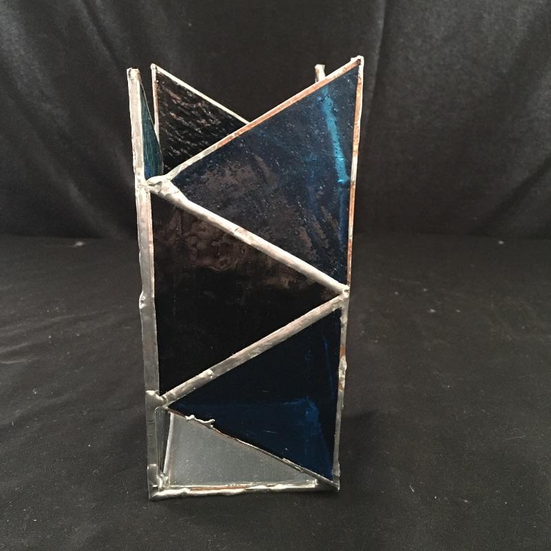 Stained glass and more. Lot includes small Tiffany style lamp, stained glass cat statue, signed cup and tea light holder. Also includes two small glass boxes with hinged lids. Lamp measures 8”D x 11” tall. Lamp worked when tested.