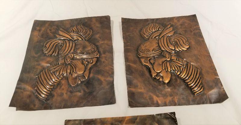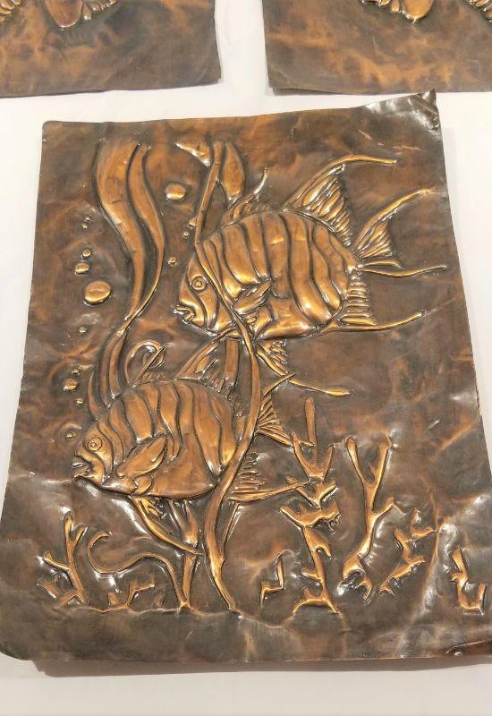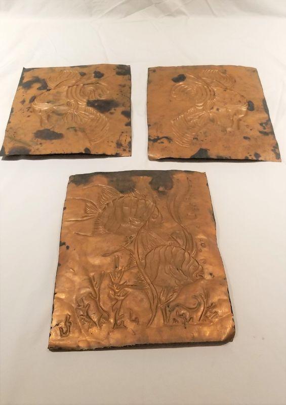 Set of three - 2 African heads and one Fish scene - on thin sheets of copper. Mid Century. These could be mounted on wood. Each measures 9" x 11". Price is for all three.