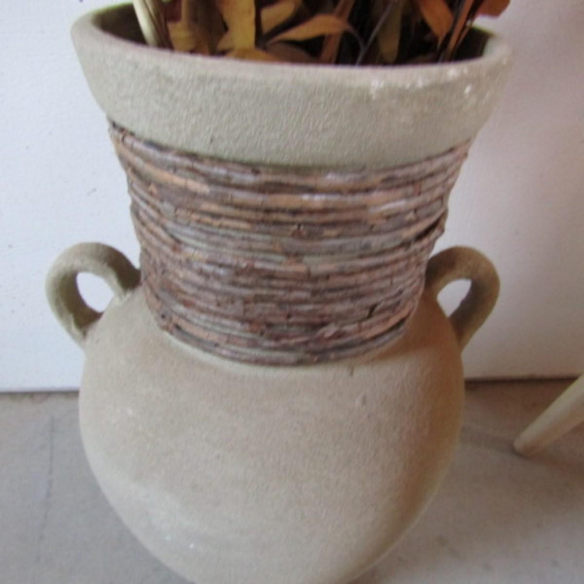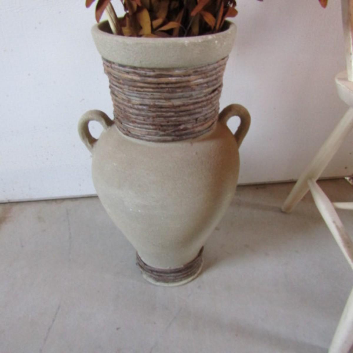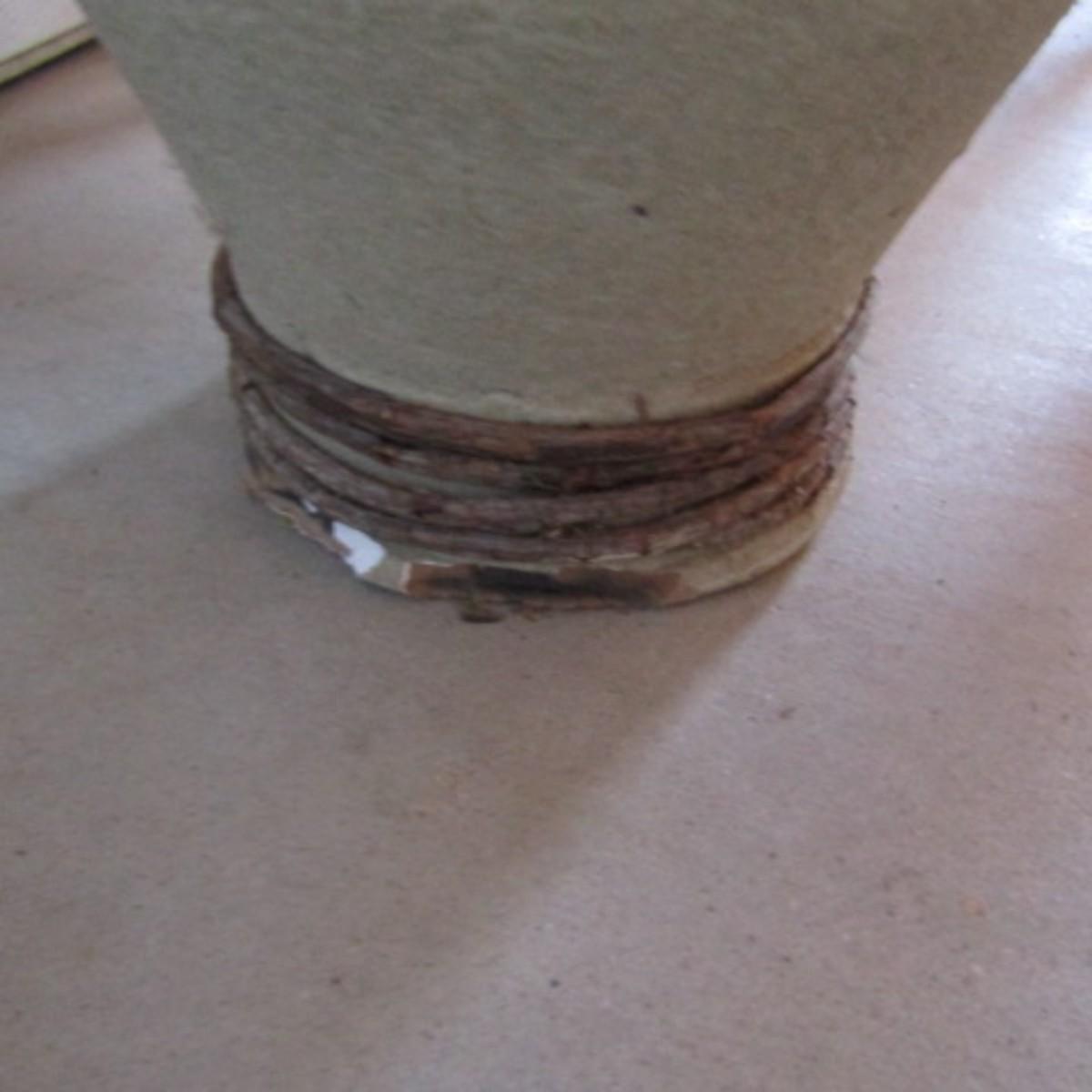 TWIG ACCENTS ALONG THE TOP AND BASE OF THIS CLAY FLOOR VASE (SOME DAMAGE TO THE BASE)