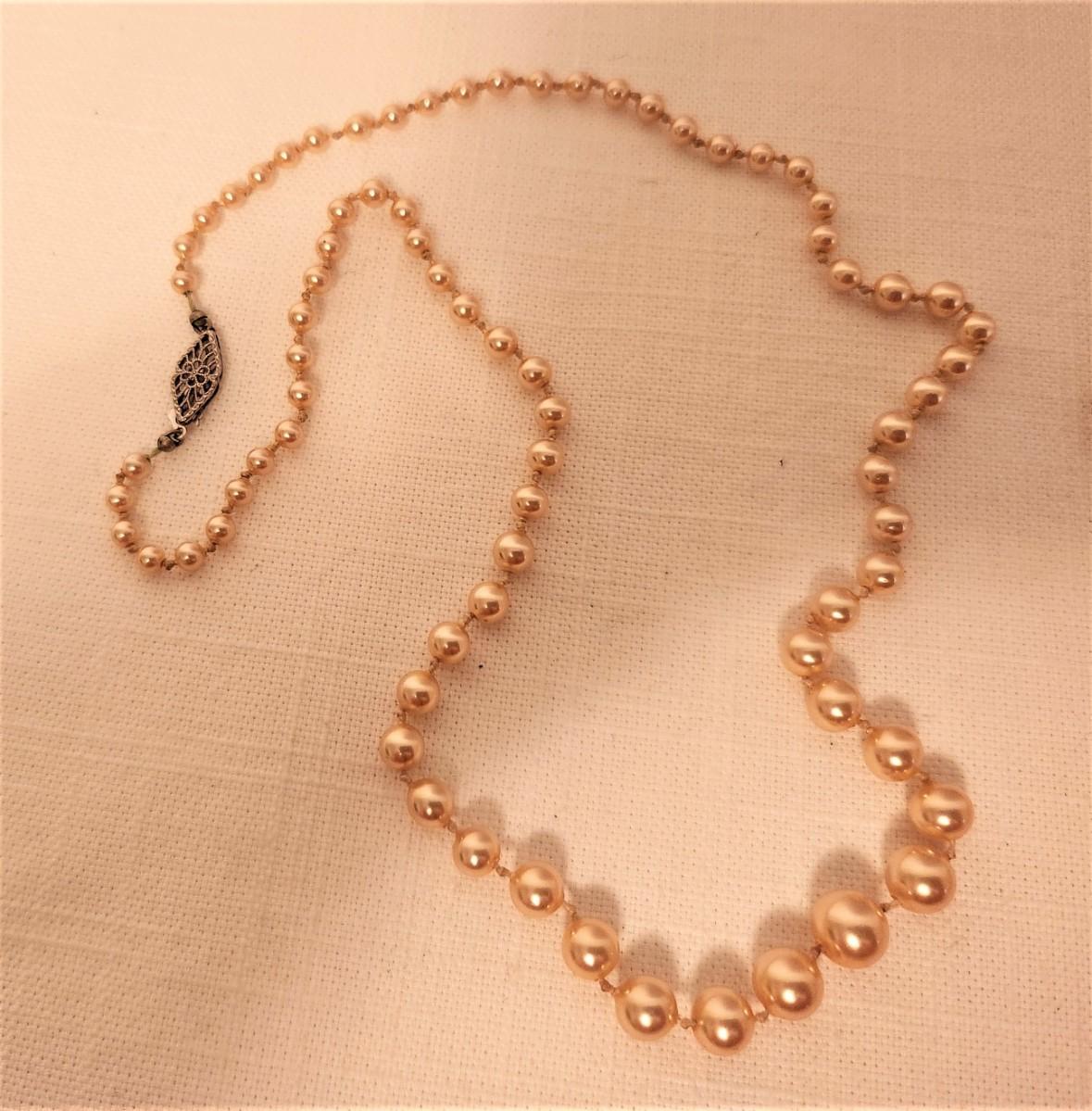 Two decent strands of costume pearls - the one on the left is 18" long and has a 10kt white gold clasp. The one on the right is 24" inches long, marked MONET. Gently used condition.