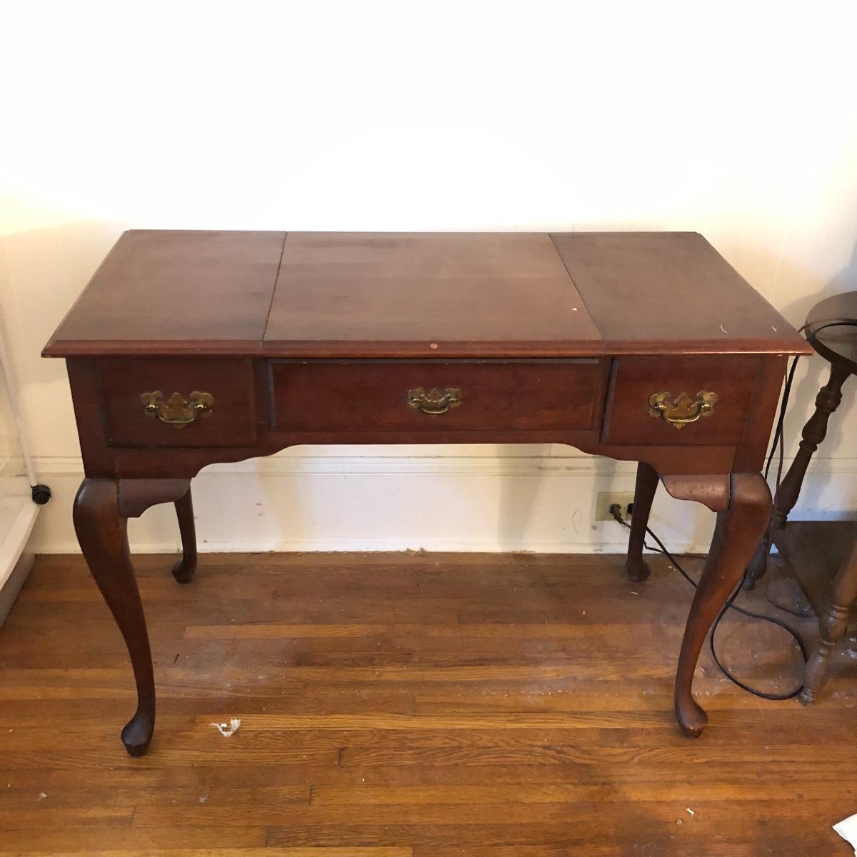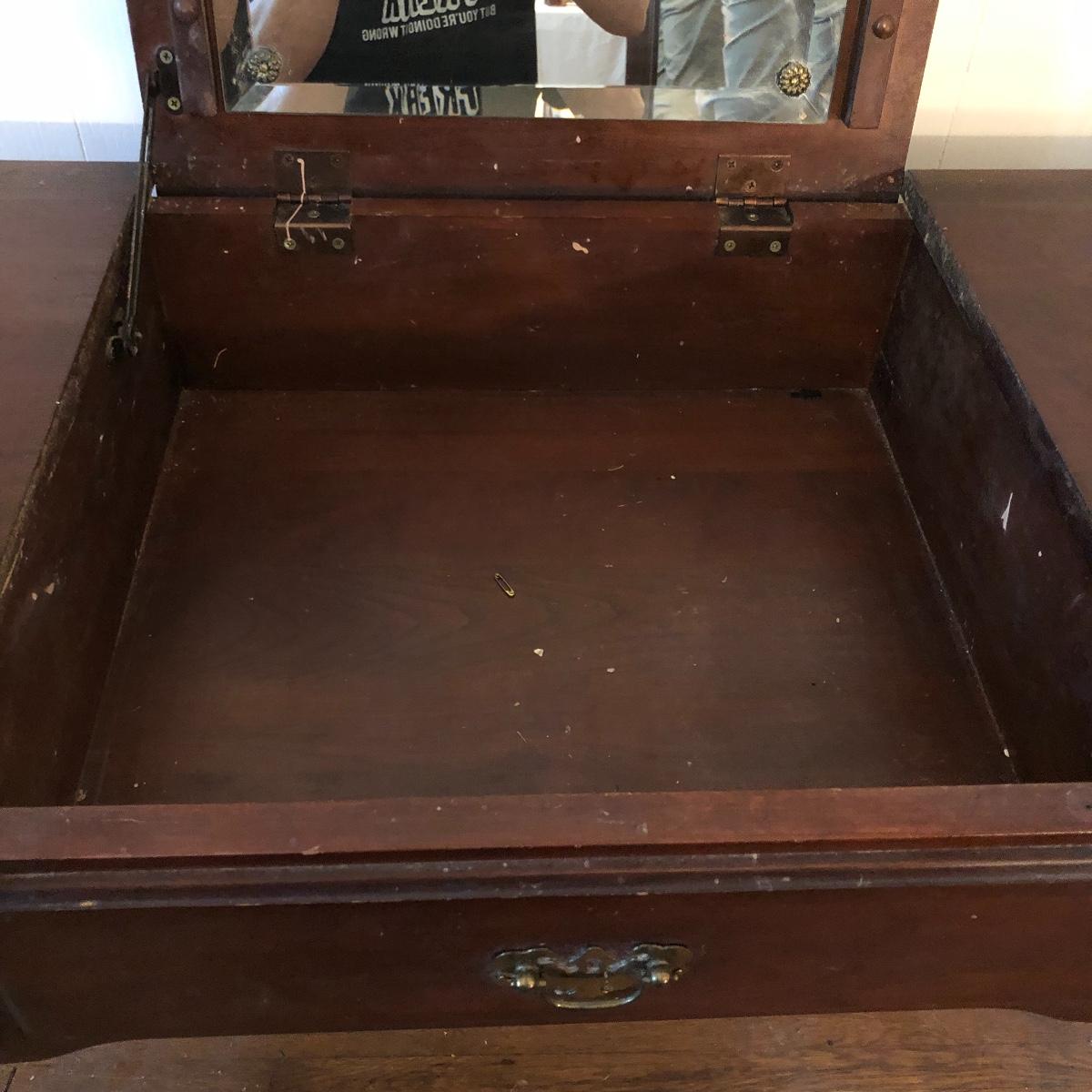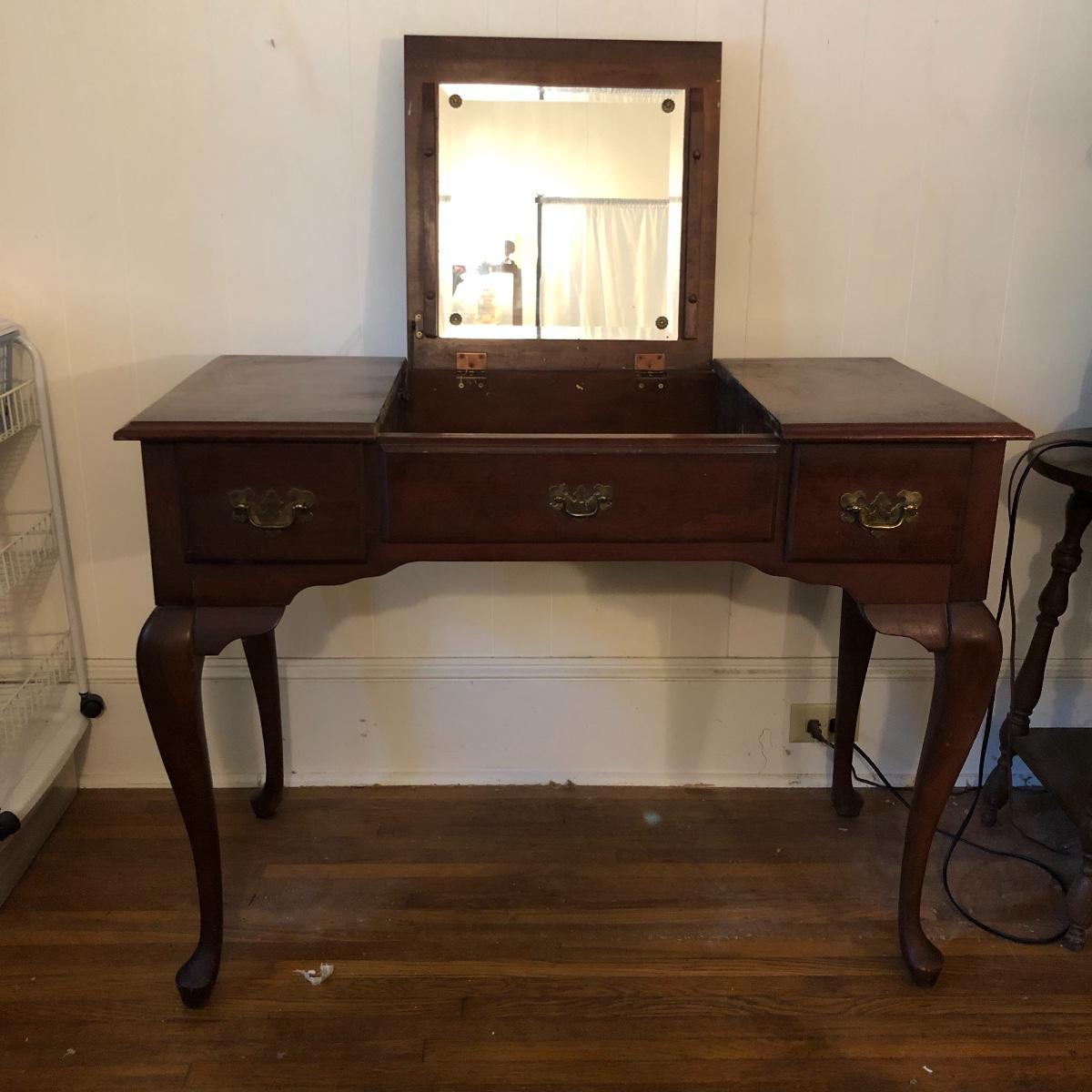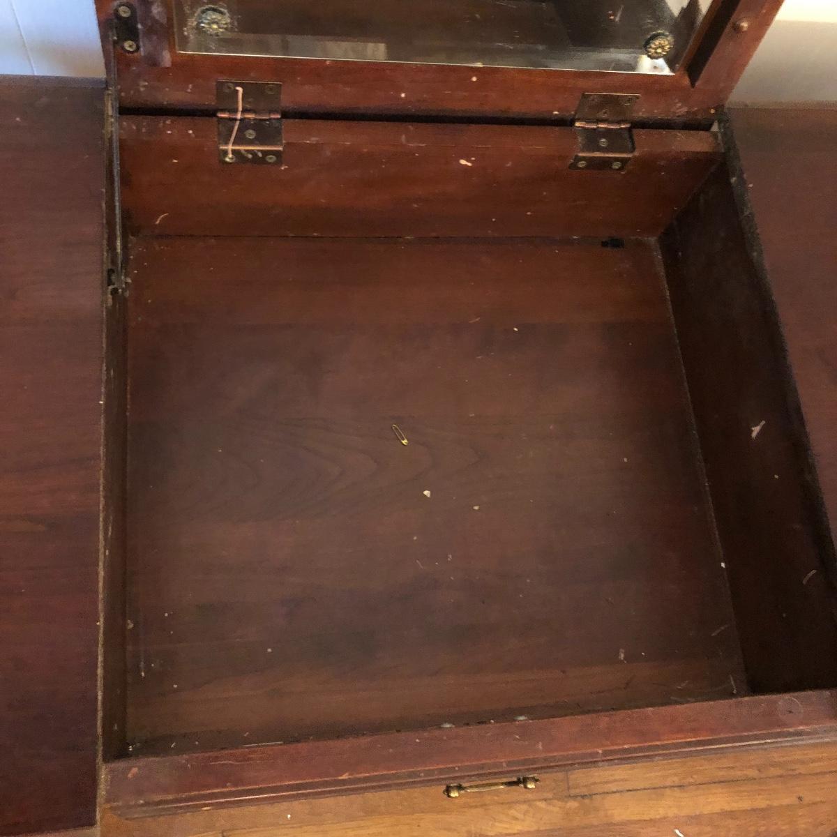 A nice vanity table with beveled mirror. Table has two dovetailed drawers and has beveled mirror inside the fold down top. Table has scratches and nicks, see pictures. Table measures 19.5” x 40.5” x 31”. No manufacturer’s mark is found on the table.