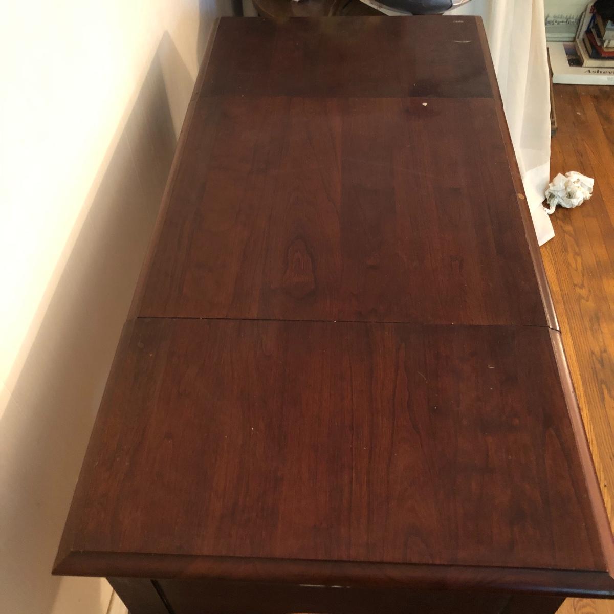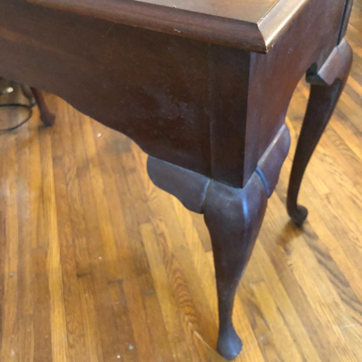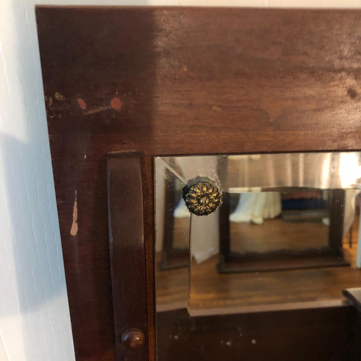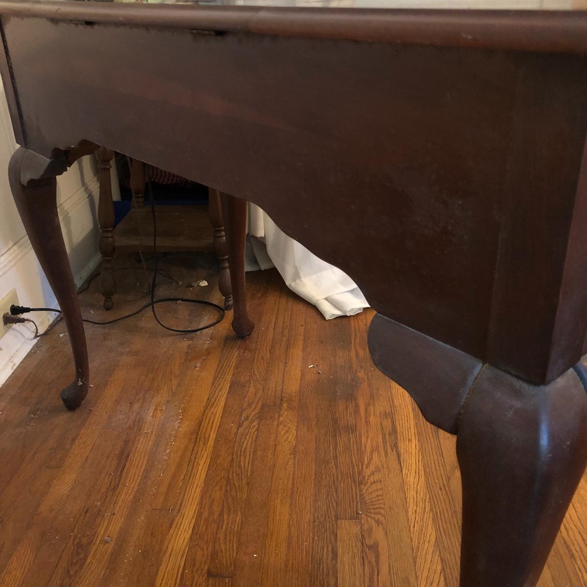 A nice vanity table with beveled mirror. Table has two dovetailed drawers and has beveled mirror inside the fold down top. Table has scratches and nicks, see pictures. Table measures 19.5” x 40.5” x 31”. No manufacturer’s mark is found on the table.