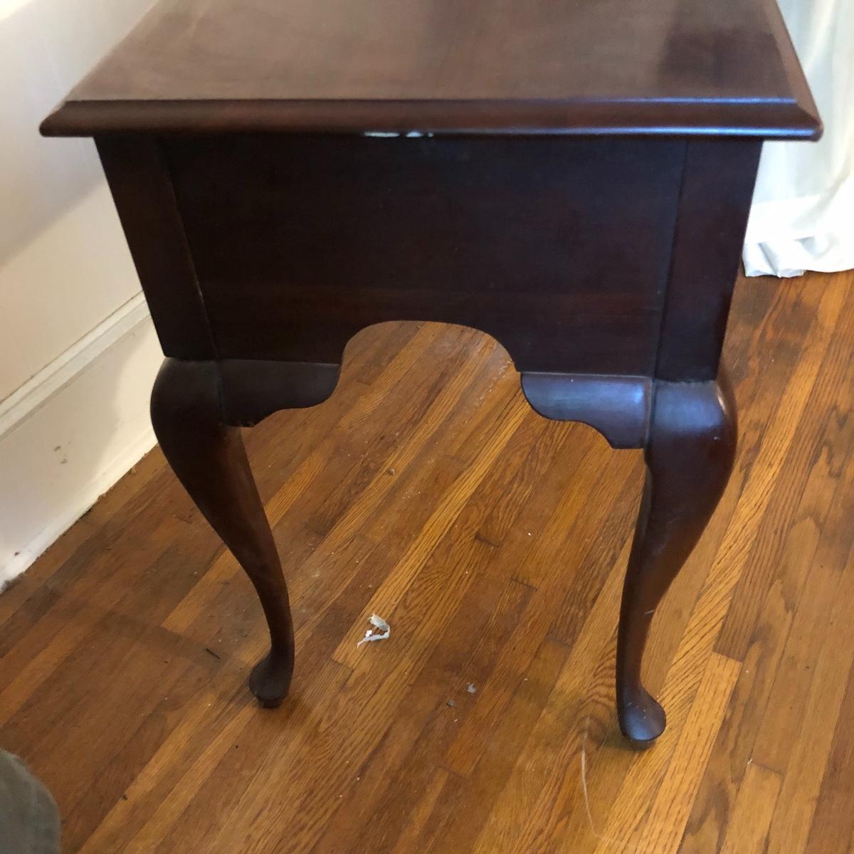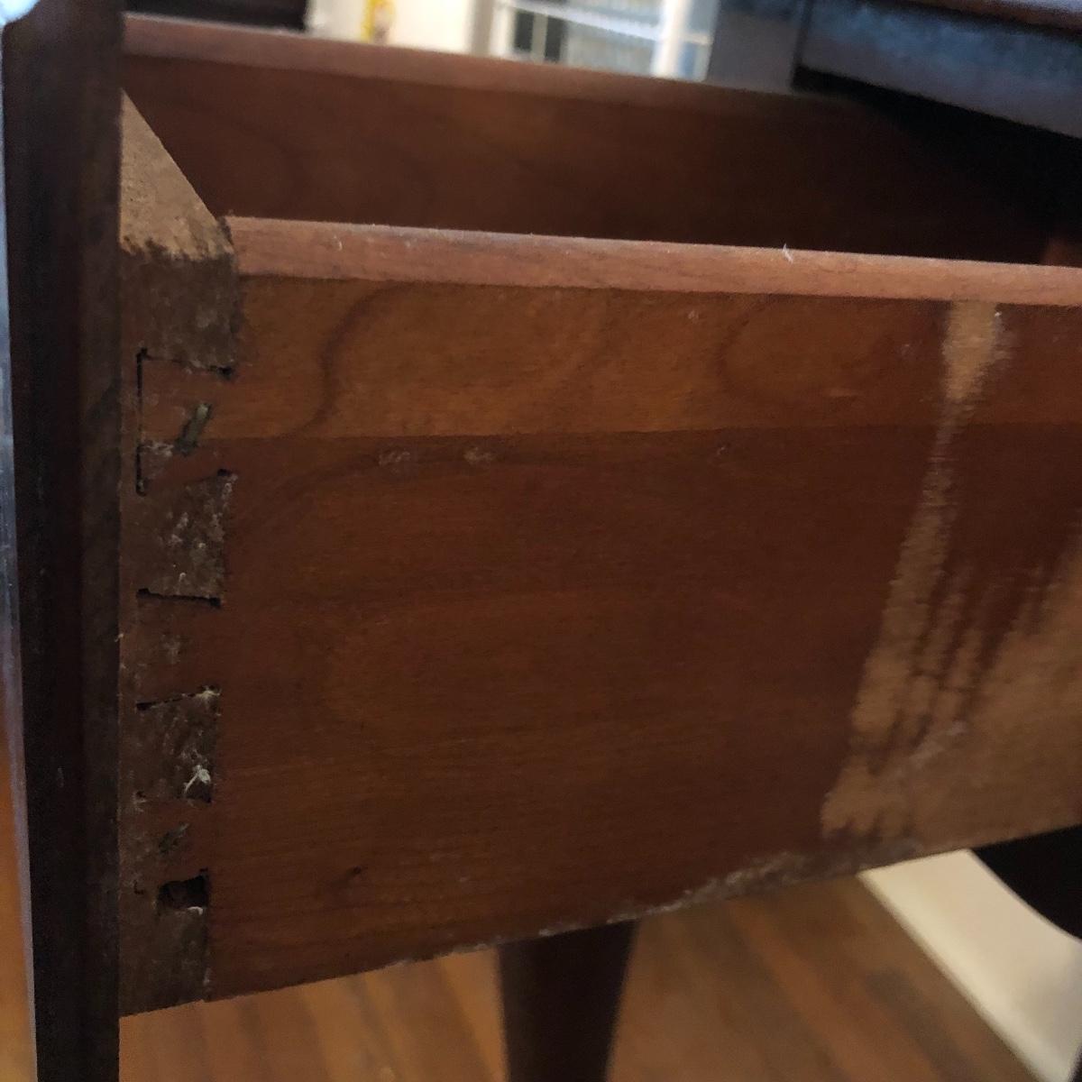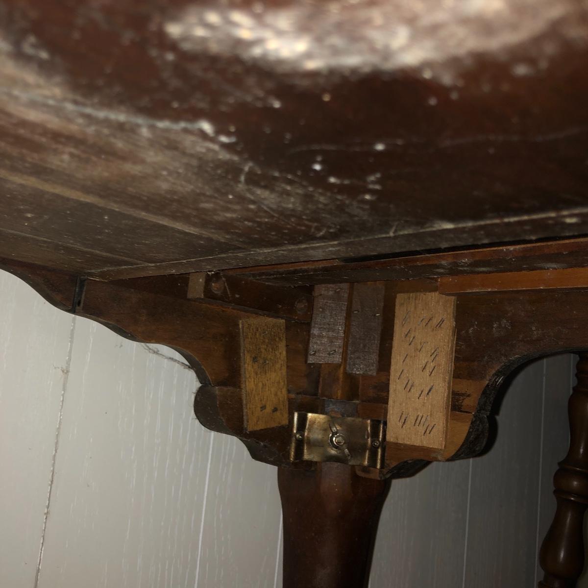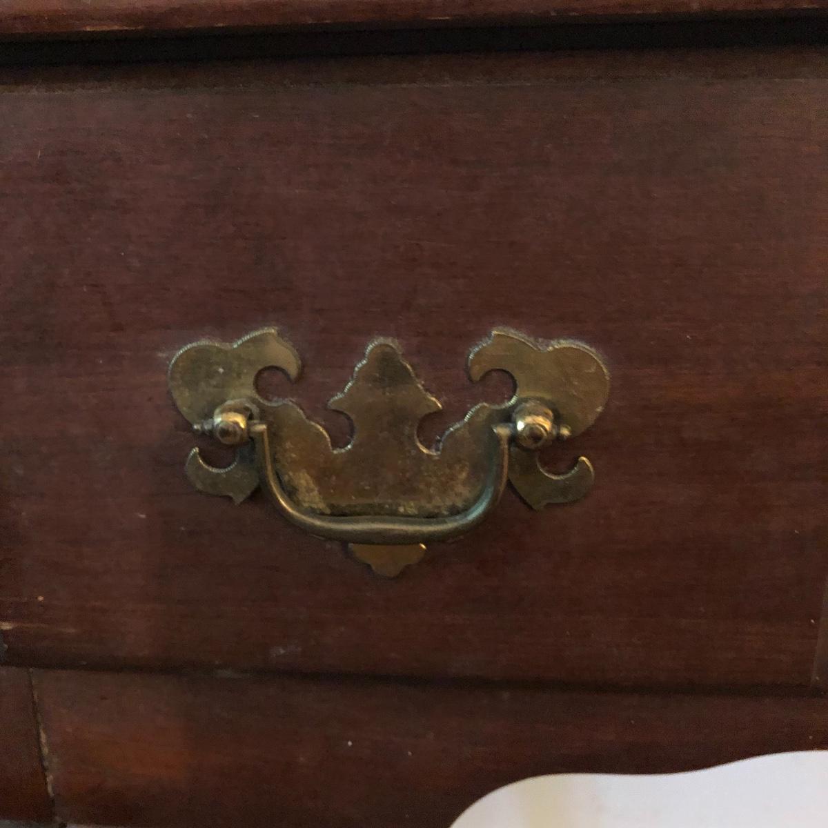 A nice vanity table with beveled mirror. Table has two dovetailed drawers and has beveled mirror inside the fold down top. Table has scratches and nicks, see pictures. Table measures 19.5” x 40.5” x 31”. No manufacturer’s mark is found on the table.