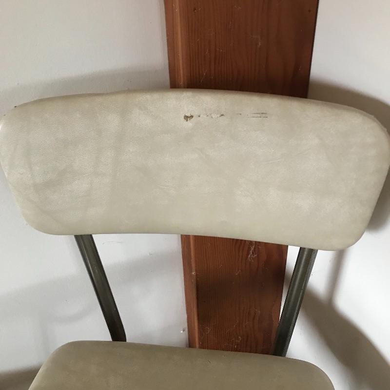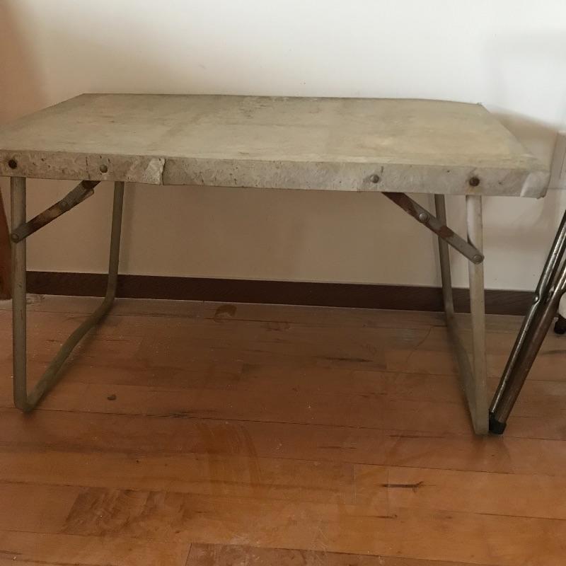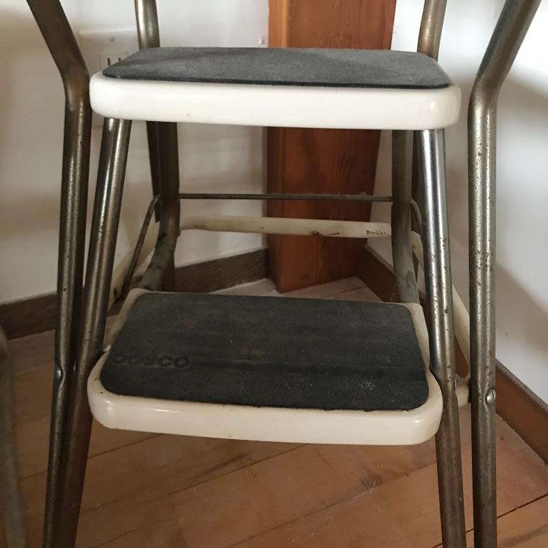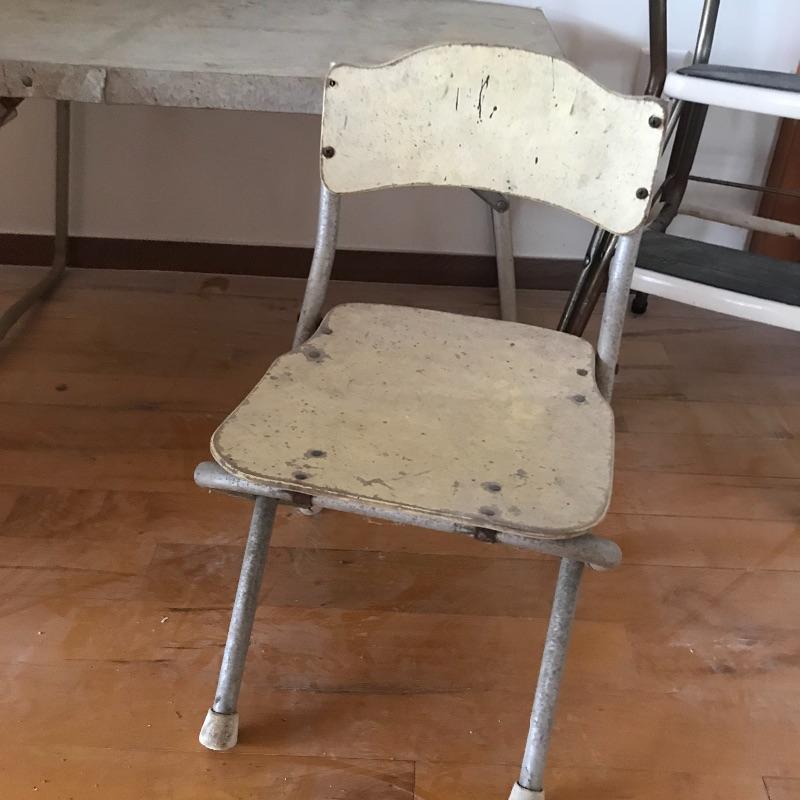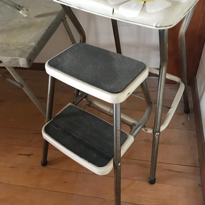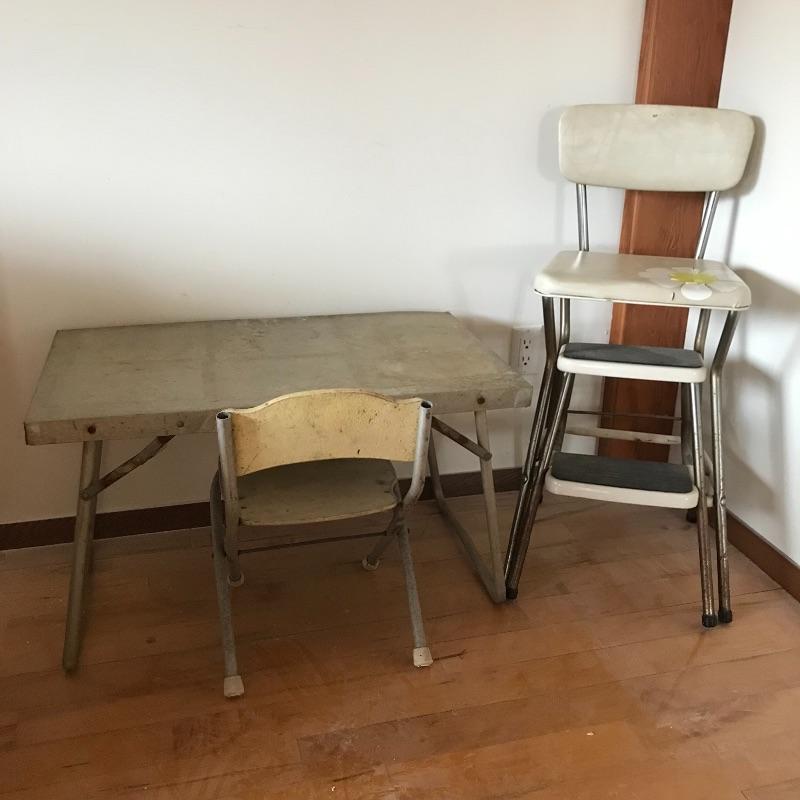 Lot includes small vintage children’s chair and table, plus a vintage Cosco kitchen stool with pull-out steps. All show signs of wear but are still sturdy and ready for use. See pics.T able is approx. 30”l x 18”w x 18”h. Small chair is approx. 12”l x 13”w x 21”h. Stool is approx. 15”l x 16”w x 34”h. Local pickup only.