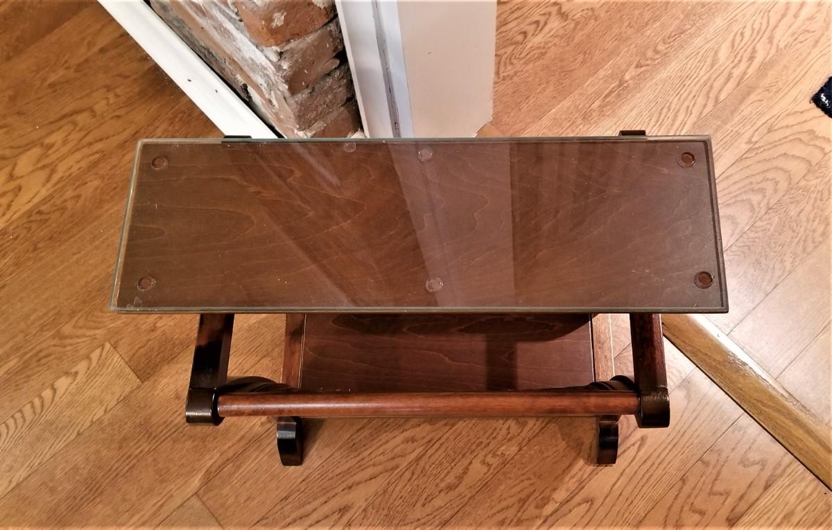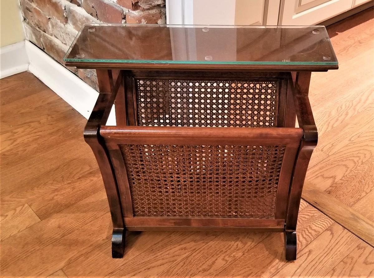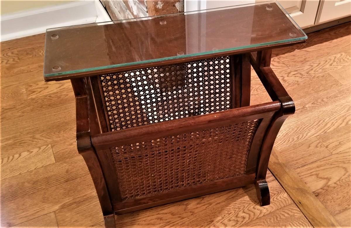 Mid Century colonial magazine stand/table combo with woven cane inserts. There is a piece of tempered glass cut to fit the top. Good condition. 18" tall, Measures 16" x 11". Sturdy.