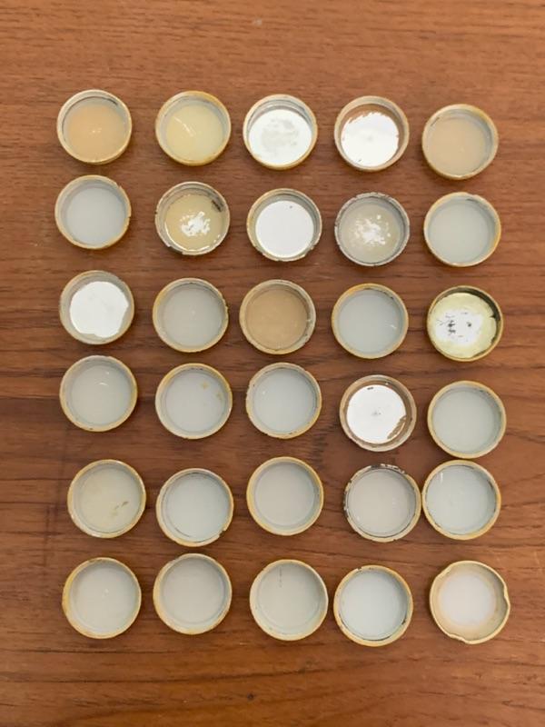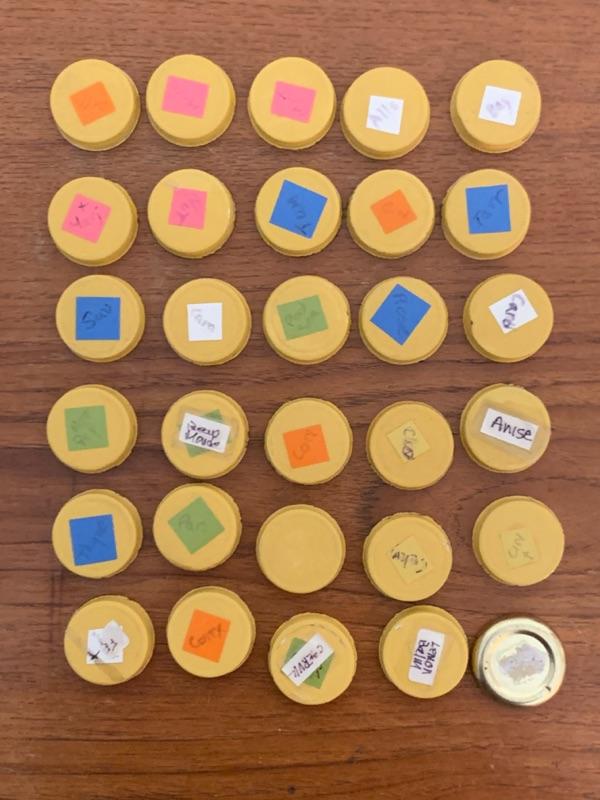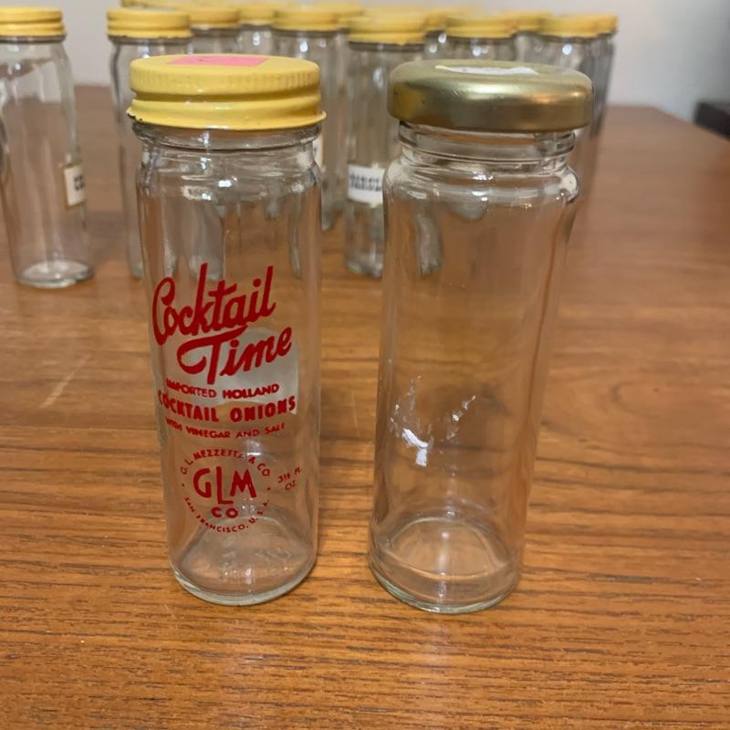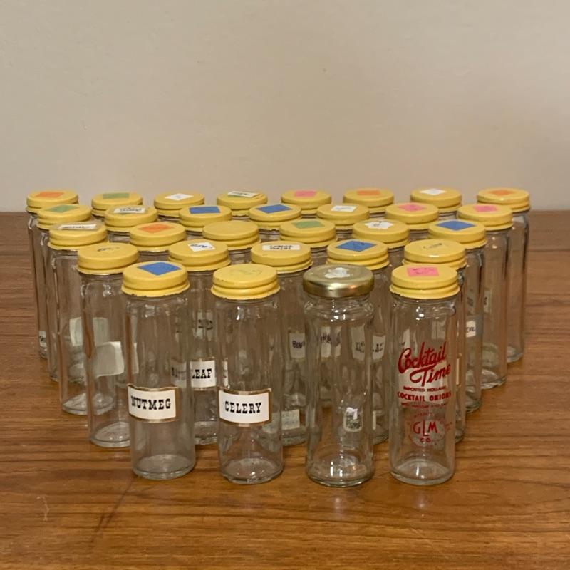 Glass is clear with no film or residue and most have identifying spice labels. Lids are pale yellow, screw on, with no dents, but do have varying degrees of age and identifying pieces of tape. Measures 5” tall with 1 1/4” diameter opening.