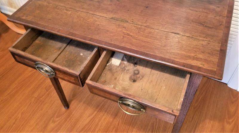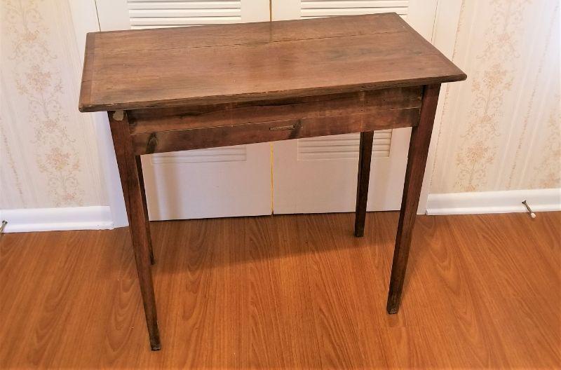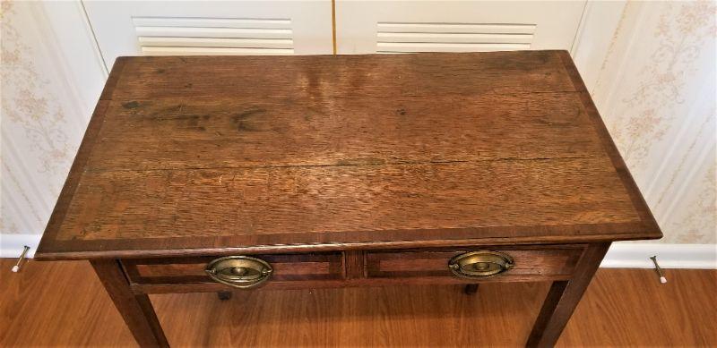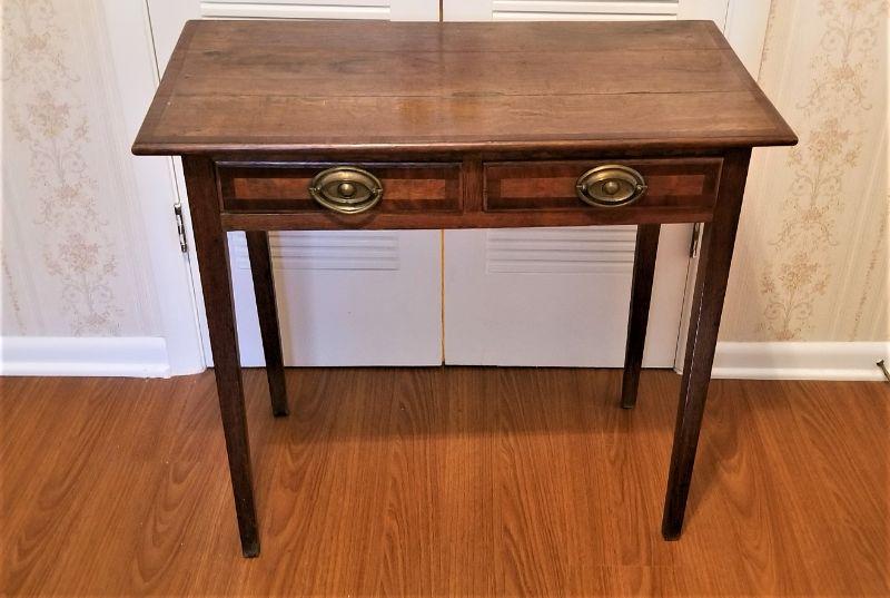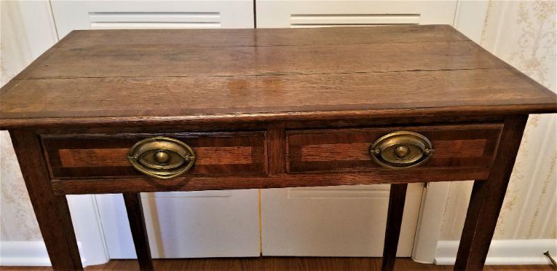 Cute little oak antique/vintage side table - 2 drawers. The pull on the hardware on one side is "bent" a little. Antique condition. Measures 31.5" wide, 16" deep, 28.5" tall.