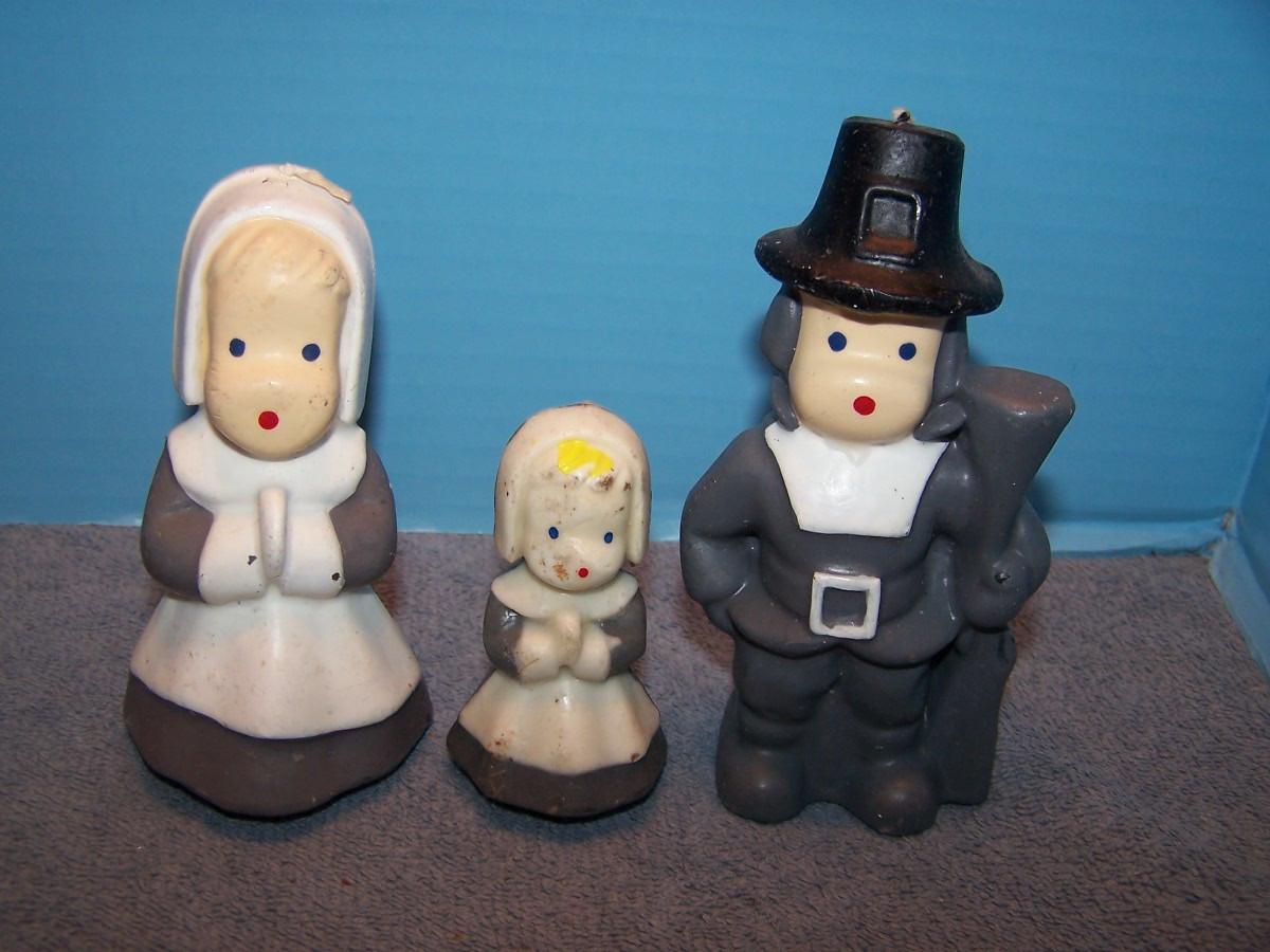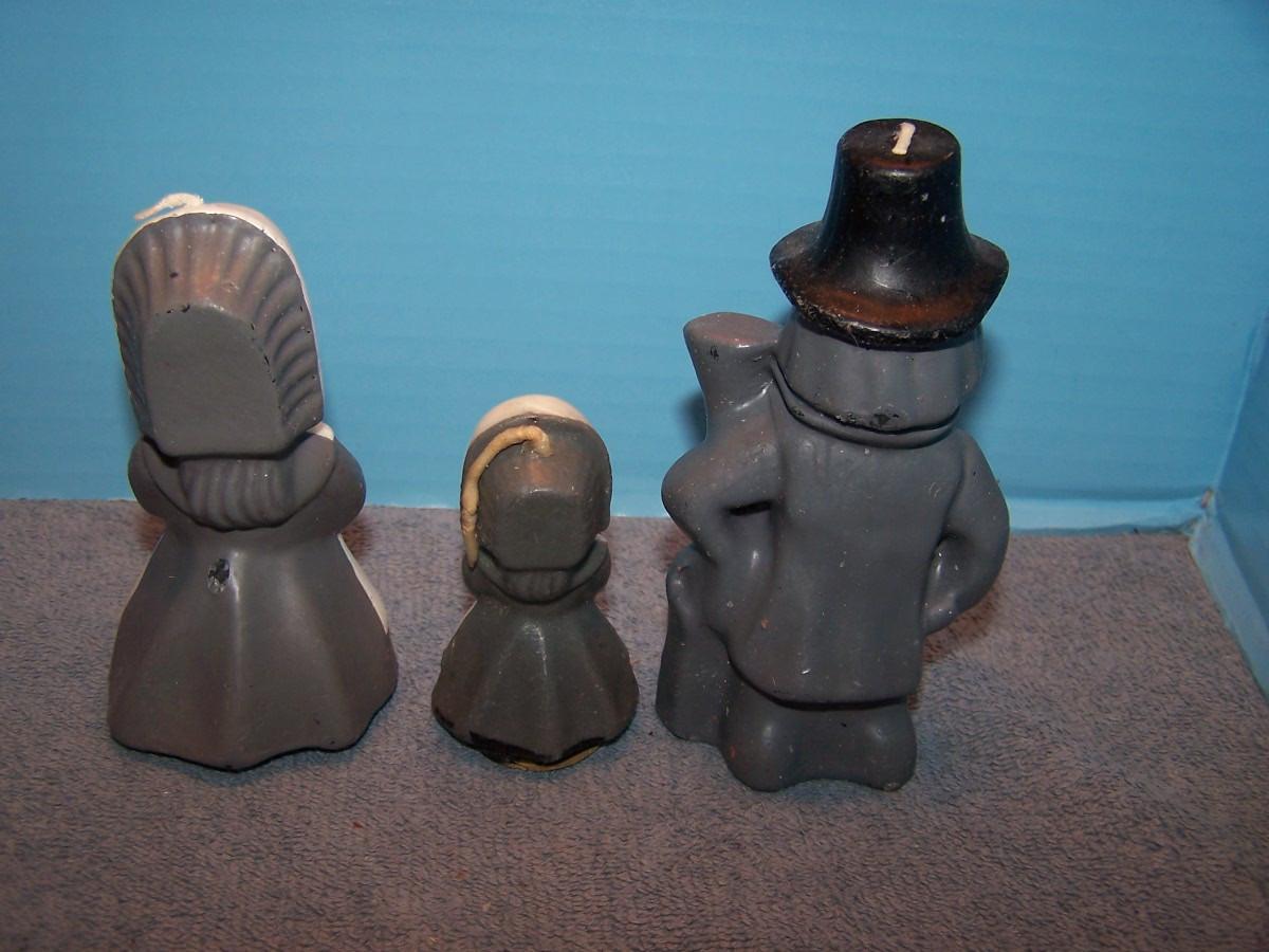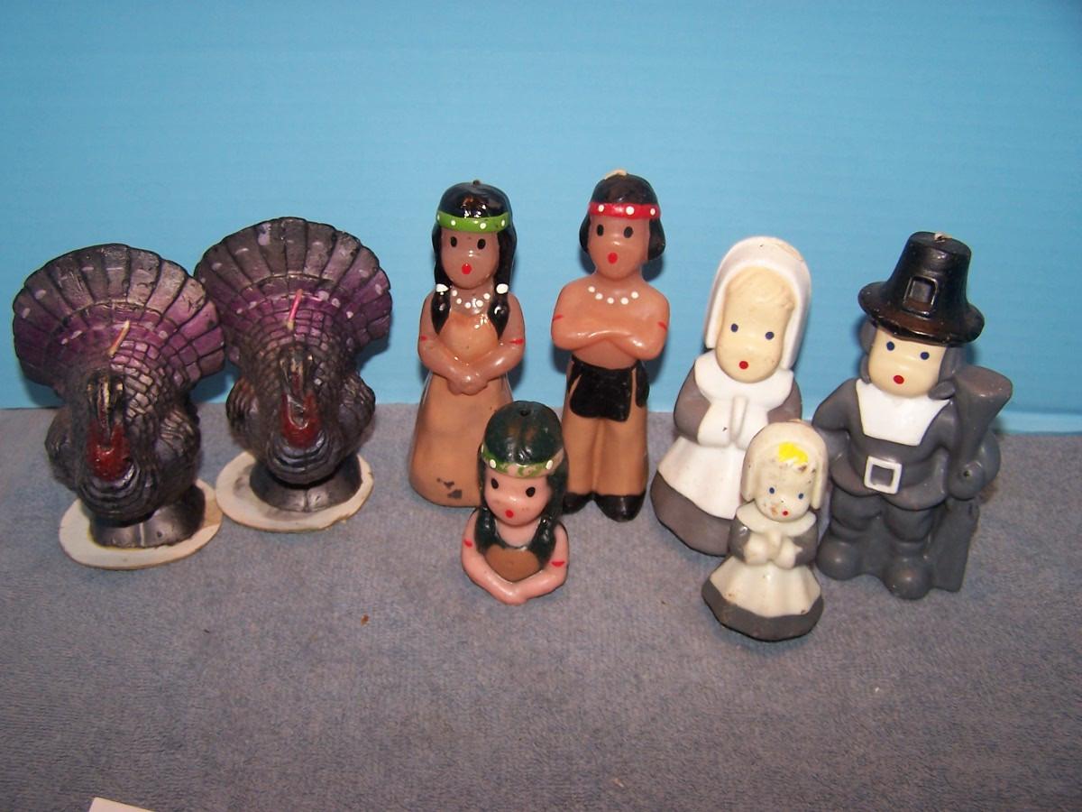 GREAT OLD CANDLES!!!! THE PILGRIMS ARE 5'' TALL. I THINK THE SMALL NATIVE AMERICAN GIRL IS REALLY JUST A HALF OF A LARGER ONE??? SOME WEAR....