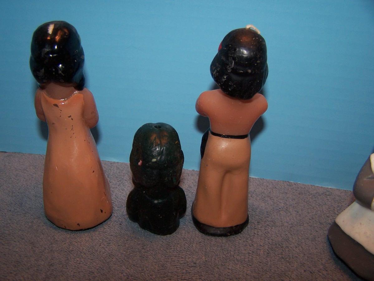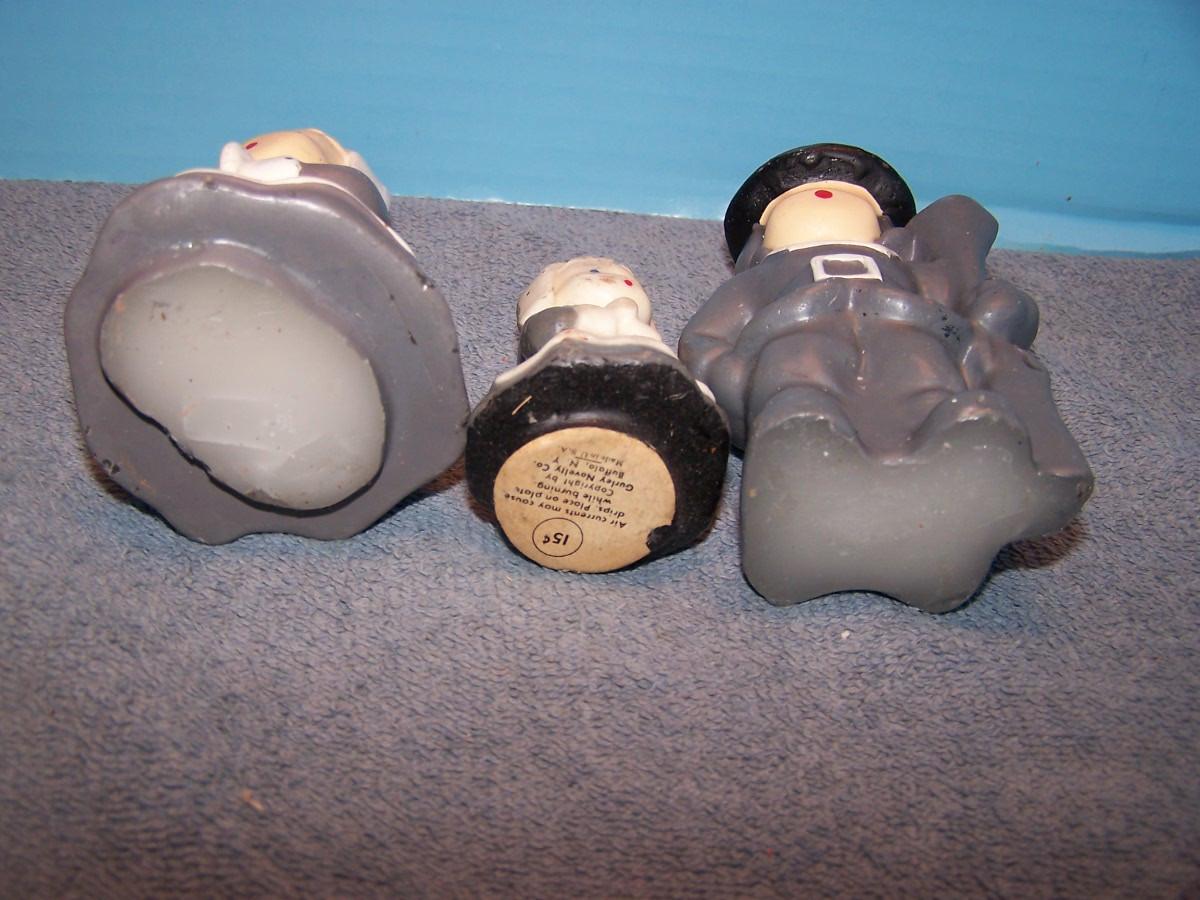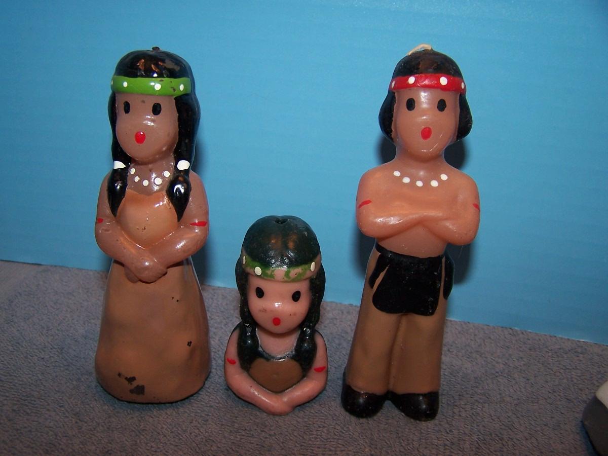 GREAT OLD CANDLES!!!! THE PILGRIMS ARE 5'' TALL. I THINK THE SMALL NATIVE AMERICAN GIRL IS REALLY JUST A HALF OF A LARGER ONE??? SOME WEAR....