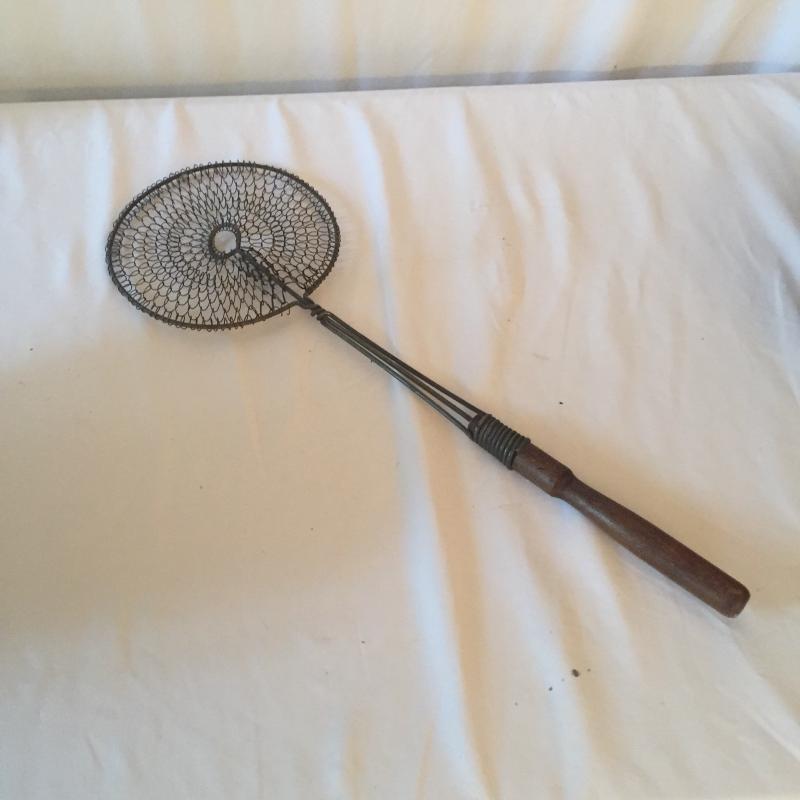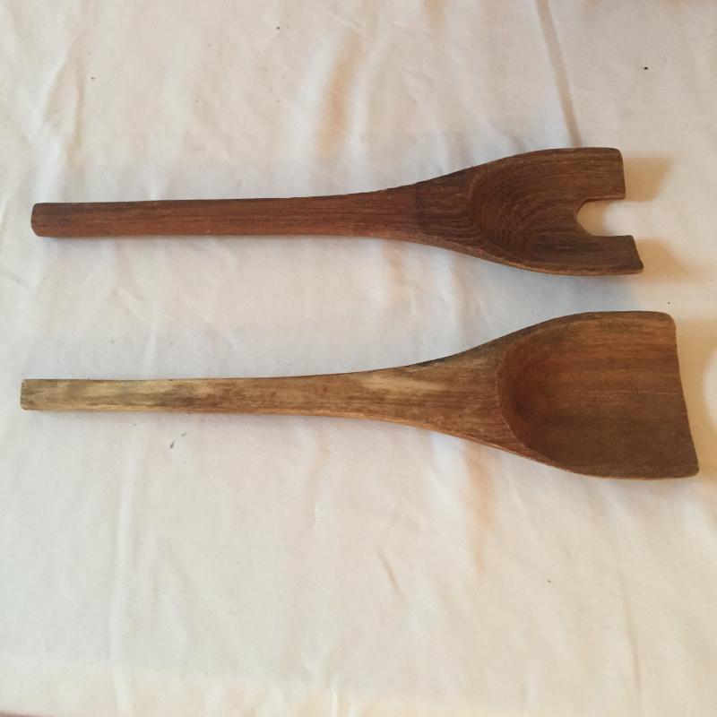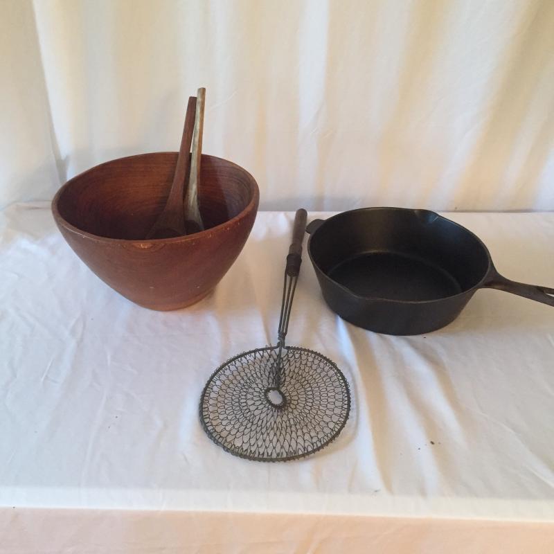 Unique wooden salad bowl with wooden serving utensils,Vollrath cast iron skillet and vintage rug beater.