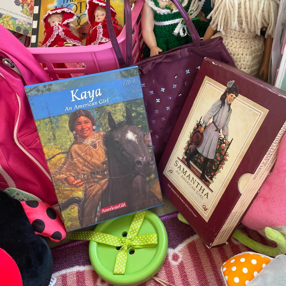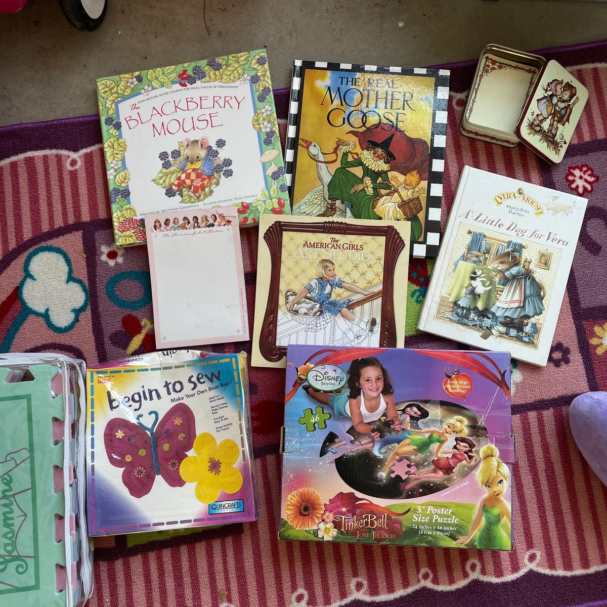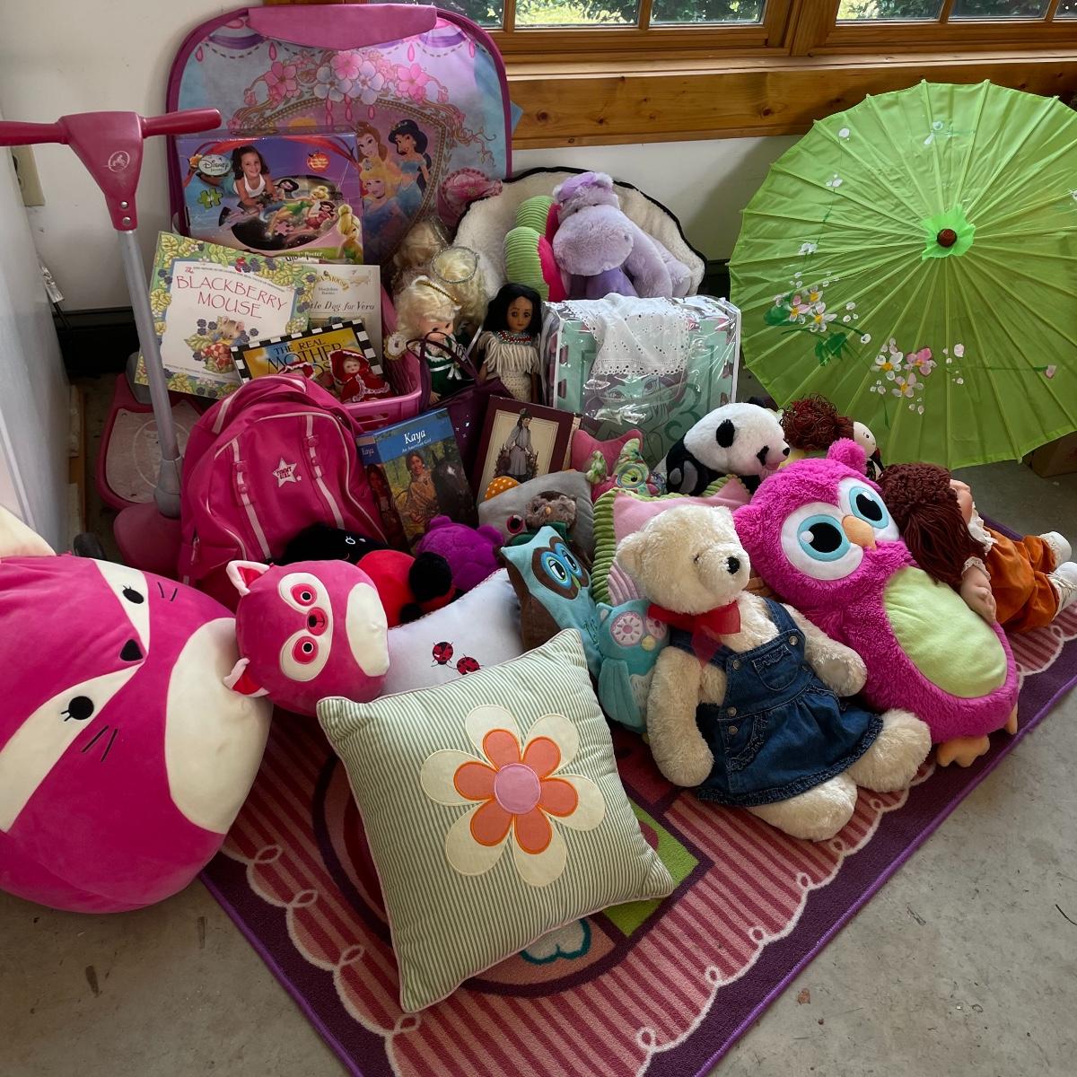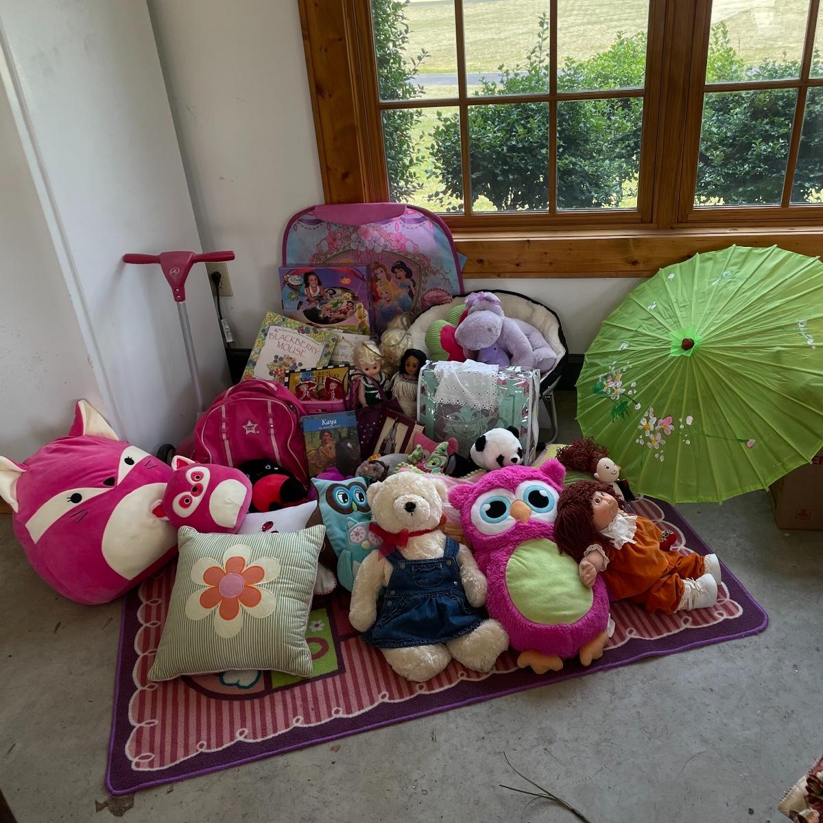 Here’s a great decorative addition to those littles who love pink! Lot features nine Disney Princess foam floor tiles and a lightweight cloth bean toss triangle frame (no bean bags) plus a sturdy plastic RadioFlyer scooter with three wheels, perfect for the beginner! A cute papason style chair, a 1985 Cabbage Patch doll with cabbage patch clothes (the waist band has lost its elasticity, but otherwise it’s in great shape), plenty of owls and lady bugs, bears and dolls. The three Angel dolls and the Native American are plastic and have stands to keep them upright. The smaller two angels with red dresses have porcelain faces mixes with cloth bodies and plastic shoes. Two sets of American Girl Doll books (Kaya is missing book #1) and an adorable Hop Scotch rug that will keep everyone playing on the rainiest days with a hand painted parasol for sun protection! Rug measures approximately 57” x 31.25”. See images for more information. Local pick up only.