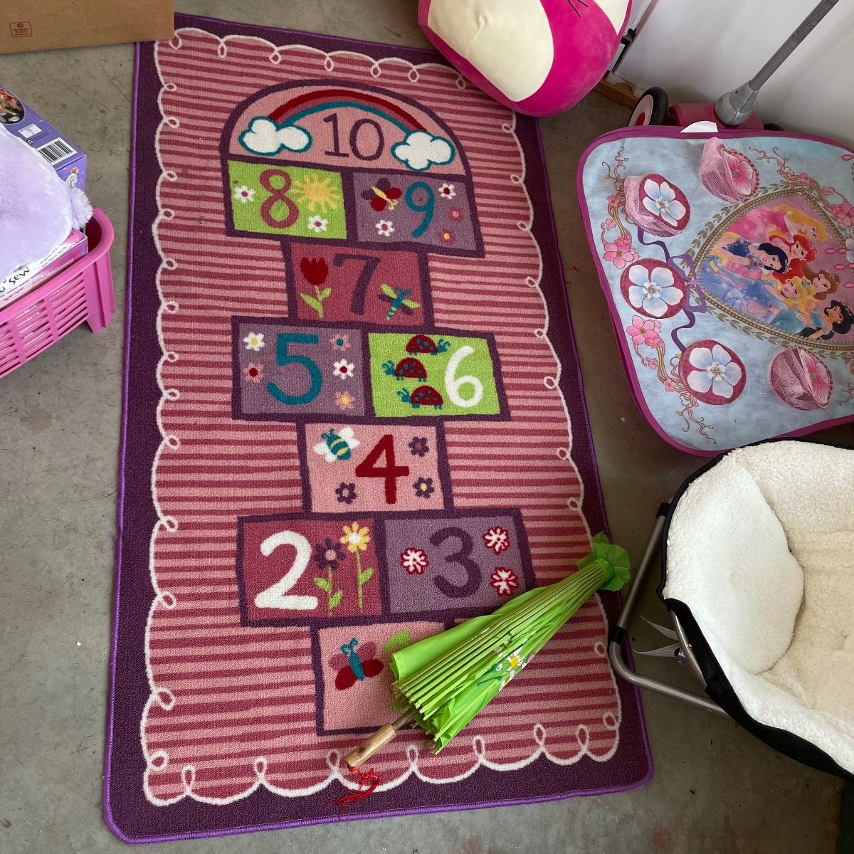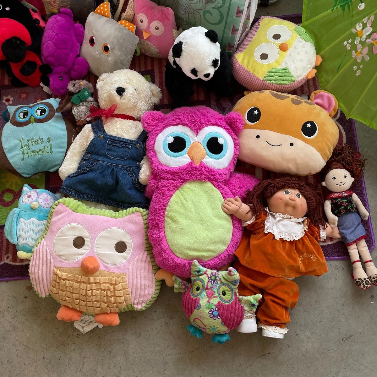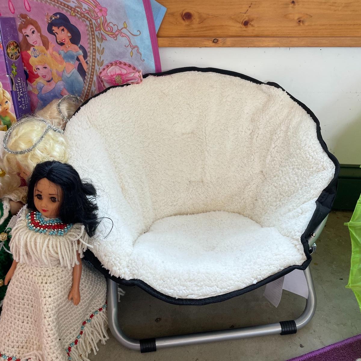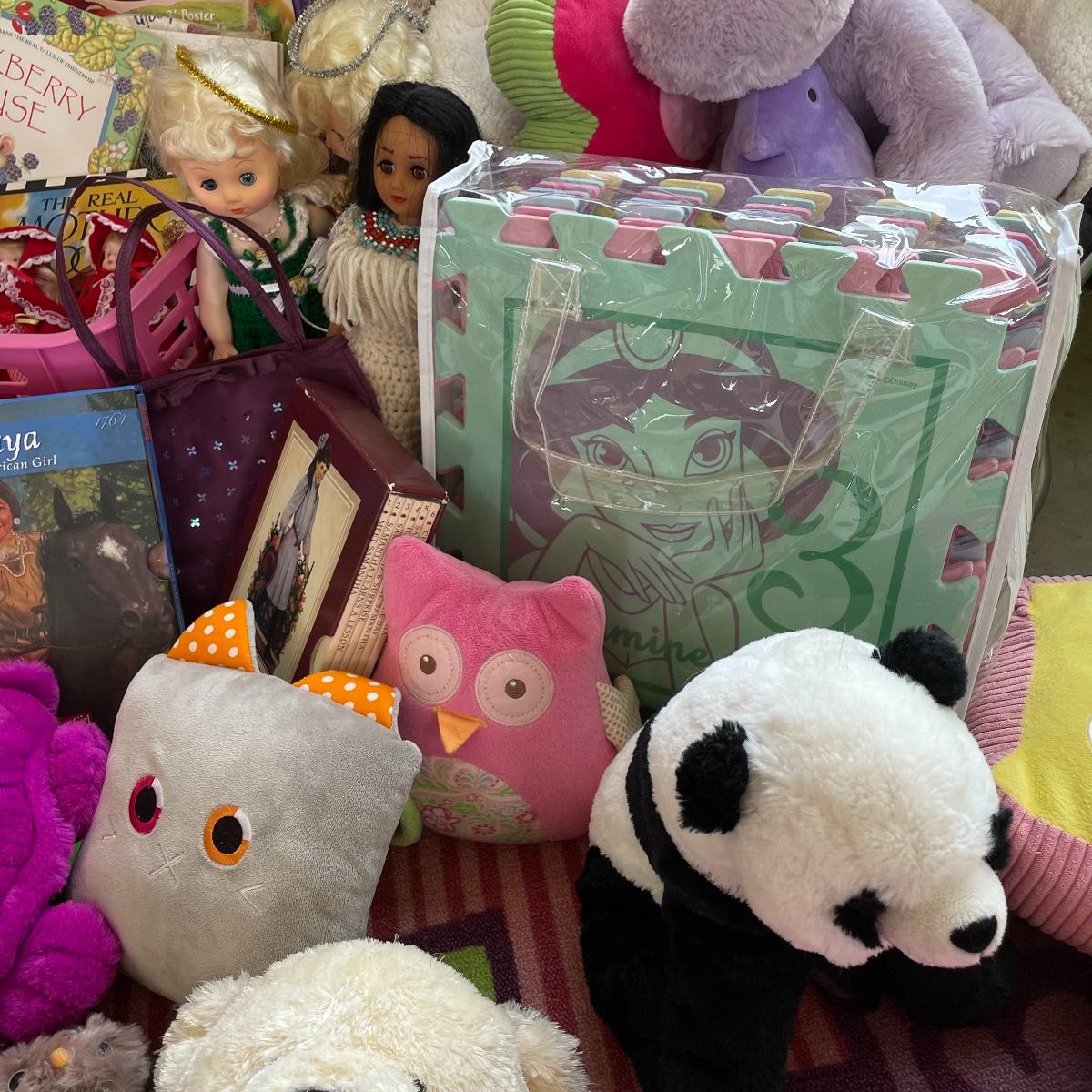 Here’s a great decorative addition to those littles who love pink! Lot features nine Disney Princess foam floor tiles and a lightweight cloth bean toss triangle frame (no bean bags) plus a sturdy plastic RadioFlyer scooter with three wheels, perfect for the beginner! A cute papason style chair, a 1985 Cabbage Patch doll with cabbage patch clothes (the waist band has lost its elasticity, but otherwise it’s in great shape), plenty of owls and lady bugs, bears and dolls. The three Angel dolls and the Native American are plastic and have stands to keep them upright. The smaller two angels with red dresses have porcelain faces mixes with cloth bodies and plastic shoes. Two sets of American Girl Doll books (Kaya is missing book #1) and an adorable Hop Scotch rug that will keep everyone playing on the rainiest days with a hand painted parasol for sun protection! Rug measures approximately 57” x 31.25”. See images for more information. Local pick up only.