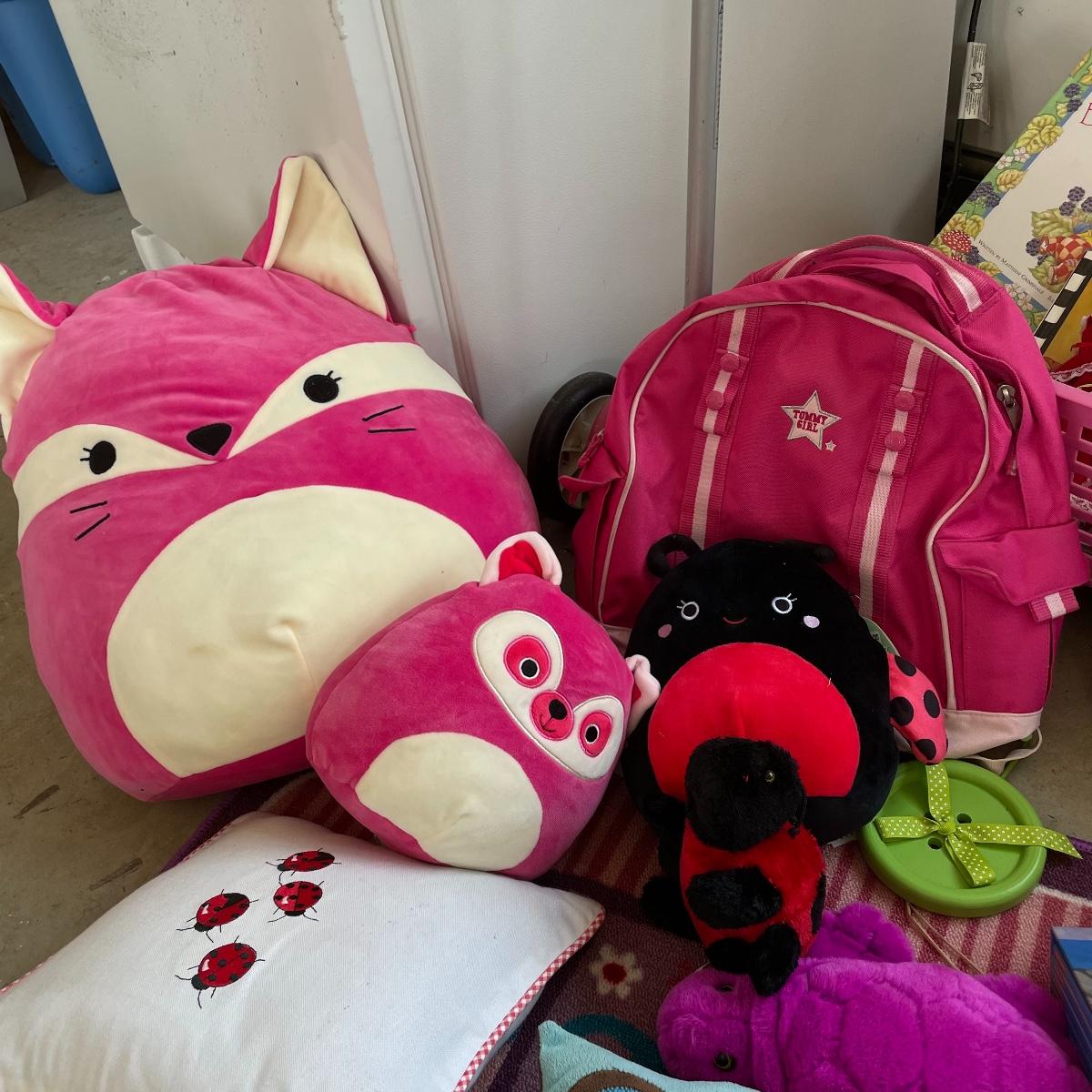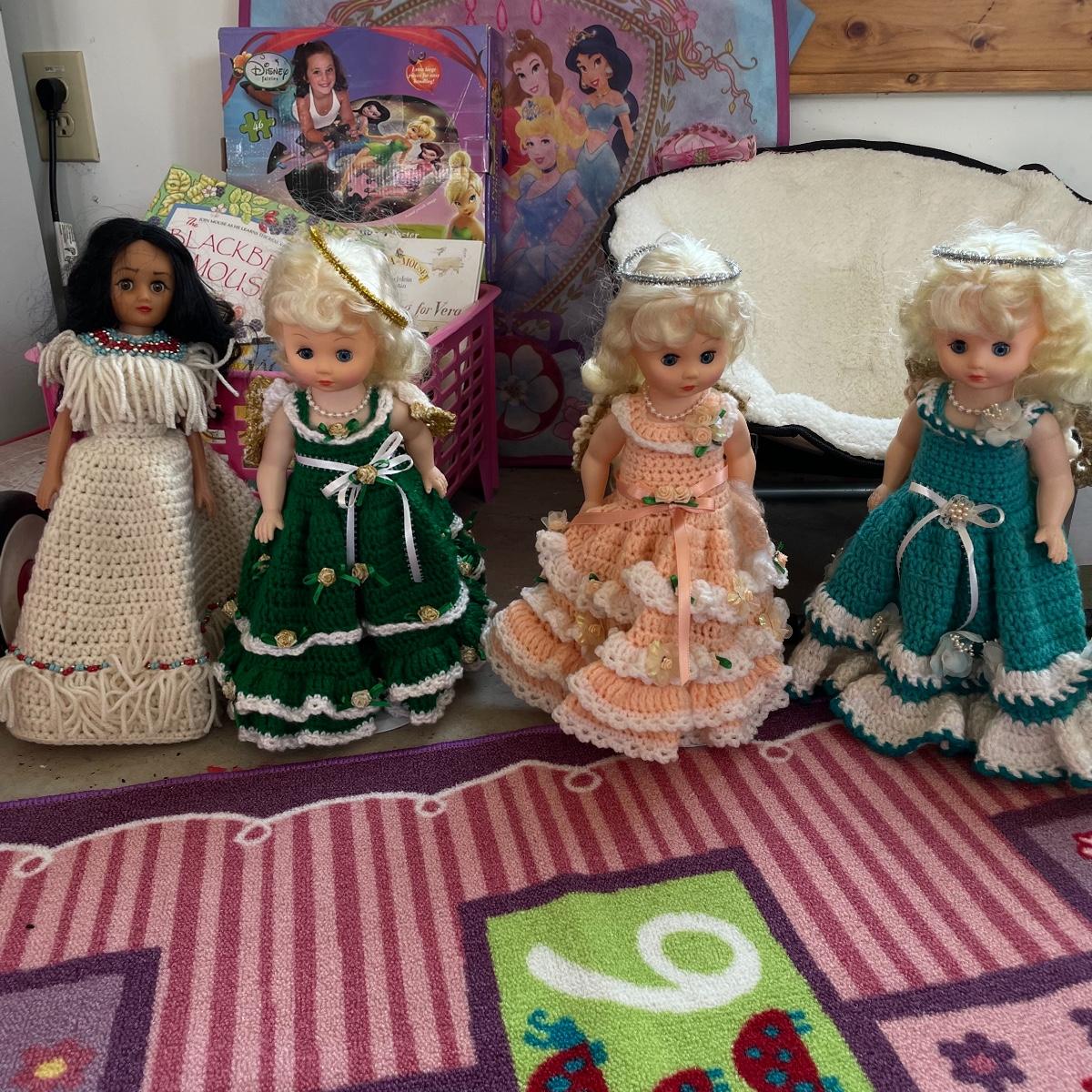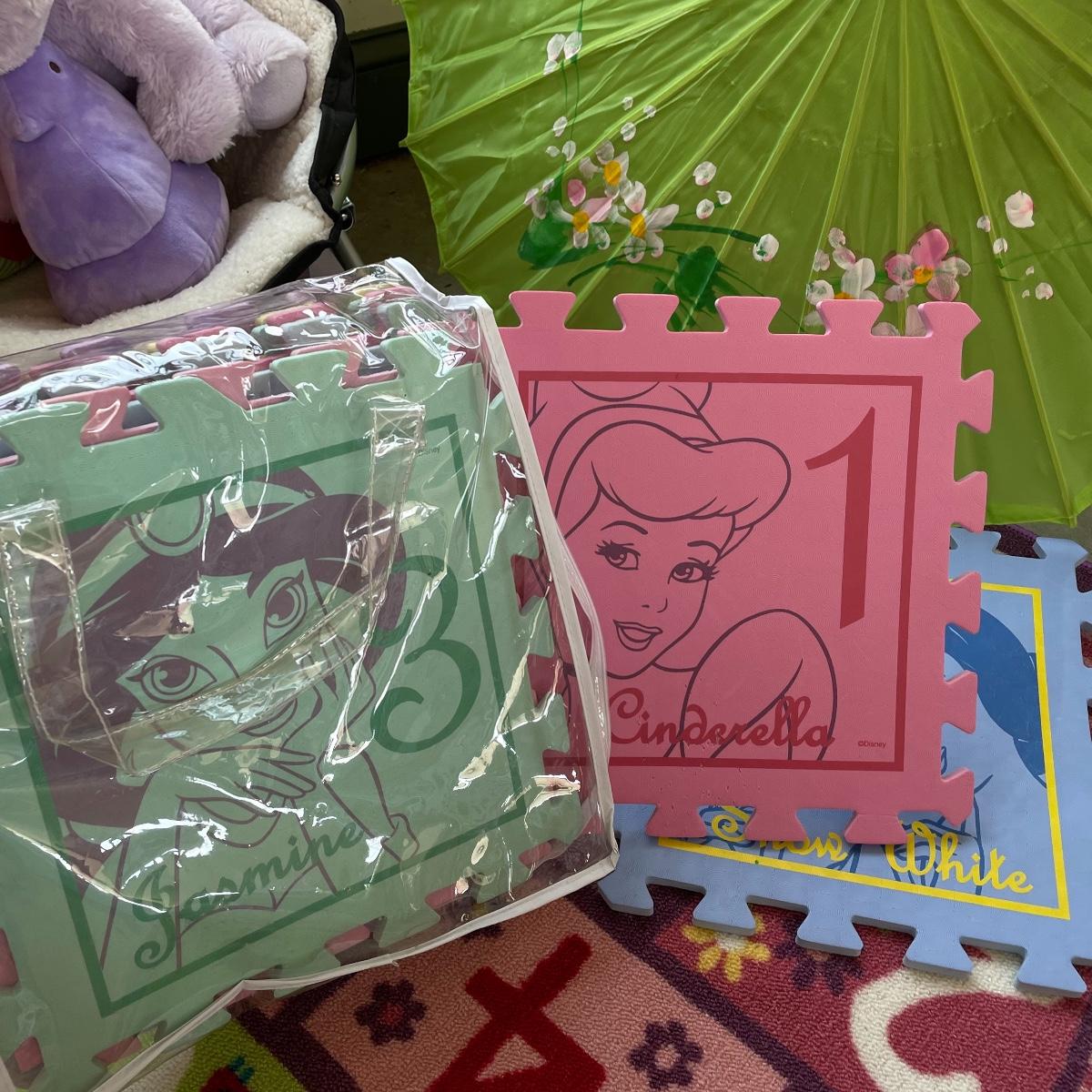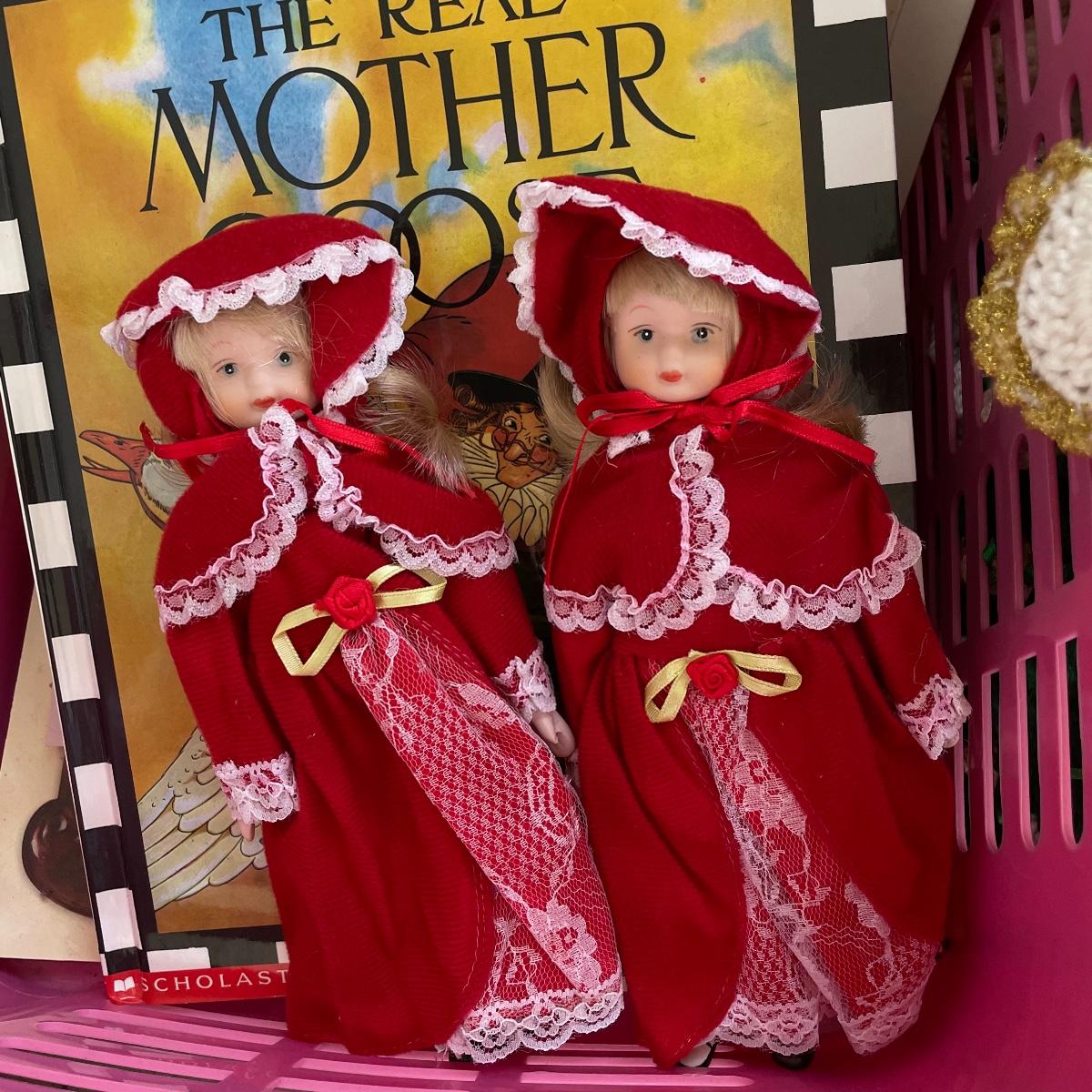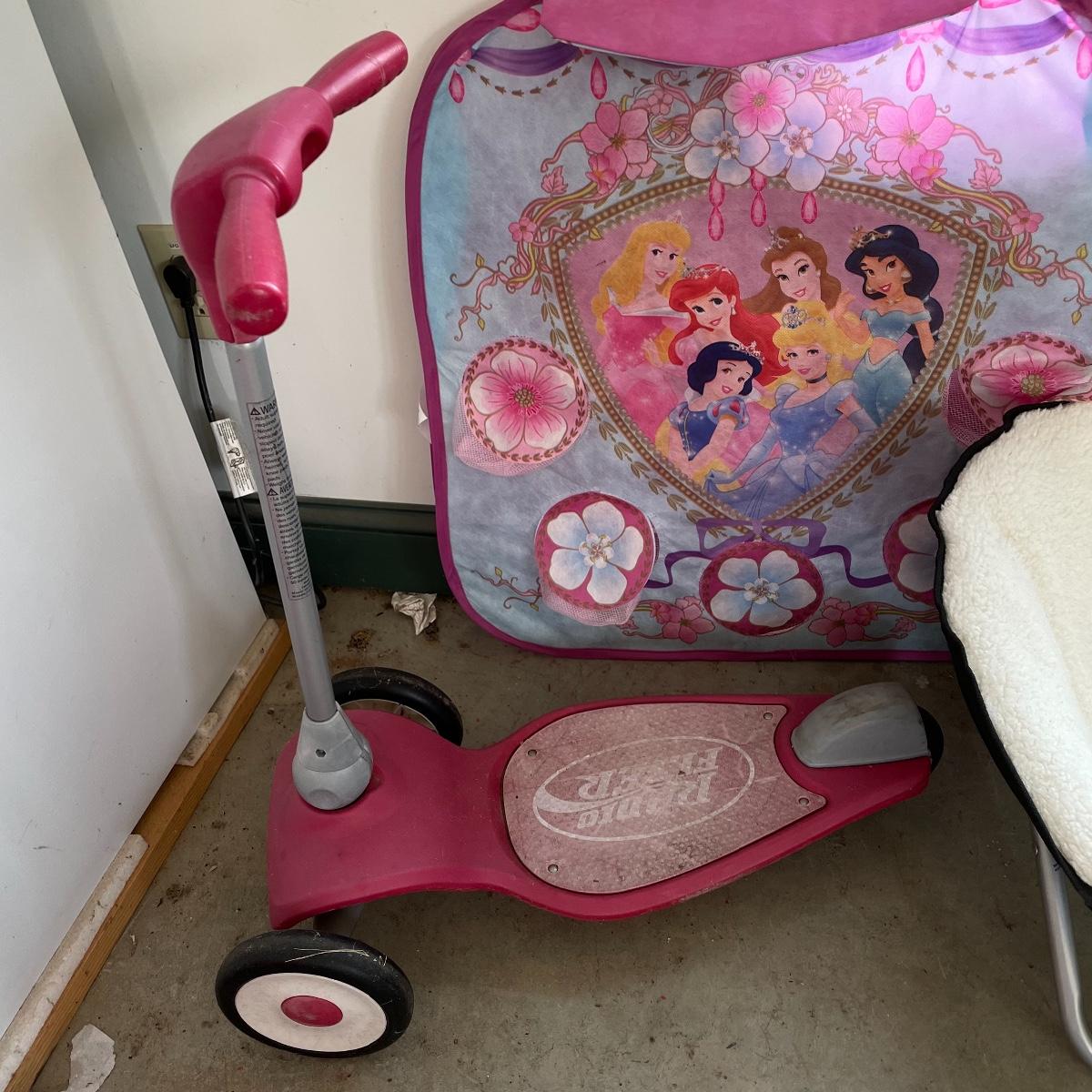 Here’s a great decorative addition to those littles who love pink! Lot features nine Disney Princess foam floor tiles and a lightweight cloth bean toss triangle frame (no bean bags) plus a sturdy plastic RadioFlyer scooter with three wheels, perfect for the beginner! A cute papason style chair, a 1985 Cabbage Patch doll with cabbage patch clothes (the waist band has lost its elasticity, but otherwise it’s in great shape), plenty of owls and lady bugs, bears and dolls. The three Angel dolls and the Native American are plastic and have stands to keep them upright. The smaller two angels with red dresses have porcelain faces mixes with cloth bodies and plastic shoes. Two sets of American Girl Doll books (Kaya is missing book #1) and an adorable Hop Scotch rug that will keep everyone playing on the rainiest days with a hand painted parasol for sun protection! Rug measures approximately 57” x 31.25”. See images for more information. Local pick up only.
