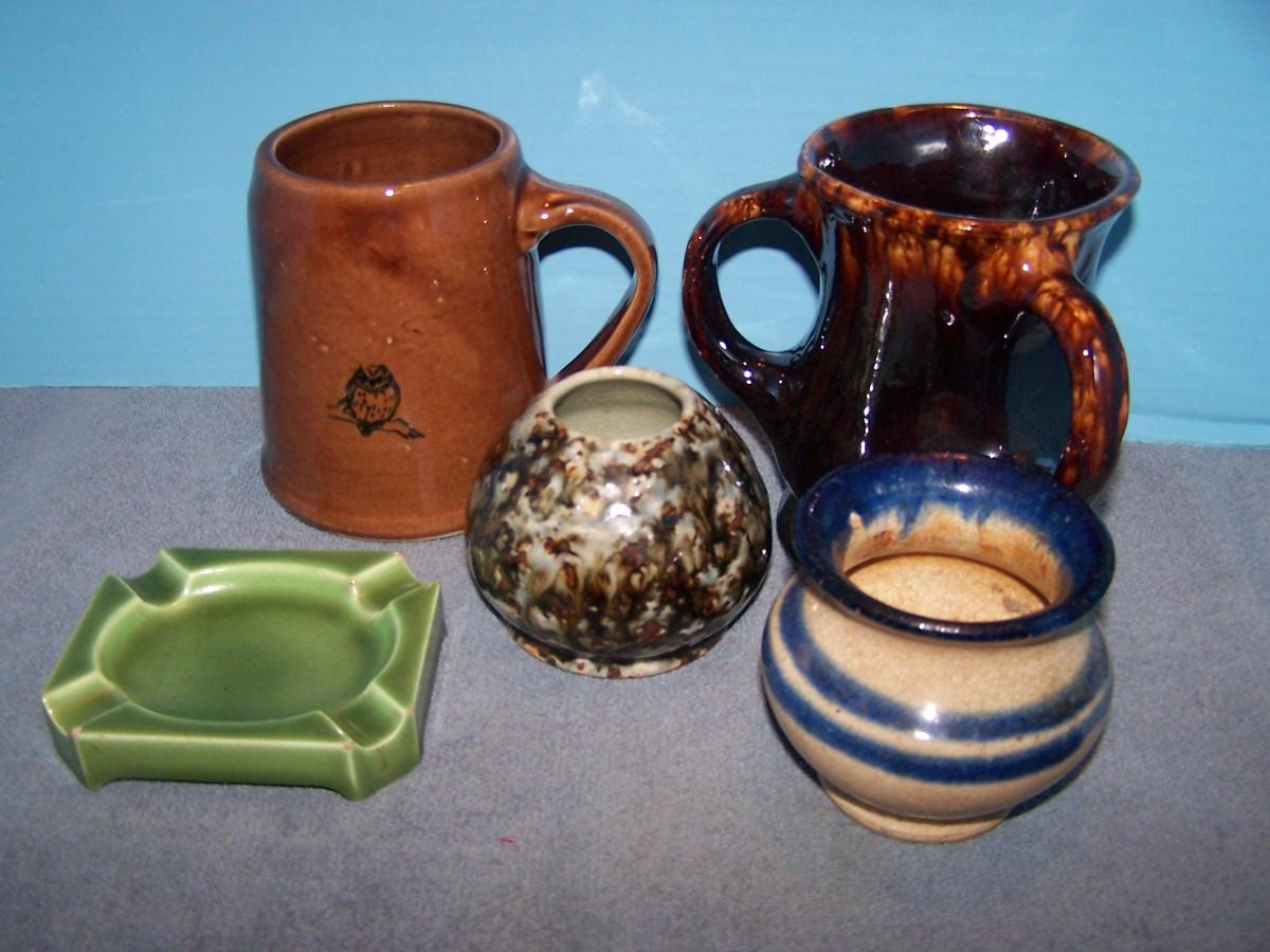 5 PIECES OF WONDERFUL VINTAGE ART POTTERY STONEWARE!!! SEVERAL ARE MARKED... MUG--5'' TALL... THERE ARE SOME CHIPS/CRAZING/WEAR, MOSTLY IN GOOD CONDITION...