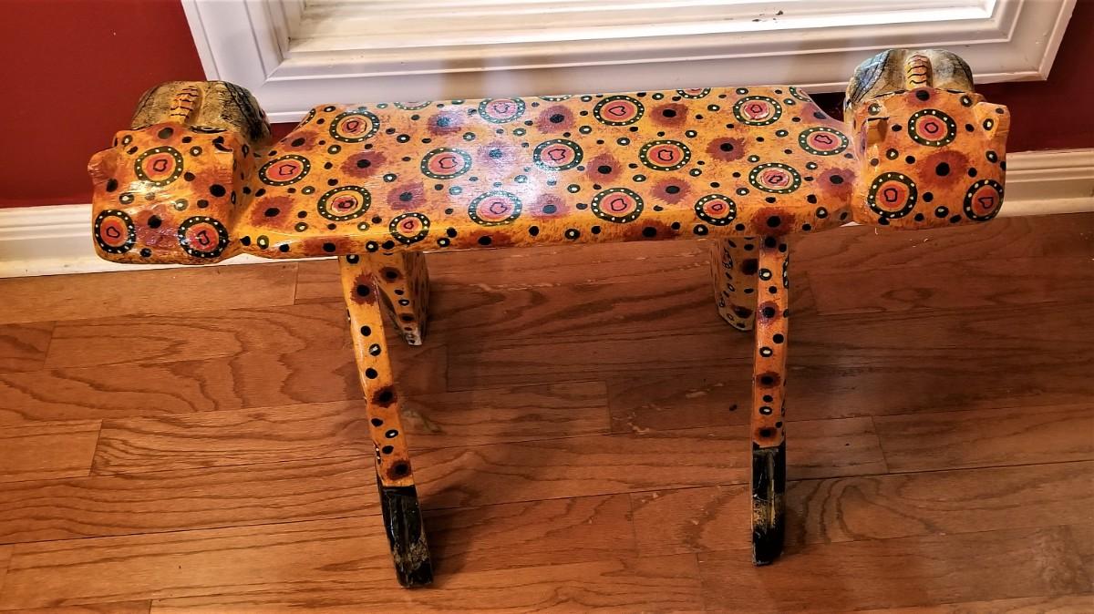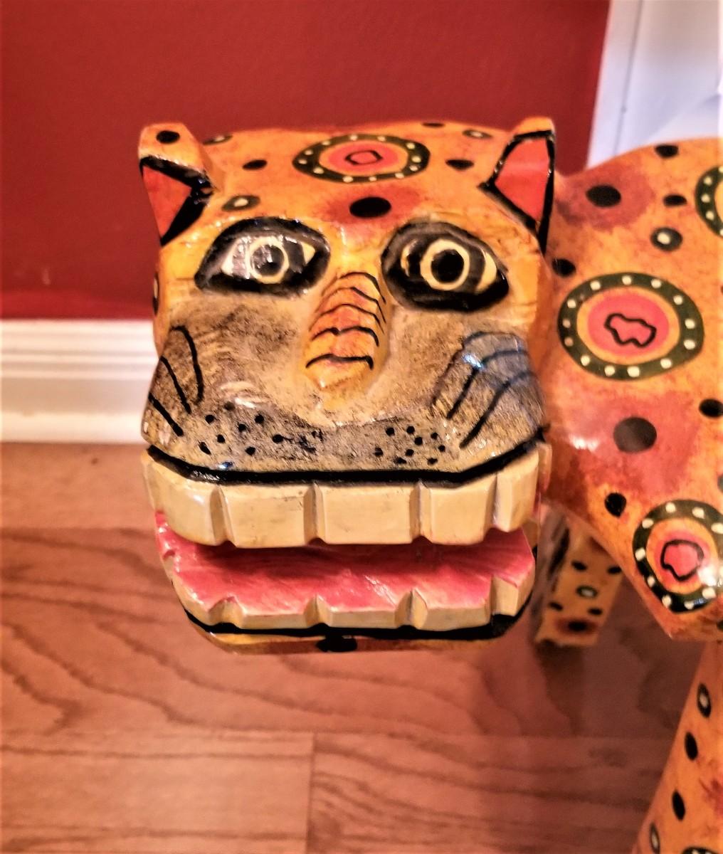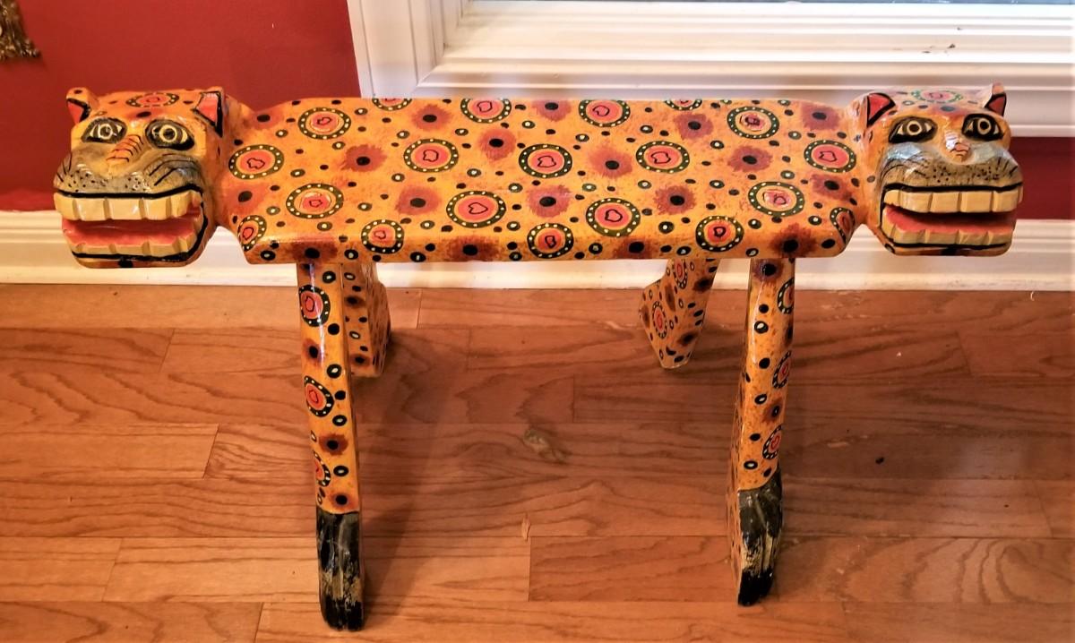 Way cool art piece - hand carved bench/chair in the form of a jaguar - probably Mexican - 15.5" tall, 3 feet across. Old repair to one leg.