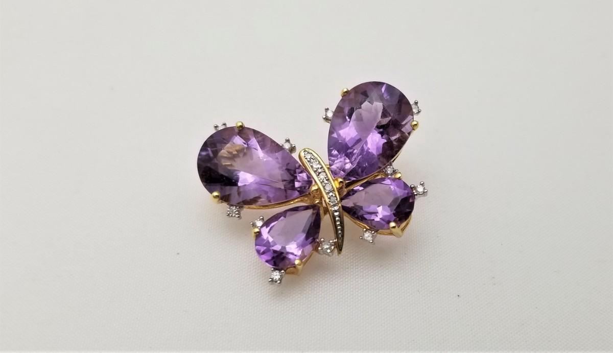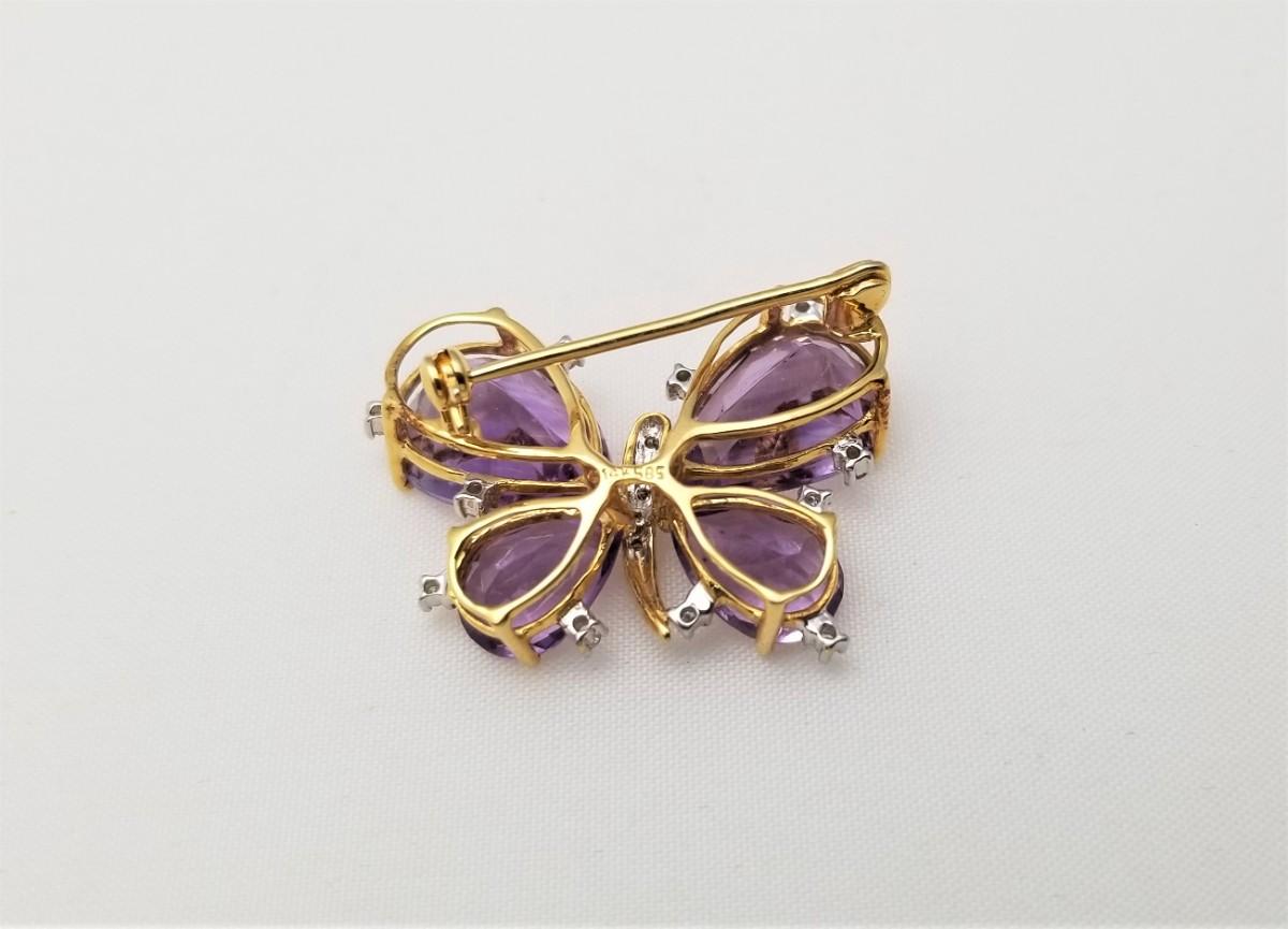 Lot #350 14kt Yellow Gold, Amethyst, and Diamond Butterfly brooch