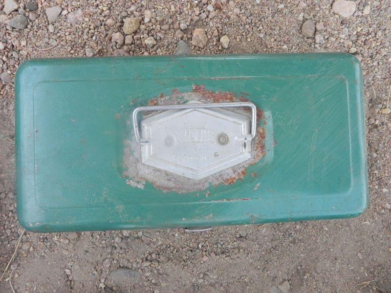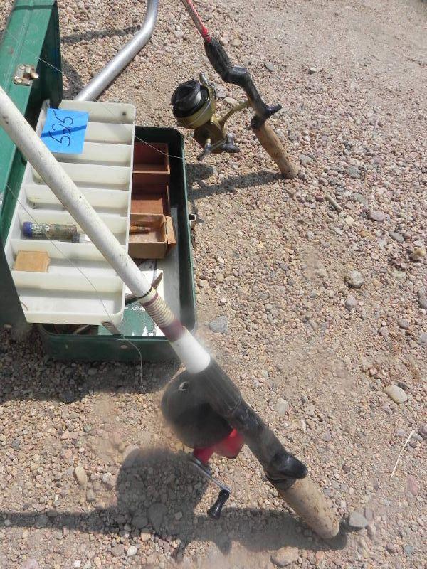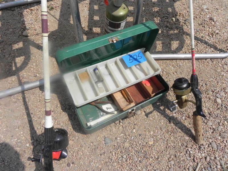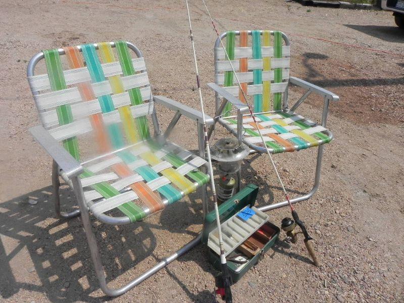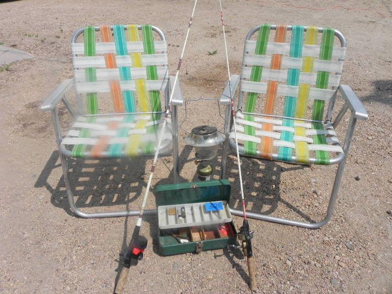 2 FOLDING LAWN CHAIRS, METAL TACKLE BOX AND TAKLE, FISHING POLES, AND SMALL PROPANE HEATER