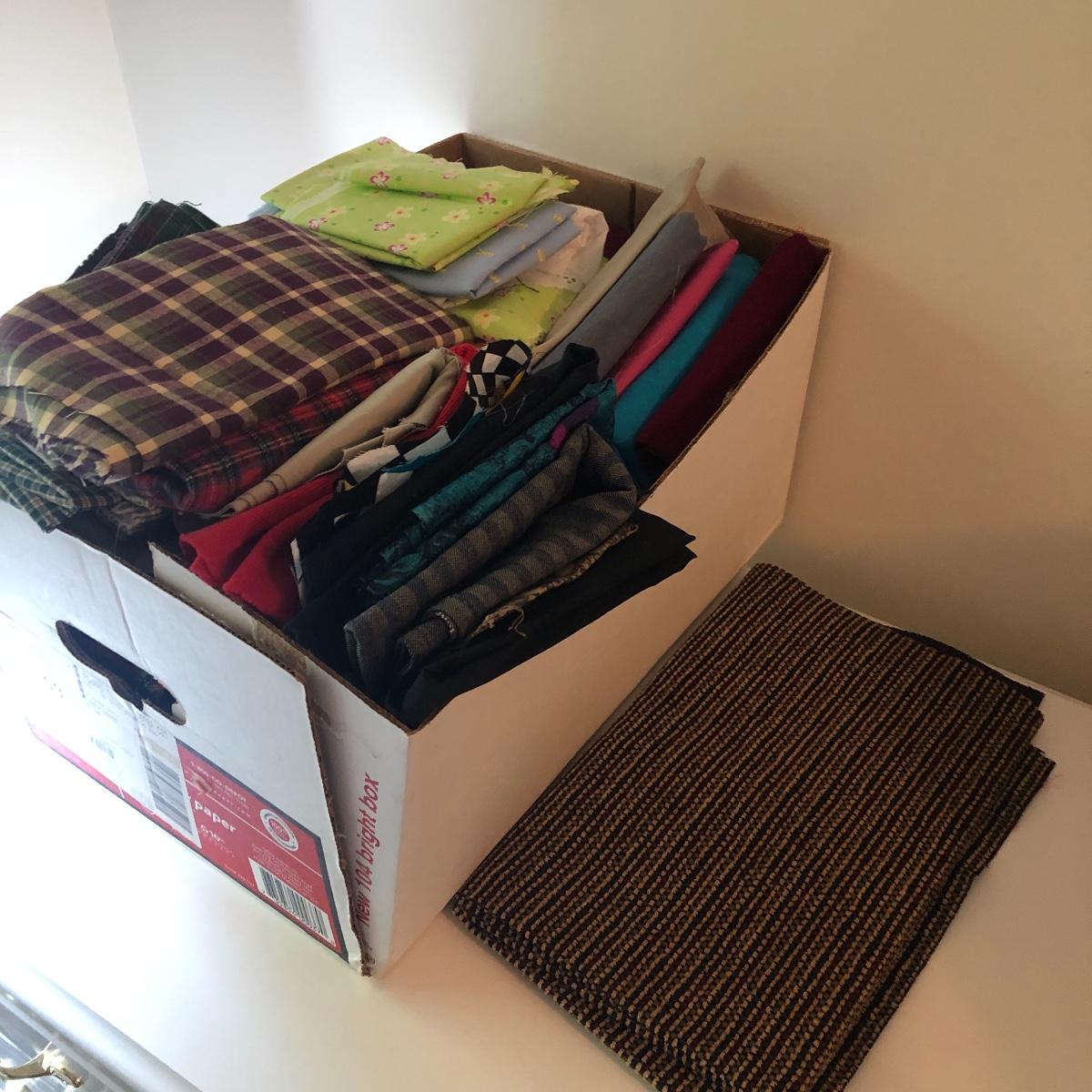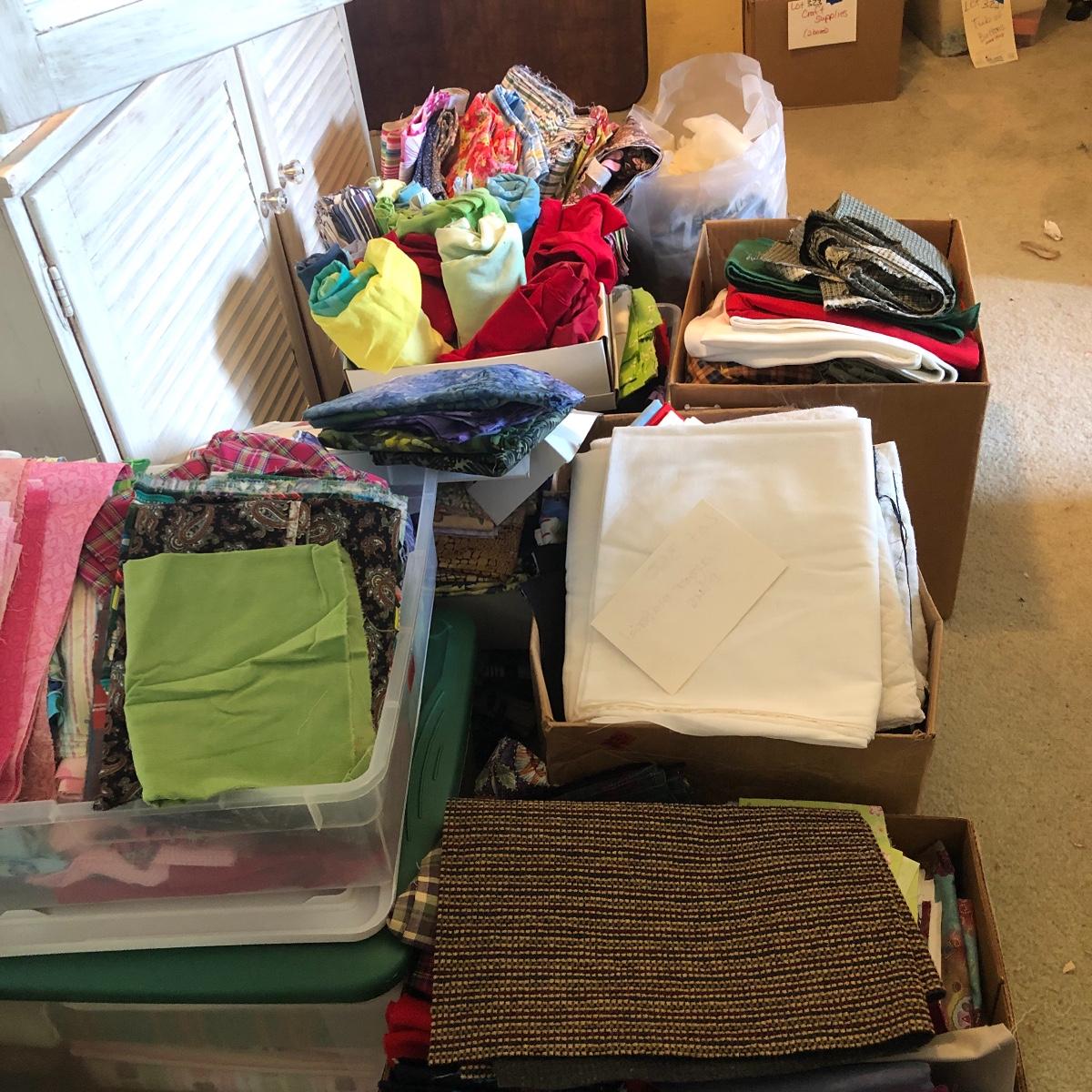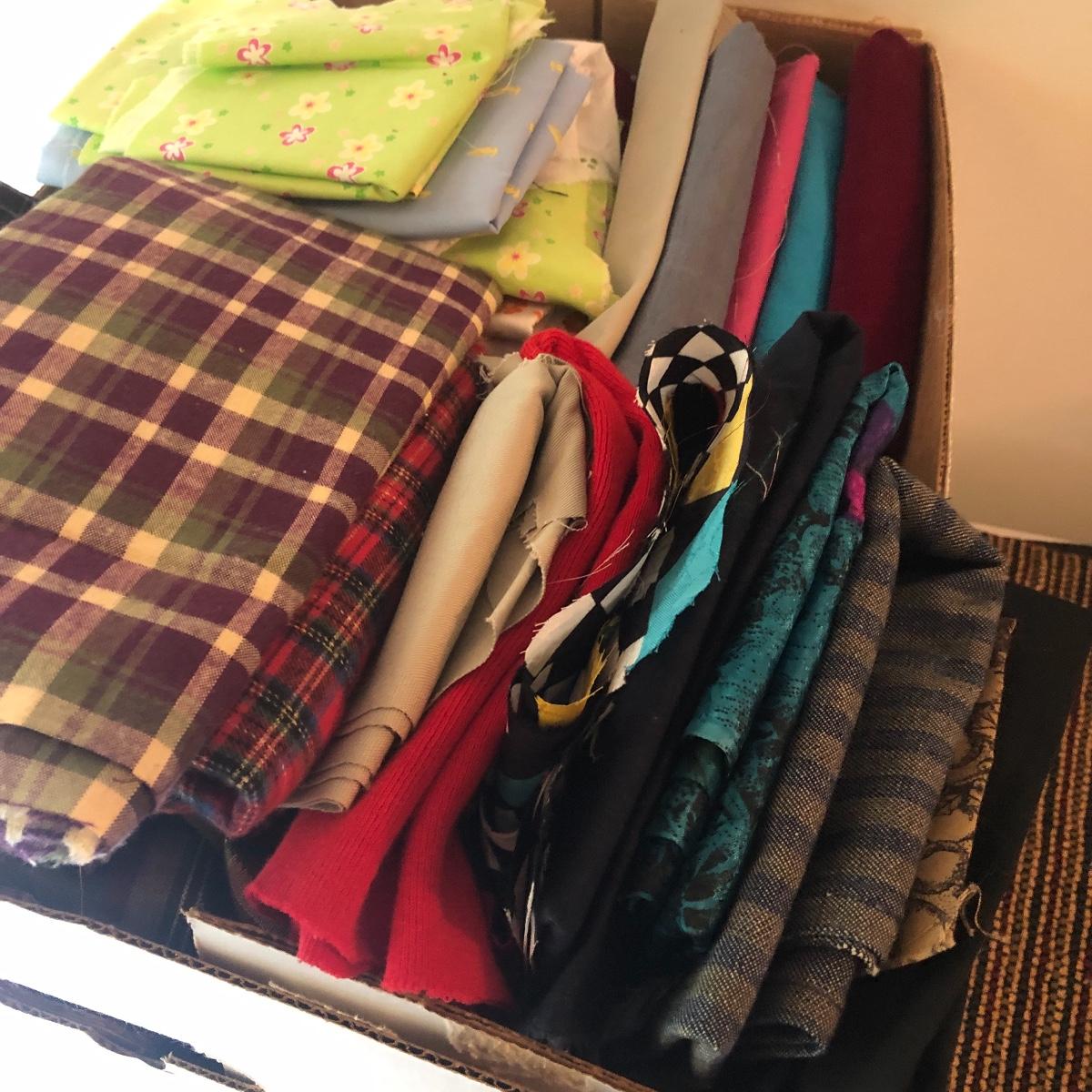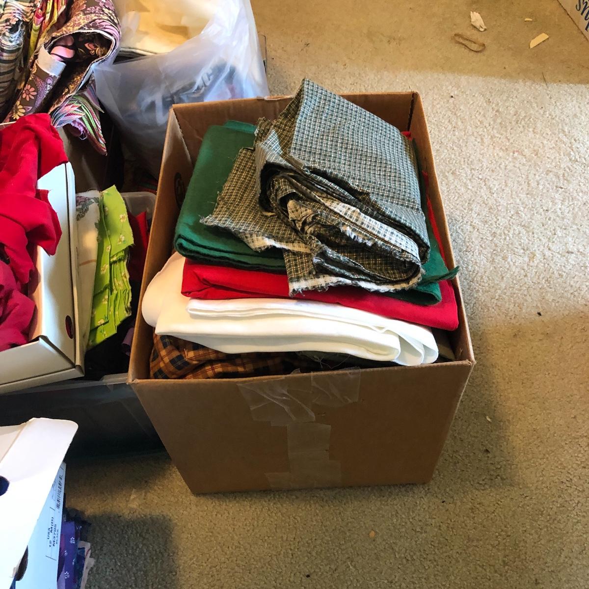 Wow! What a lot of material! Never buy fabric again from a retail store! Most of the material appears to be cut from bolts of fabric. The Fabric in this lot includes corduroy, flannel, felt, cotton and comes in plaids, batiks, florals, striped, plain, polka-dots and more! There are seven boxes and four plastic containers of material! Local pick up only.