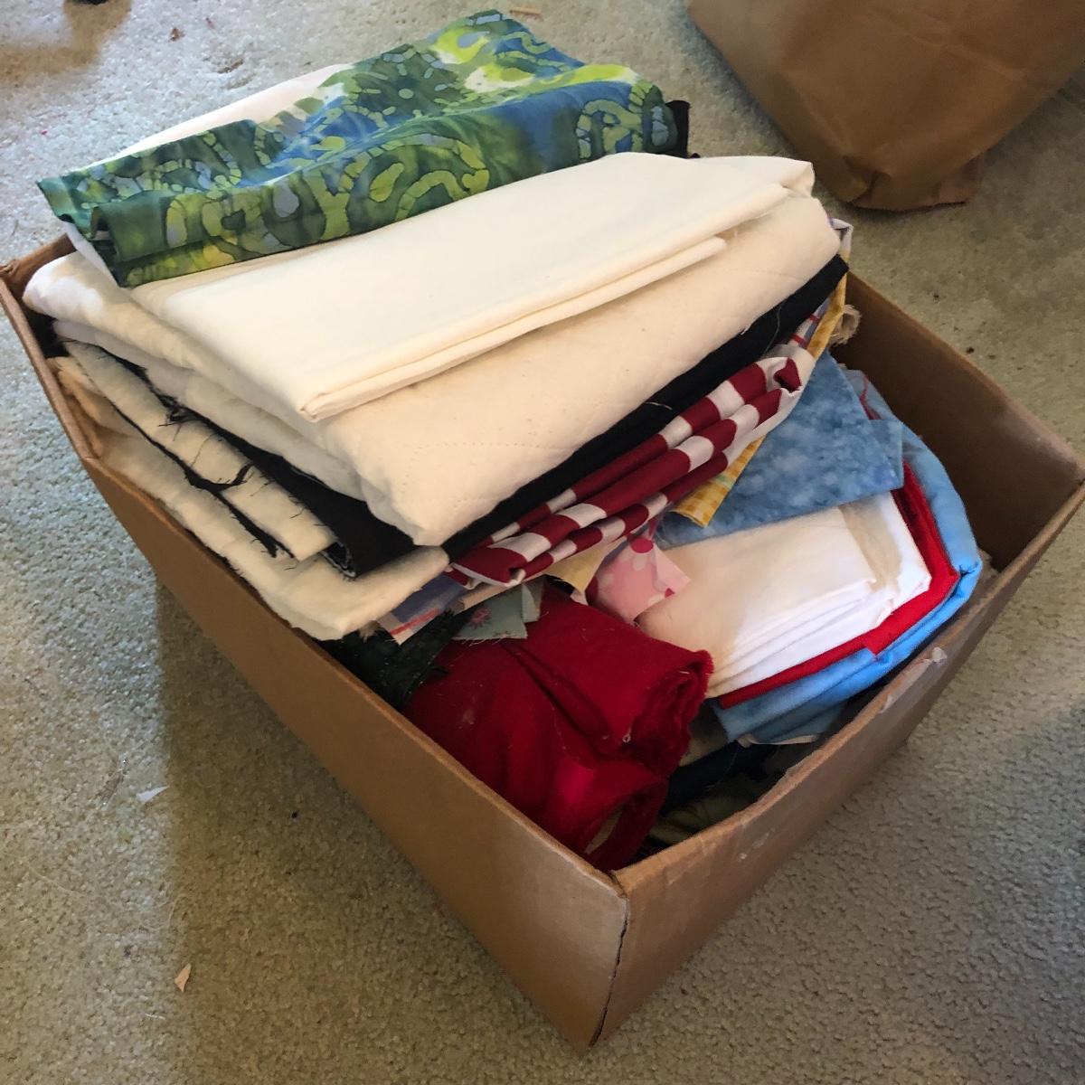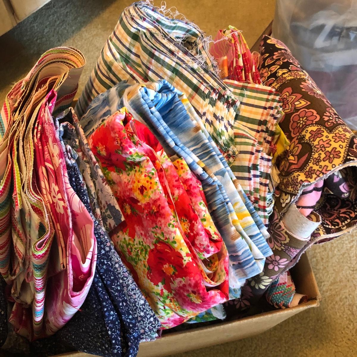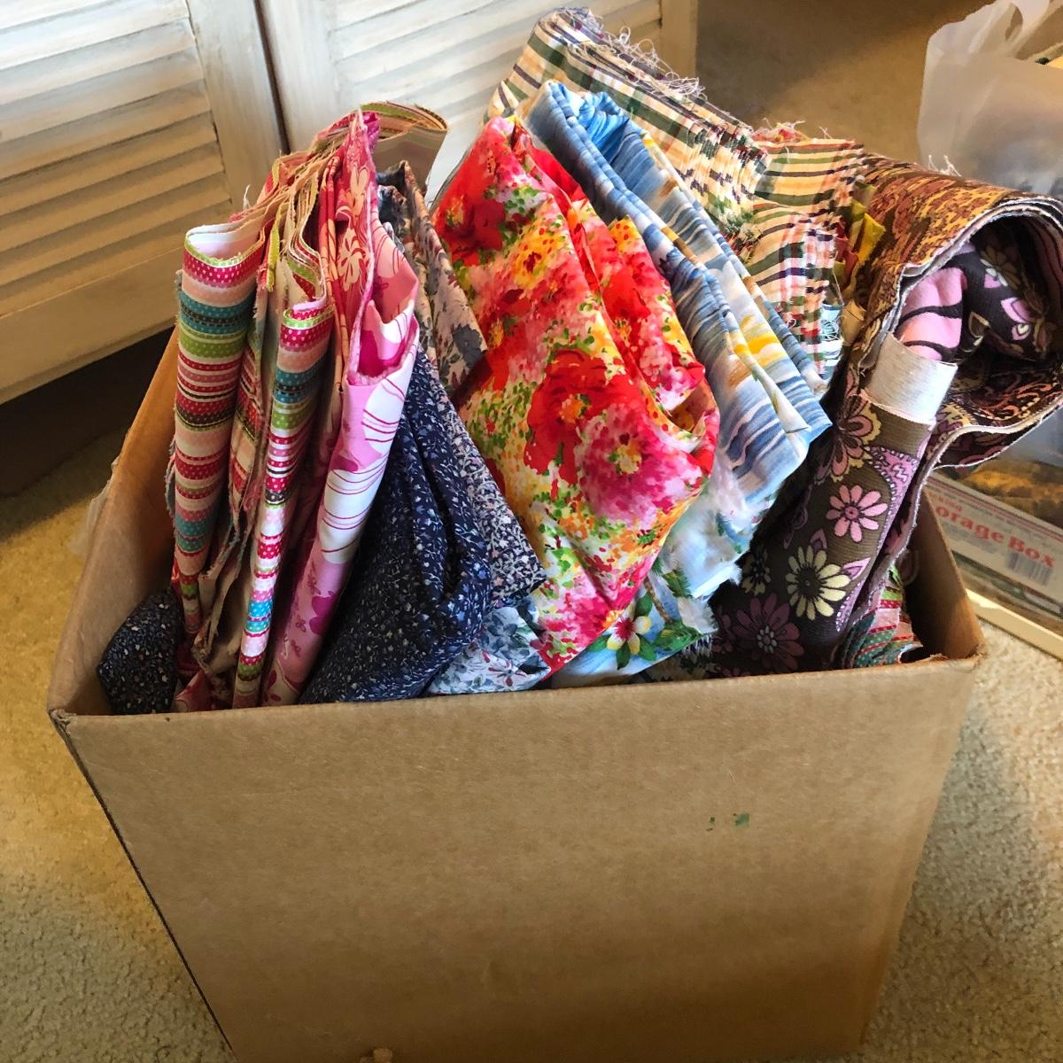 Wow! What a lot of material! Never buy fabric again from a retail store! Most of the material appears to be cut from bolts of fabric. The Fabric in this lot includes corduroy, flannel, felt, cotton and comes in plaids, batiks, florals, striped, plain, polka-dots and more! There are seven boxes and four plastic containers of material! Local pick up only.