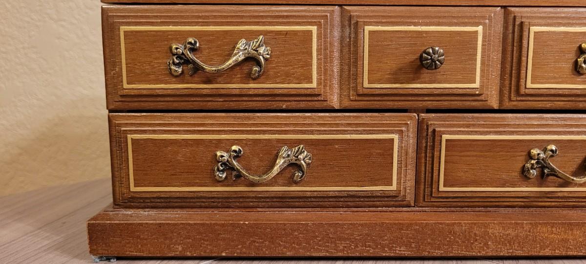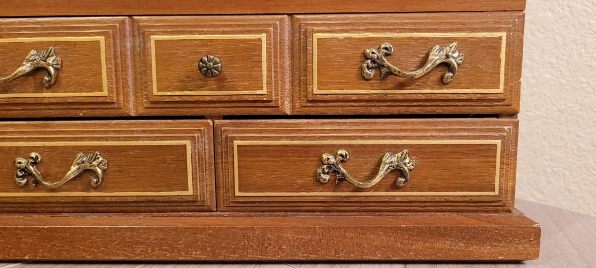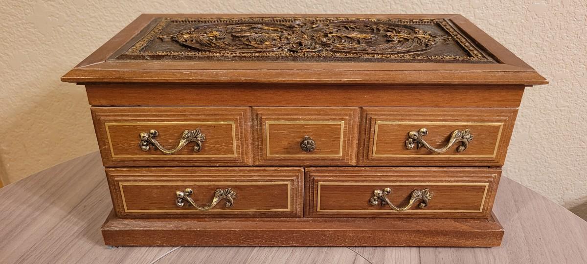 This nice Vintage Jewelry box is ready to add your rings and Necklaces. Does have a Music Box function but it is not currently running. Dimensions are approximately 6.5" x 12.5" x 6".