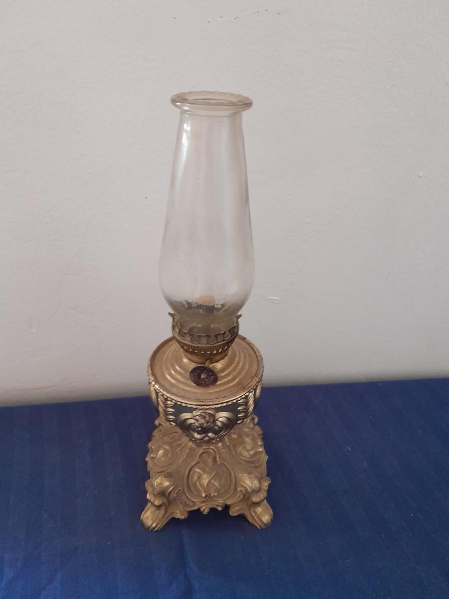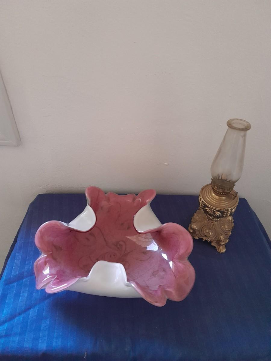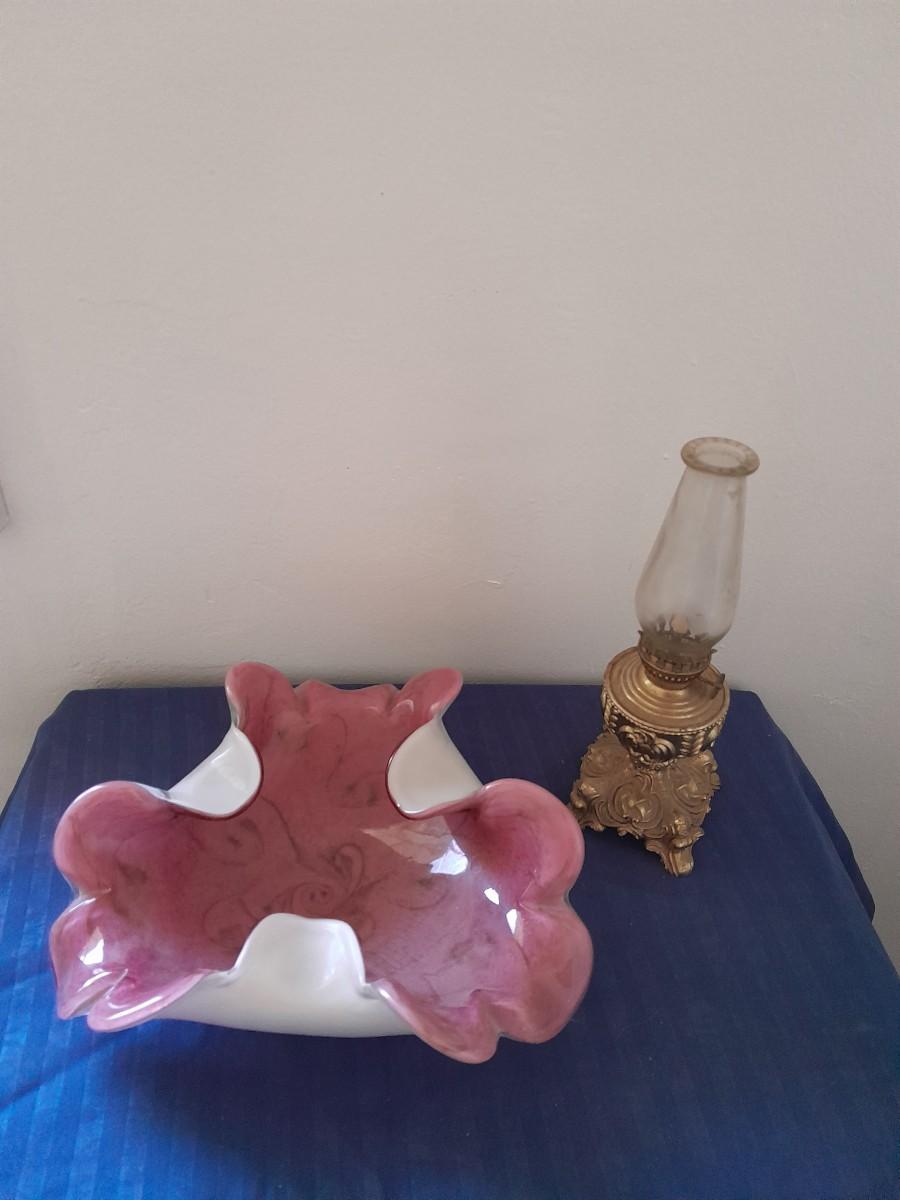 UNIQUE GLASS DISH, AND GOLD COLORED OIL LAMP