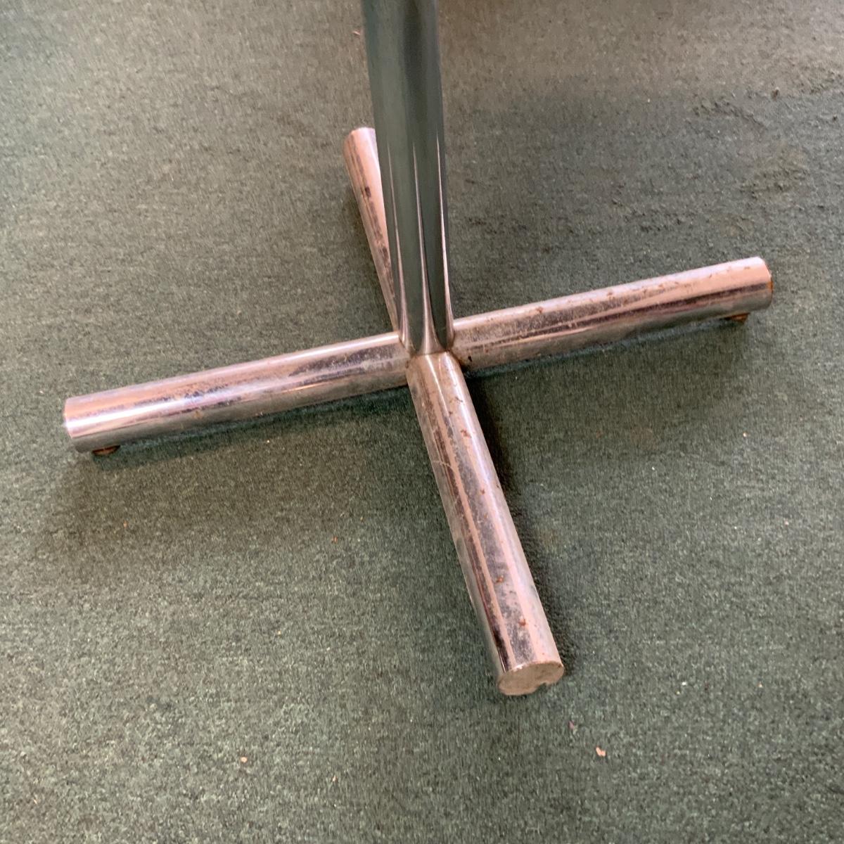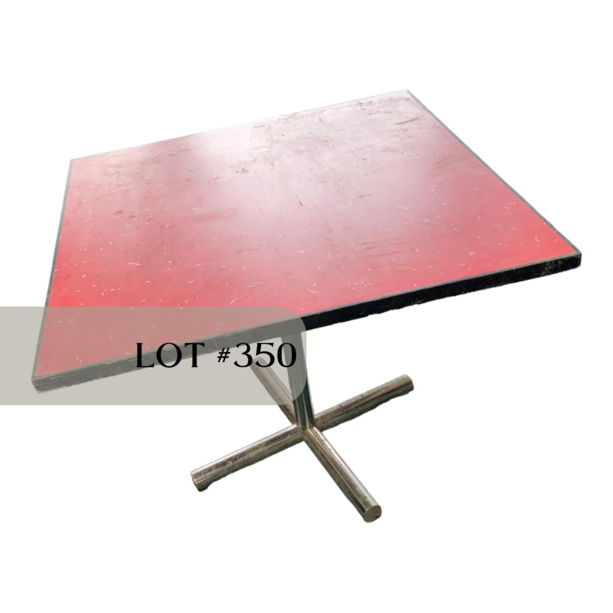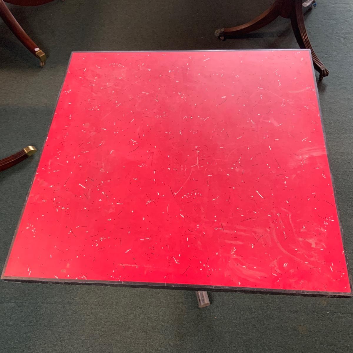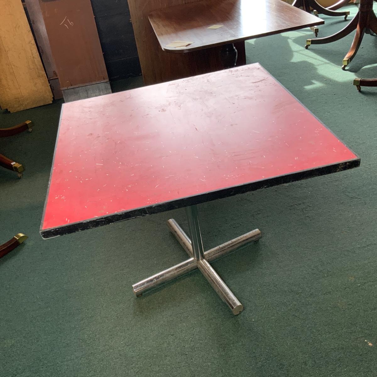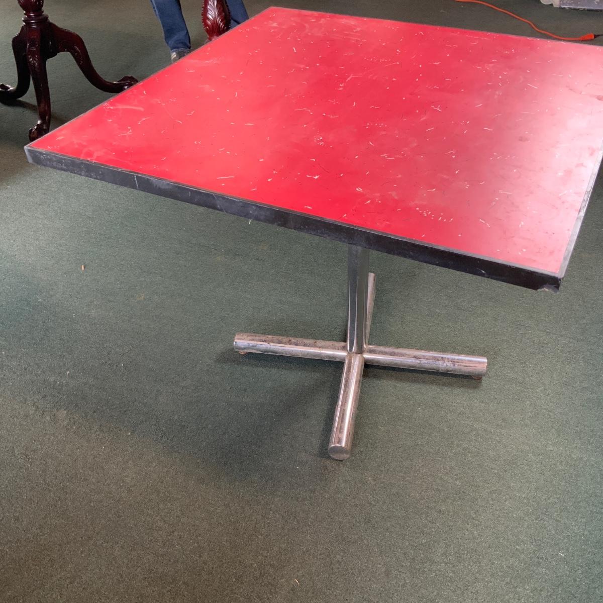 Mid-Century Chrome and Red Table. Would be wonderful in a little coffee shop or 3-Season room. //::\\ Please see photos for details and condition. No attempt has been made to hide any imperfections. All items listed in this auction are warehouse items, and need to be cleaned. A majority of the items need restoration as well. All items are sold AS IS and WITHOUT GUARANTEE. If you are uncertain about an item, DO NOT BID. Due to the nature of this online auction in-person inspection is HIGHLY recommended. All Sales are FINAL. Pick Up Times are FIRM. Please confirm with your own schedule that you can pick up in the scheduled times listed in the Terms and Conditions. Any questions please message the auctioneer. DO NOT Contact The Harp Gallery.
