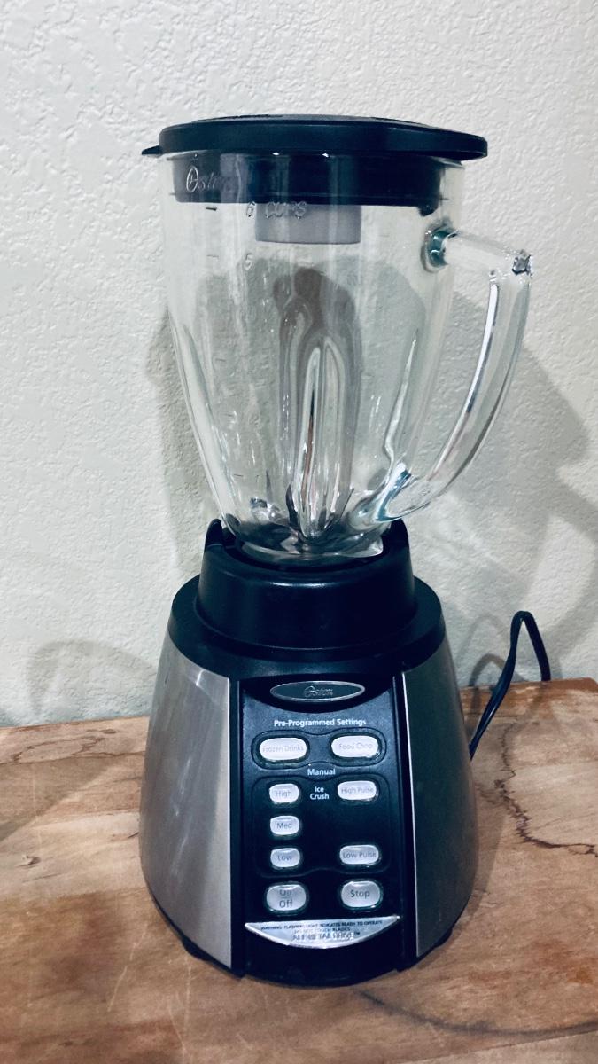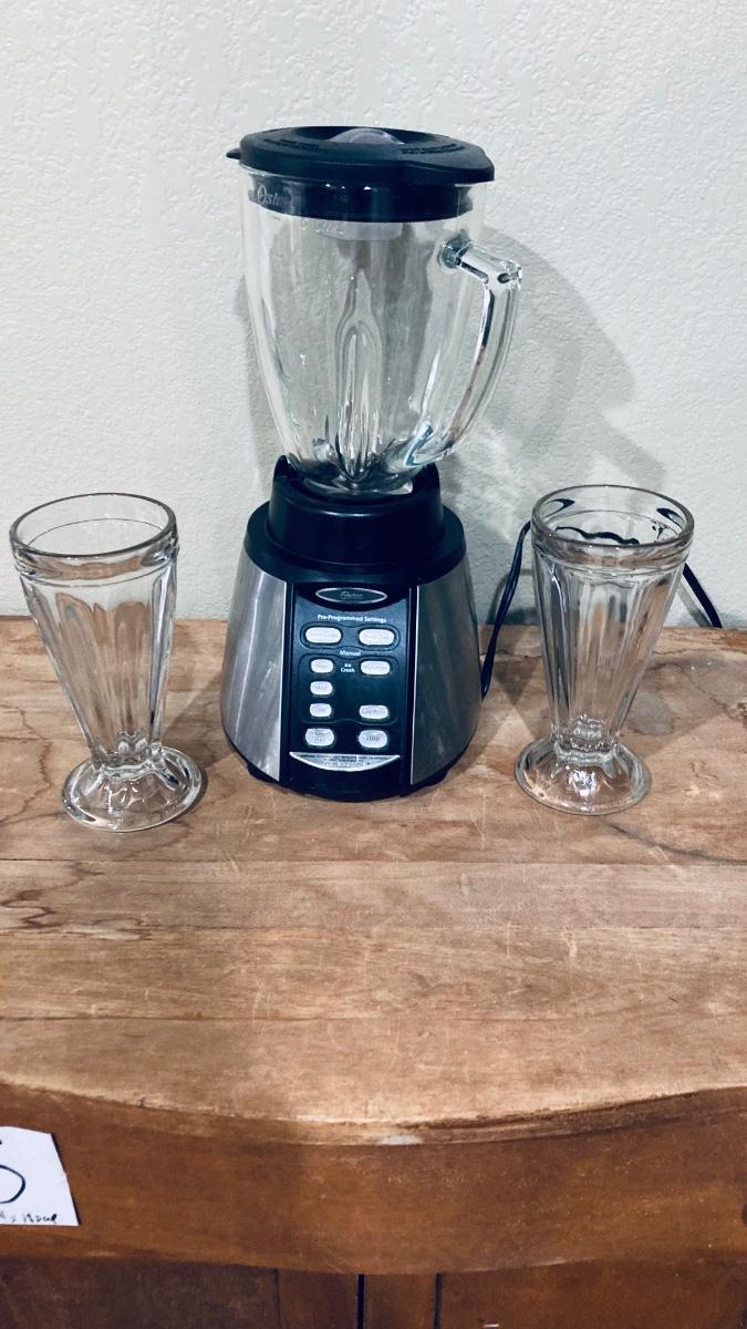 LOT 350 OSTER ALL METAL DRIVE BLENDER AND RETRO SHAKE GLASSES
