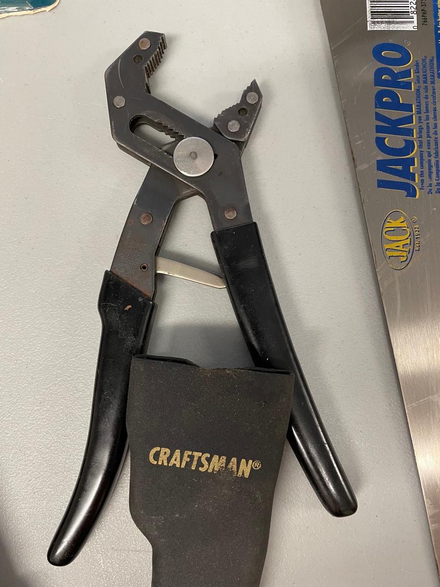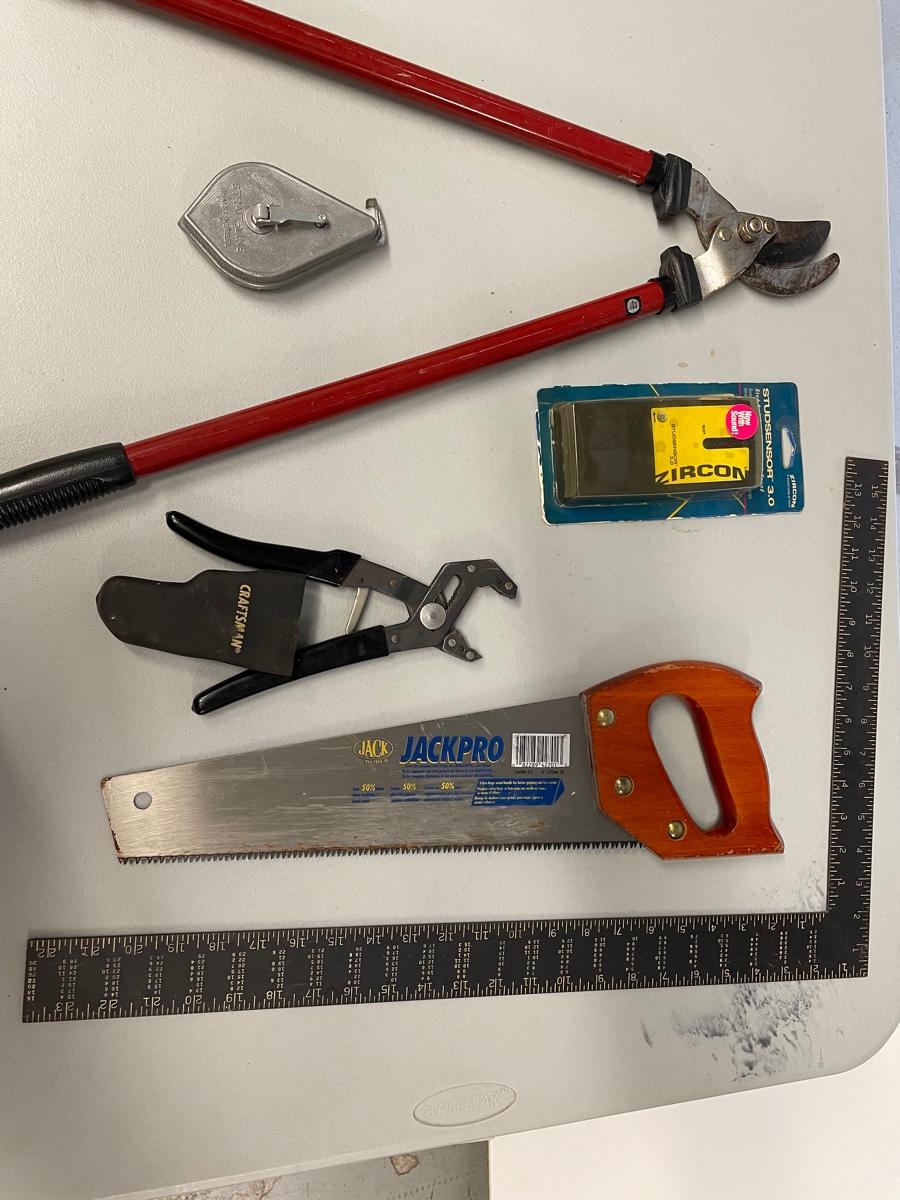 Metal Square Ruler, Stud sensor, Craftsman Robo Grip, Chalk-line Reel, Saw, Bolt Cutter