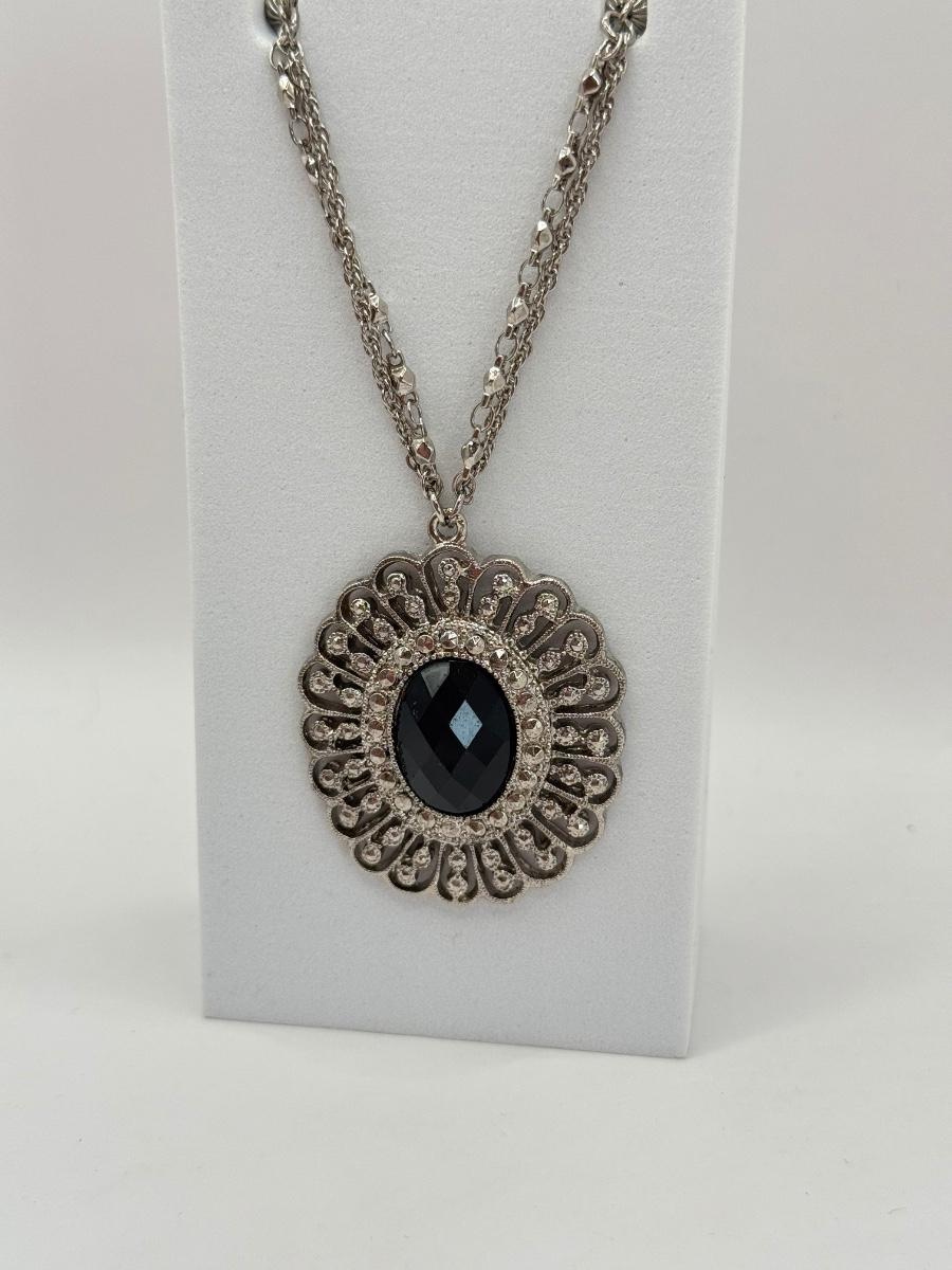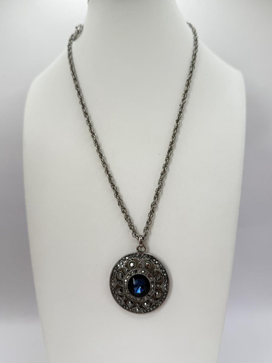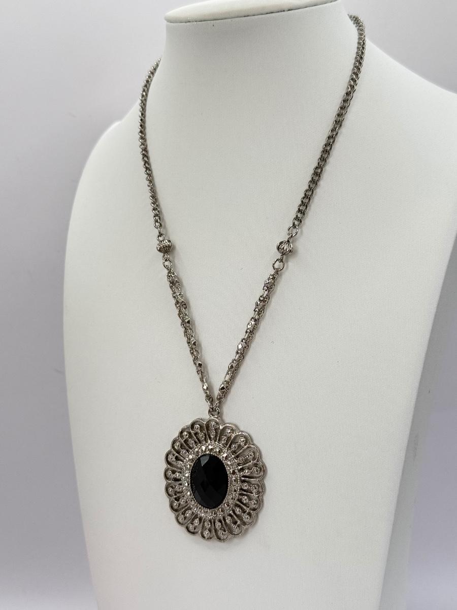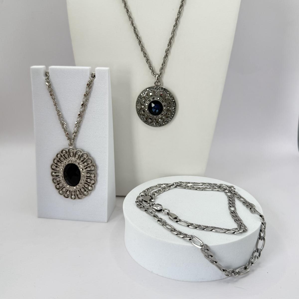 LOT 350J: 20” Trifari Silver Tone Marcasite Pendant Necklace, 19” 1928 Silver Tone Flower Pendant Necklace & 20” Metal Link Chain