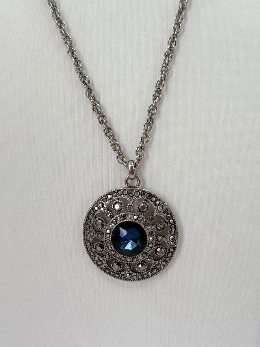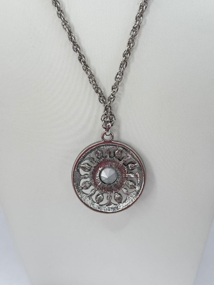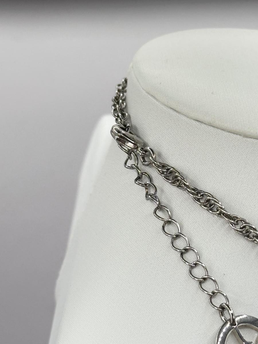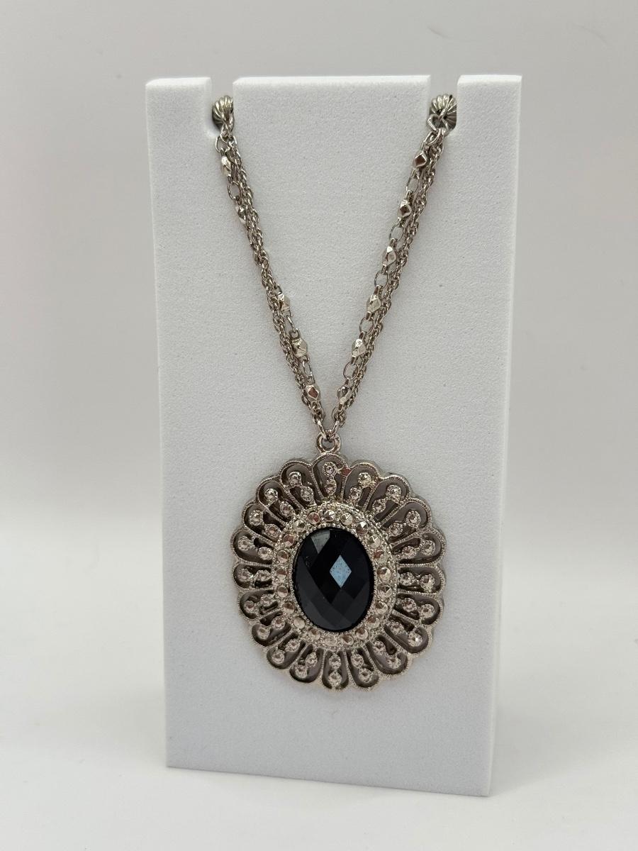 LOT 350J: 20” Trifari Silver Tone Marcasite Pendant Necklace, 19” 1928 Silver Tone Flower Pendant Necklace & 20” Metal Link Chain