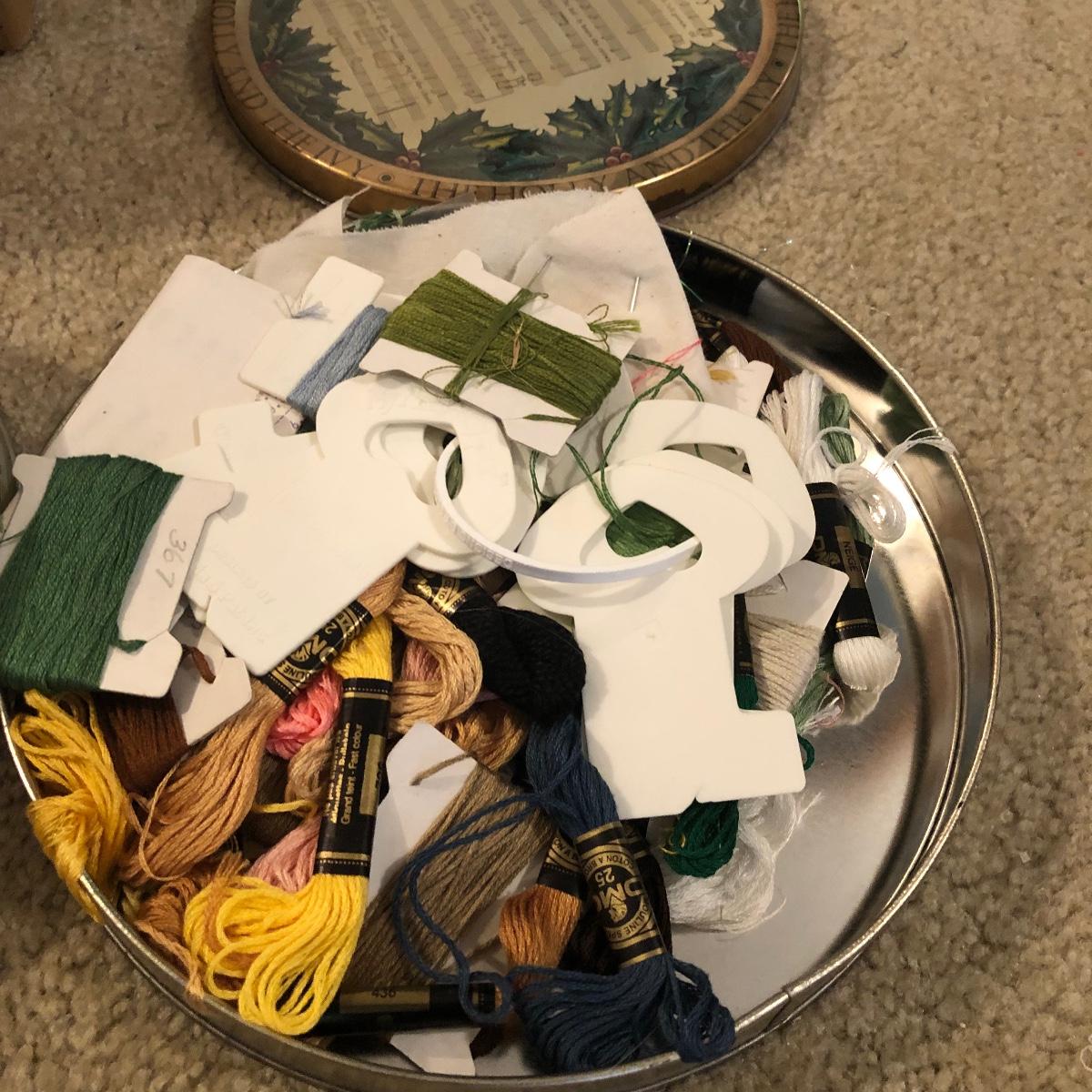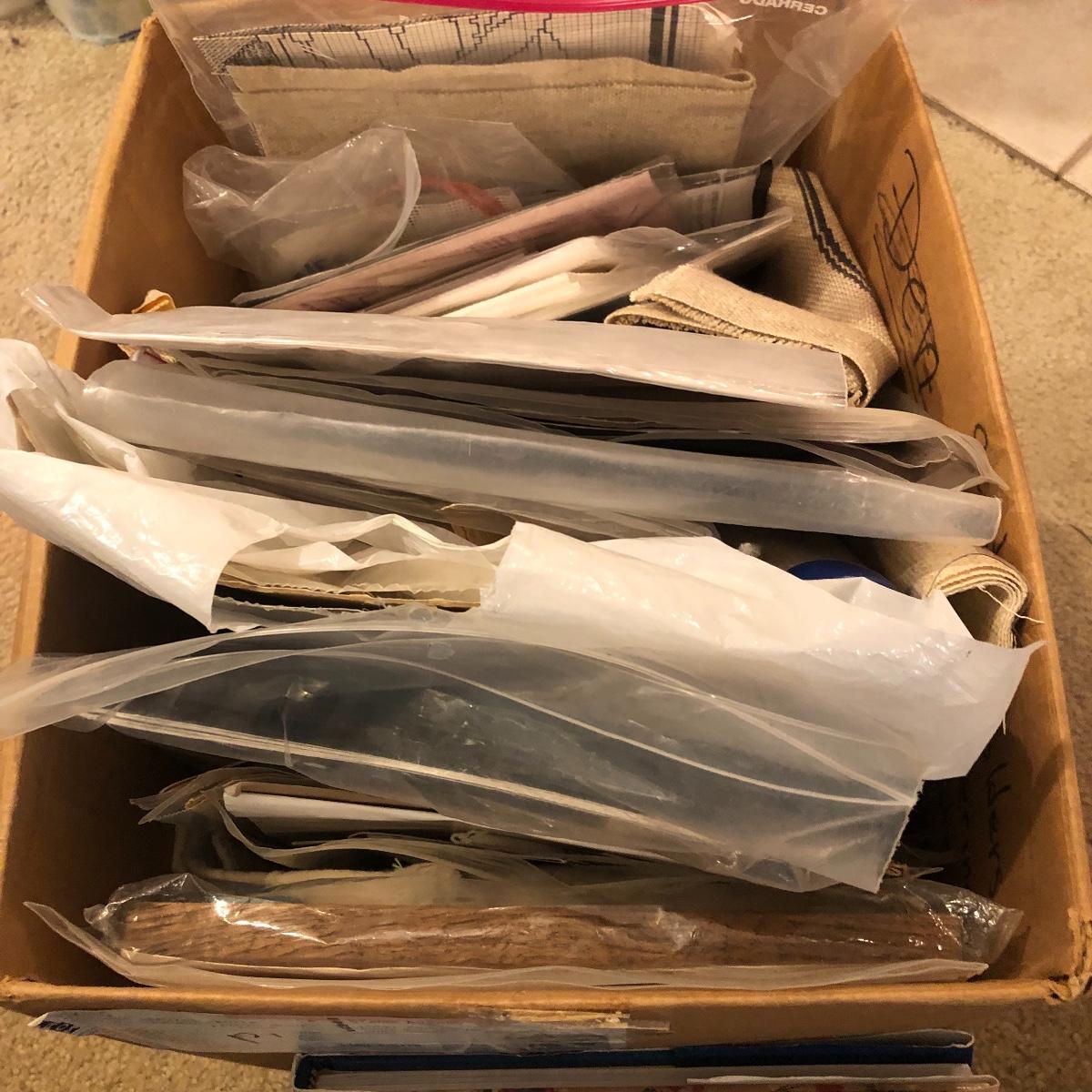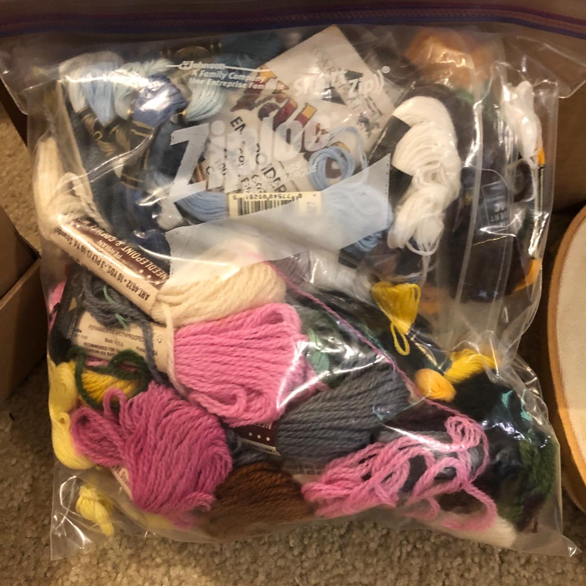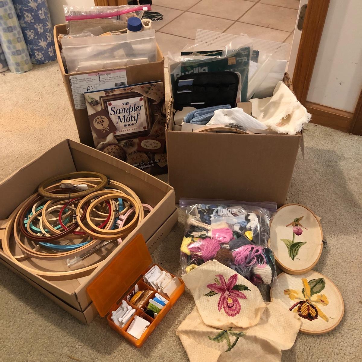 This lot includes all supplies needed to needle point! It includes hoops, thread (silk thread too) cross stitch kits, books and more! Local pick up only.