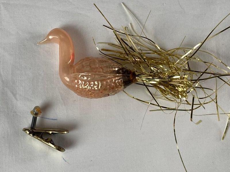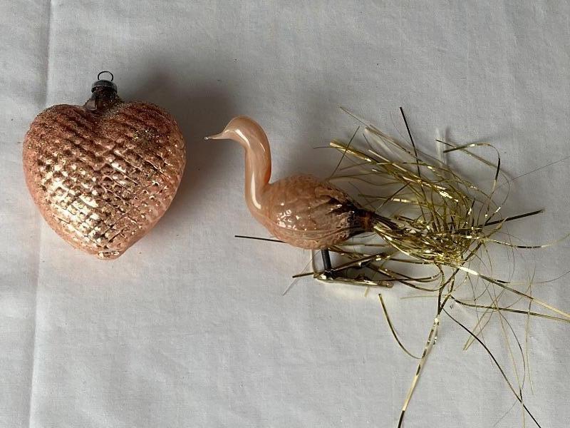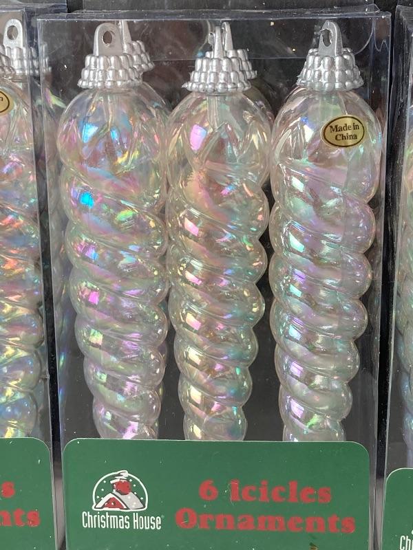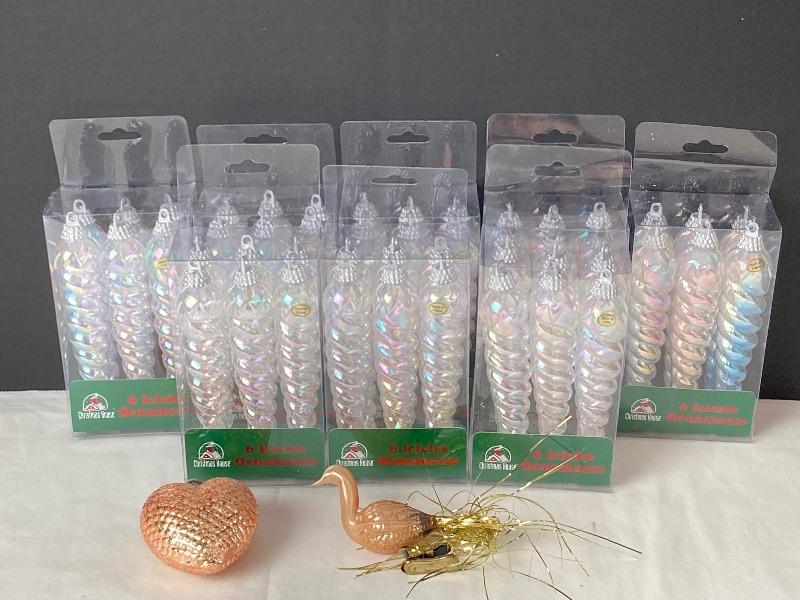 Seven packs of plastic icicle ornaments by Christmas House, each pack contains six ornaments. Heart shaped glass ornament. Bird blown glass ornament (need clip glued on)