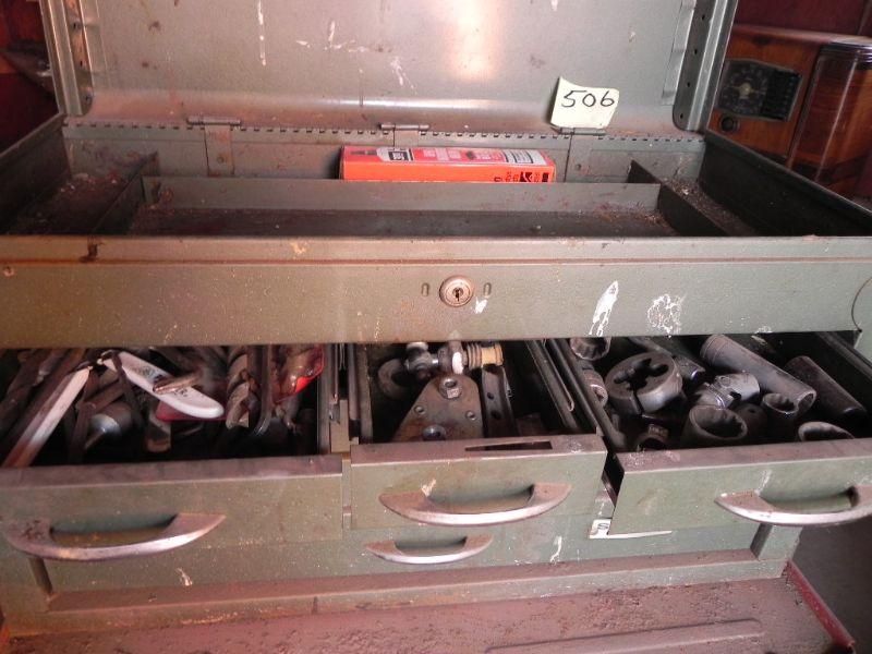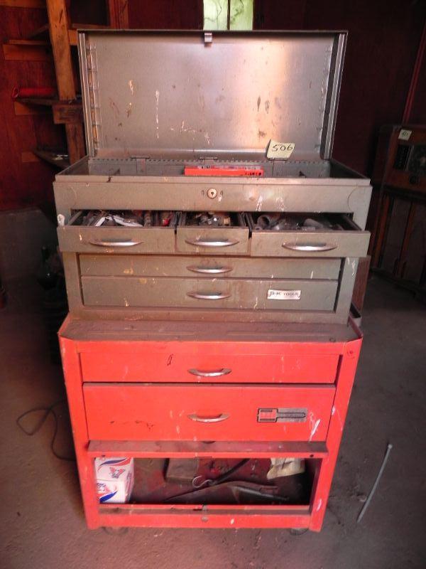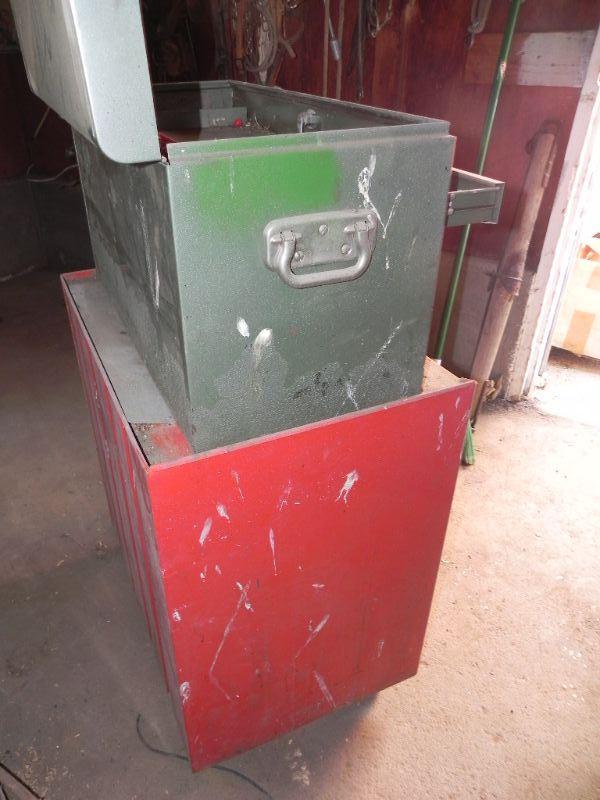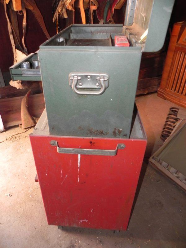 2 PIECE, TOP HAS 3 DRAWERS AND STORAGE UNDER LID AND THE BOTTOM IS ON CASTORS WITH 2 DRAWER AND BOTTOM STORAGE