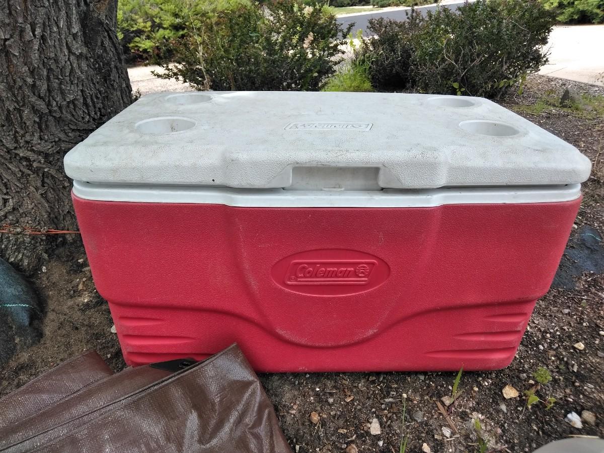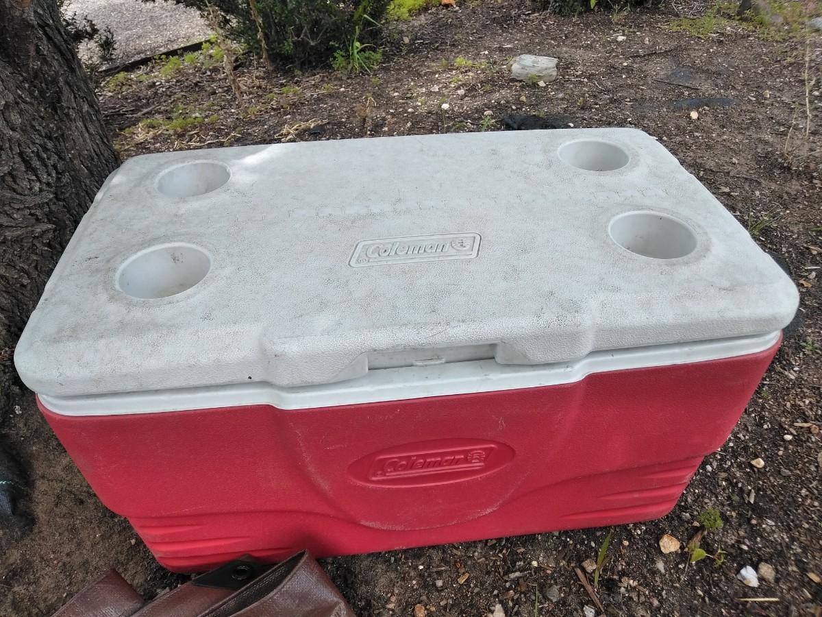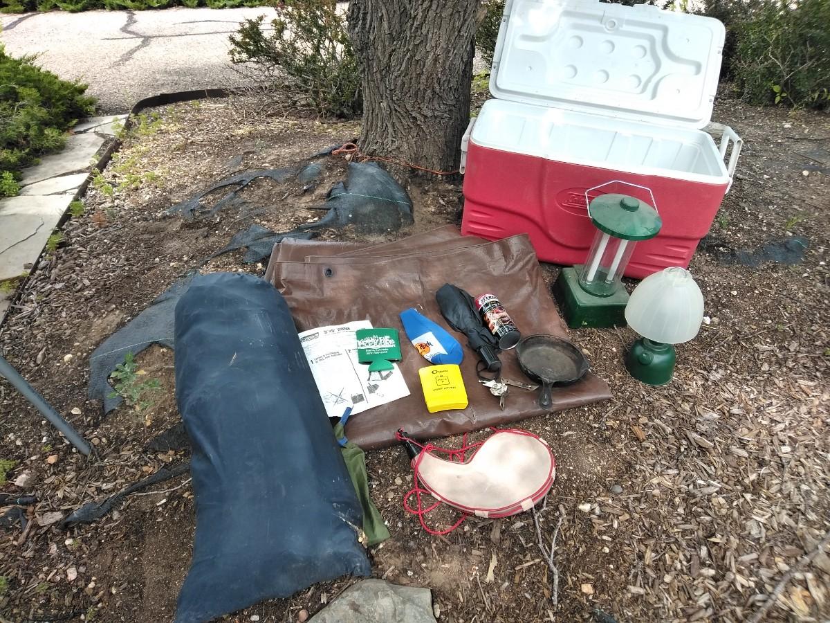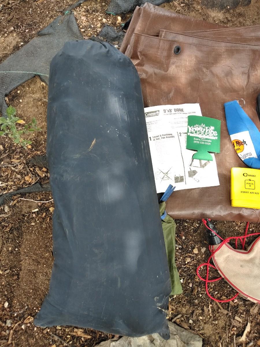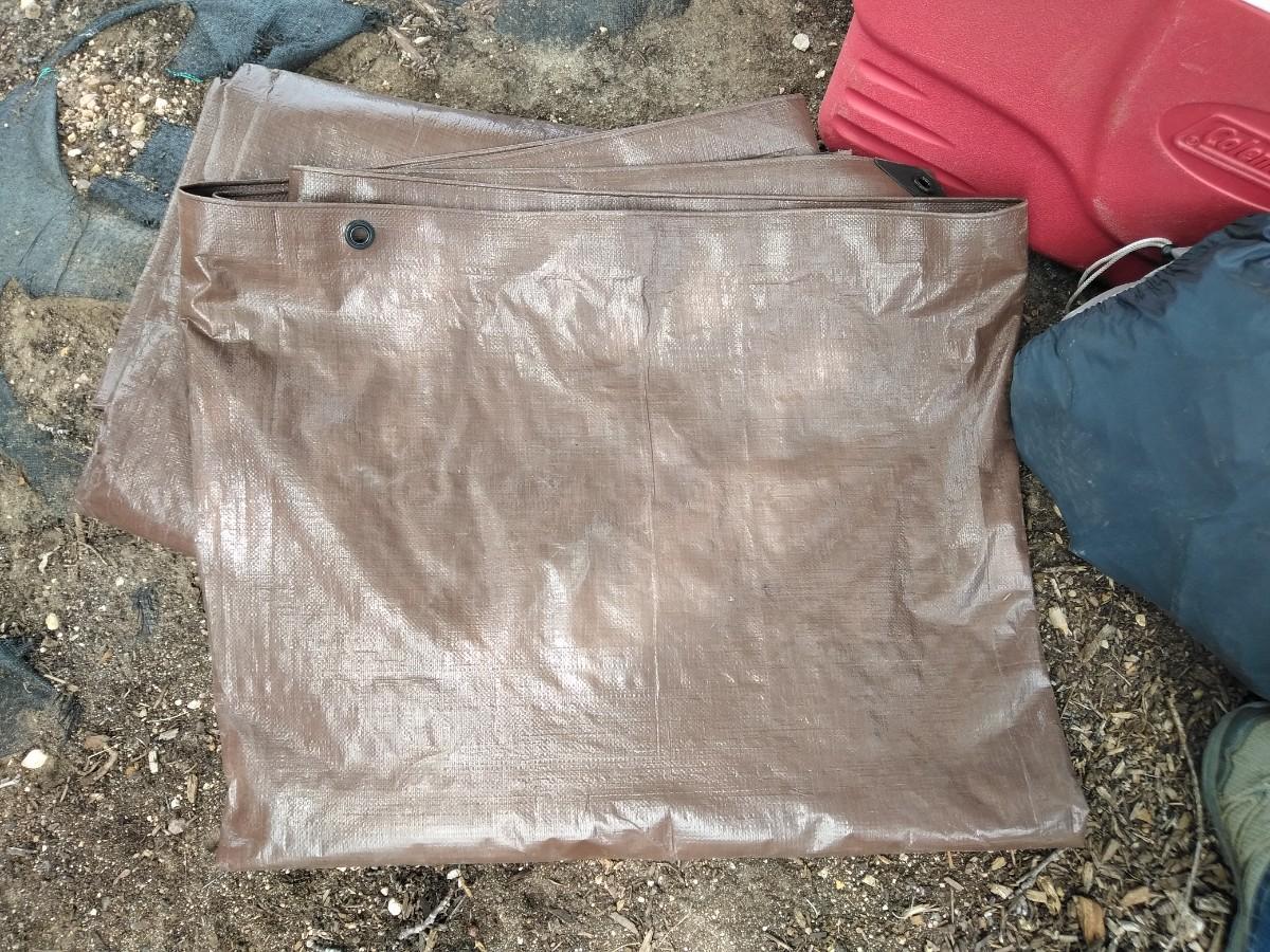 COLEMAN COOLER, TWO BATTERY OPERATED LAMPS, NICE BROWN TARP, STERNO FUEL, SMALL CAST IRON PAN, KOOSIES, A 9' X 9' COLEMAN DOME TENT, AND A CANTEEN.