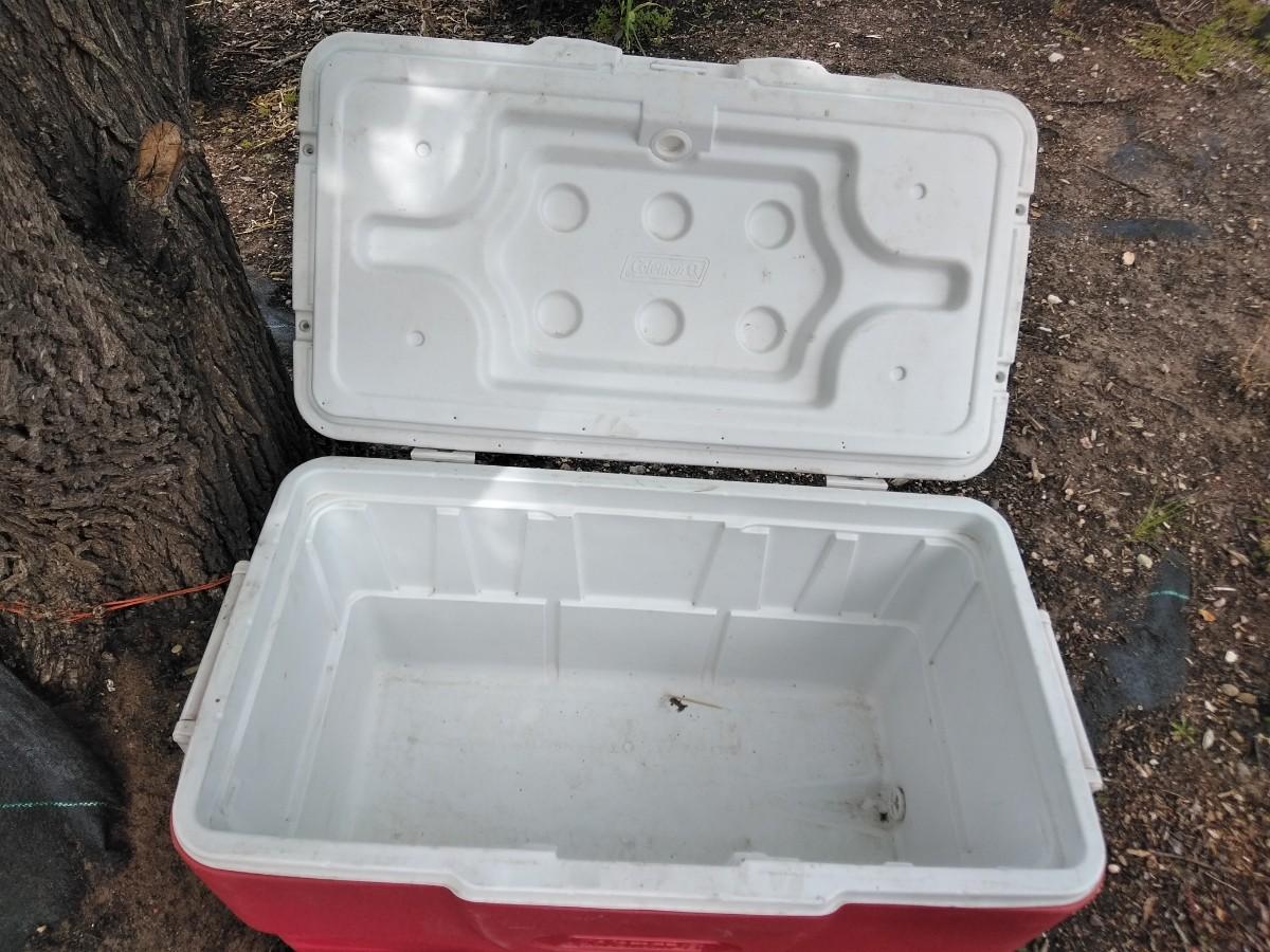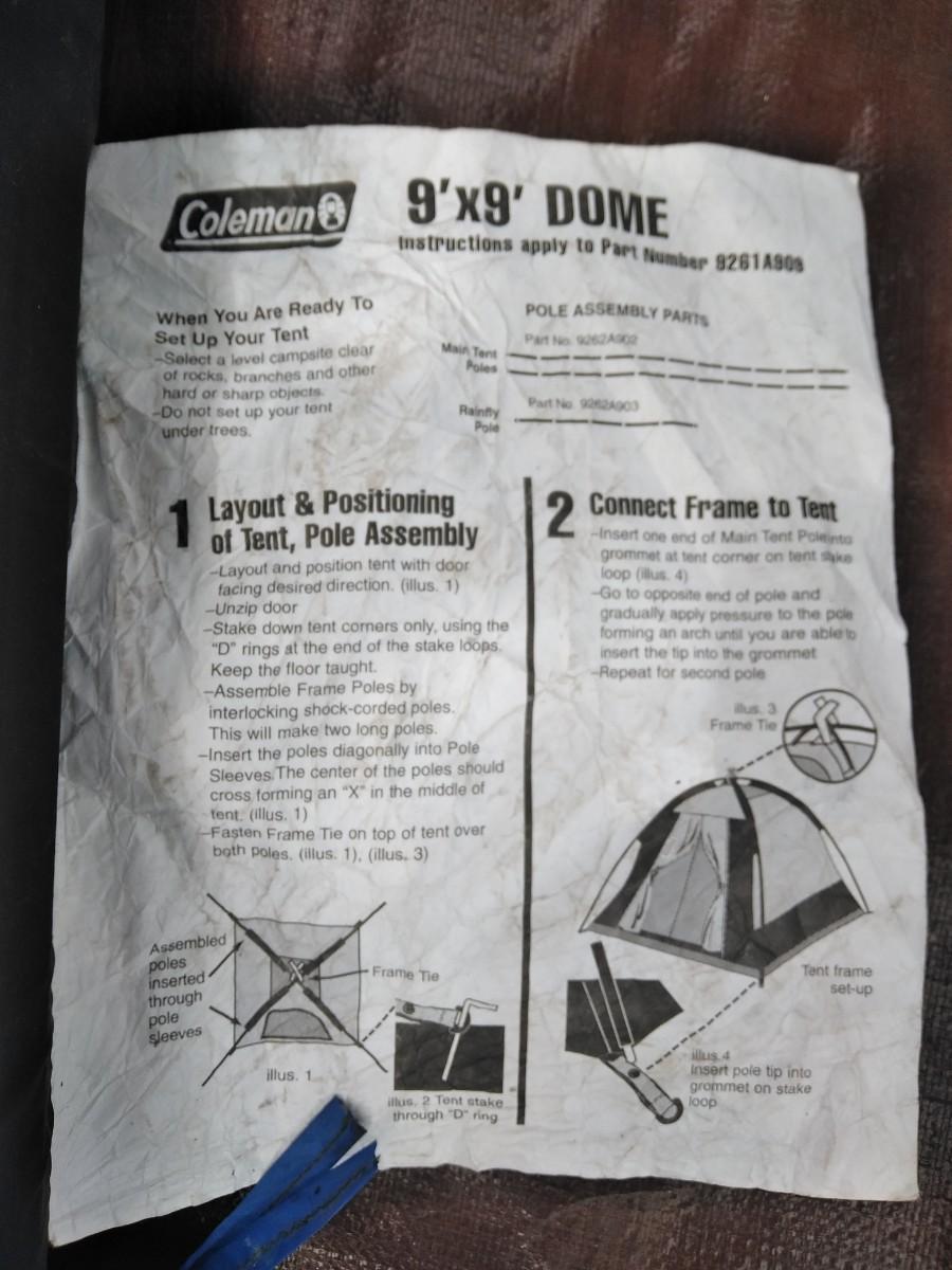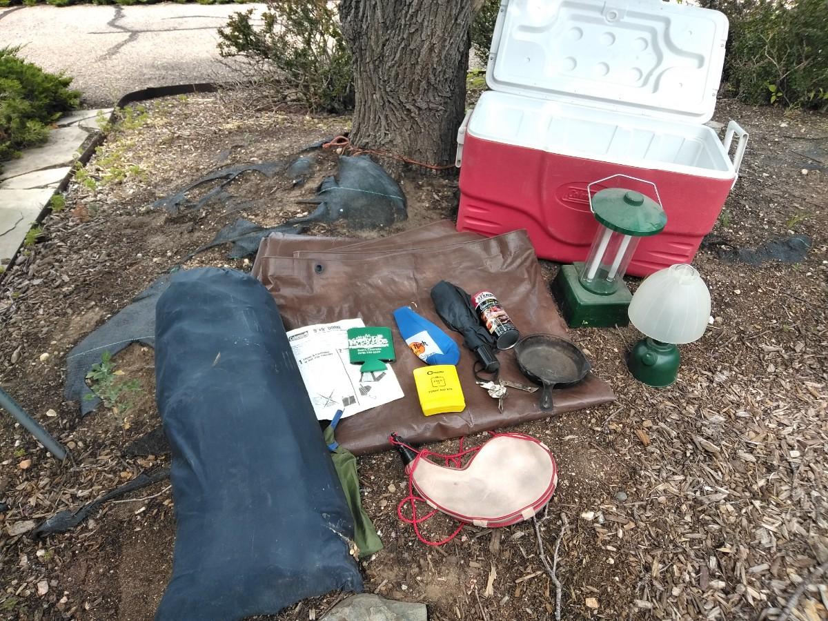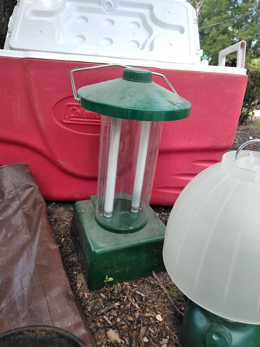 COLEMAN COOLER, TWO BATTERY OPERATED LAMPS, NICE BROWN TARP, STERNO FUEL, SMALL CAST IRON PAN, KOOSIES, A 9' X 9' COLEMAN DOME TENT, AND A CANTEEN.