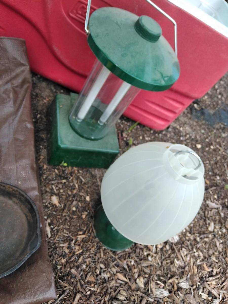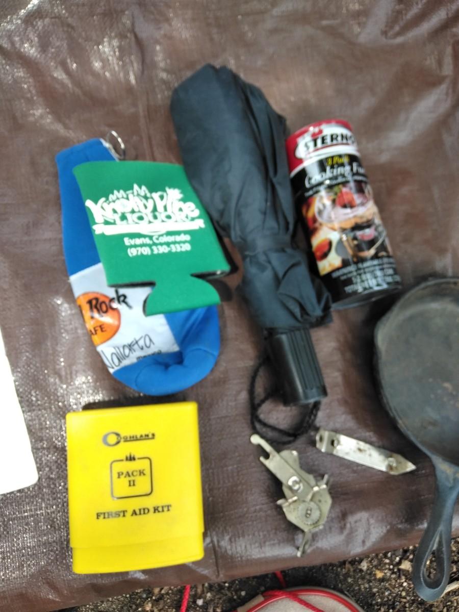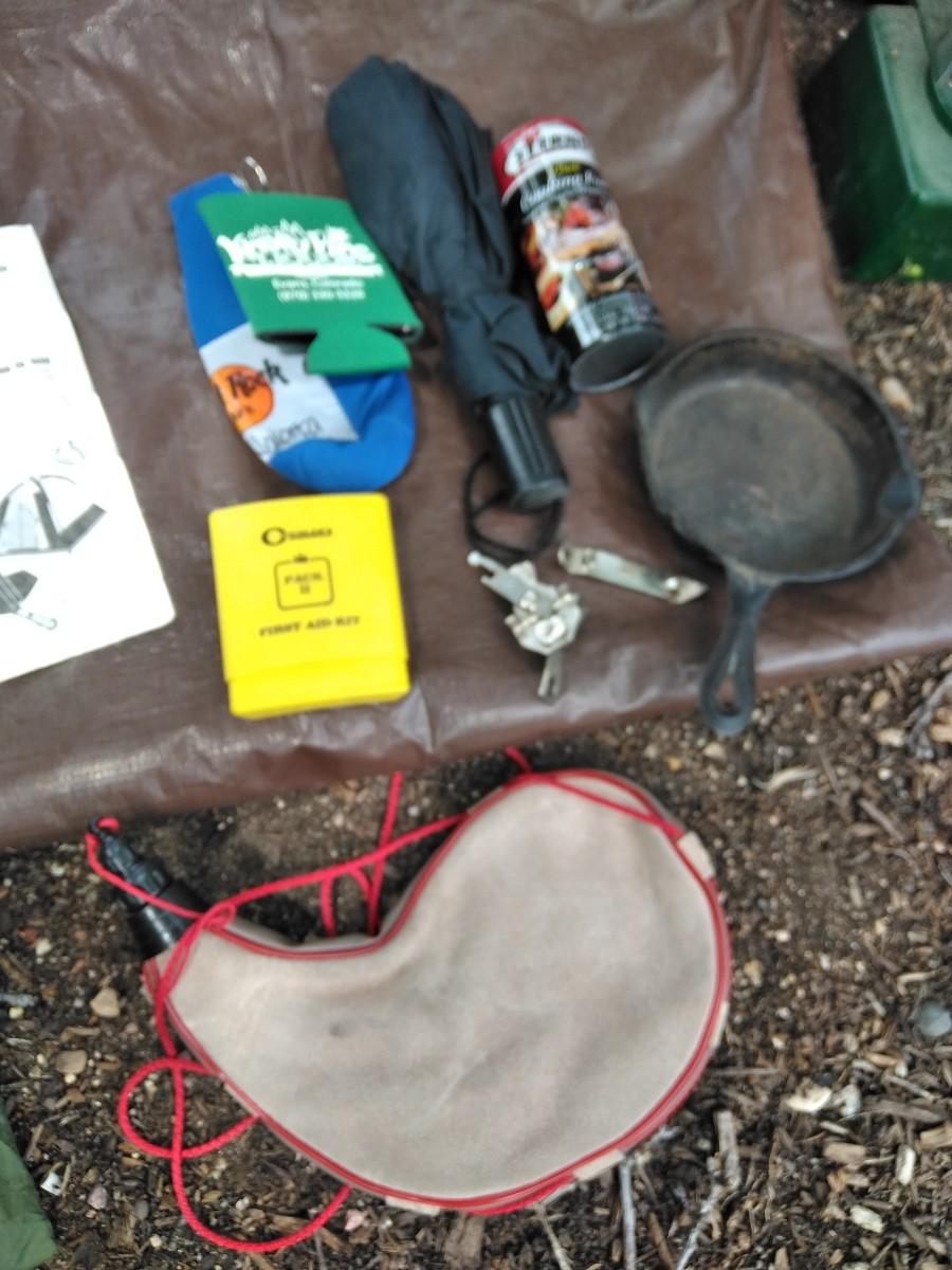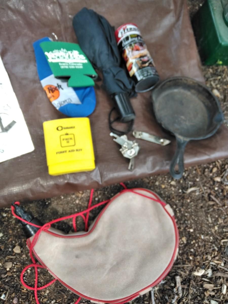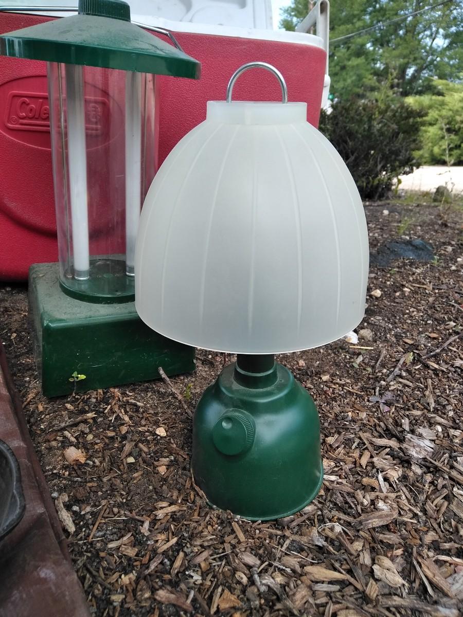 COLEMAN COOLER, TWO BATTERY OPERATED LAMPS, NICE BROWN TARP, STERNO FUEL, SMALL CAST IRON PAN, KOOSIES, A 9' X 9' COLEMAN DOME TENT, AND A CANTEEN.