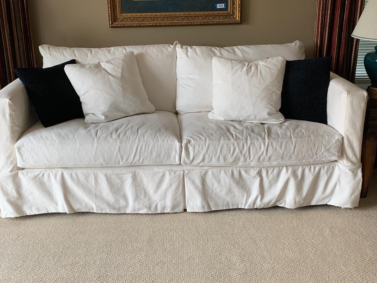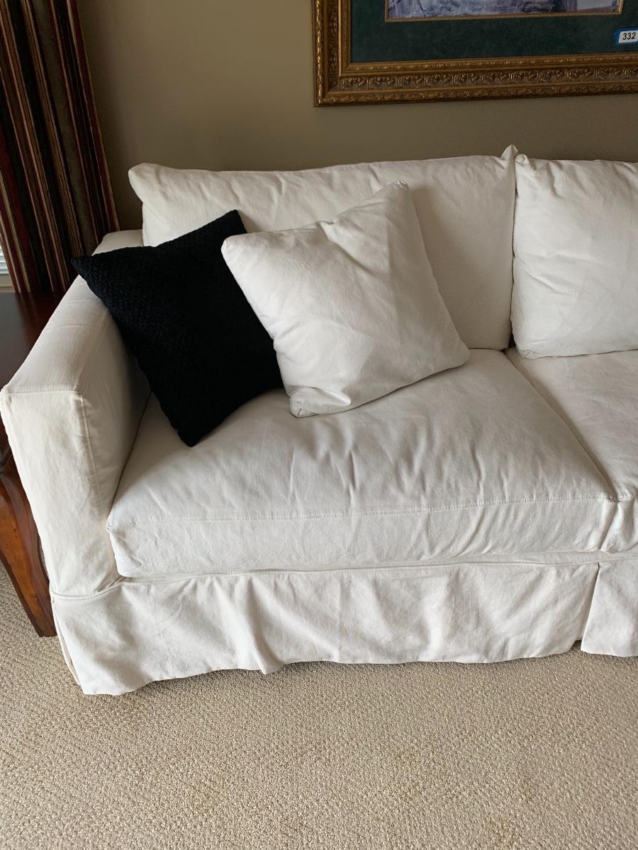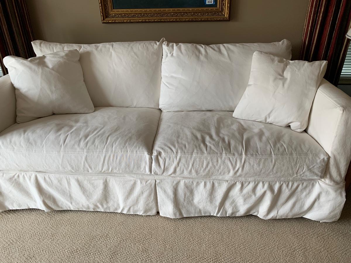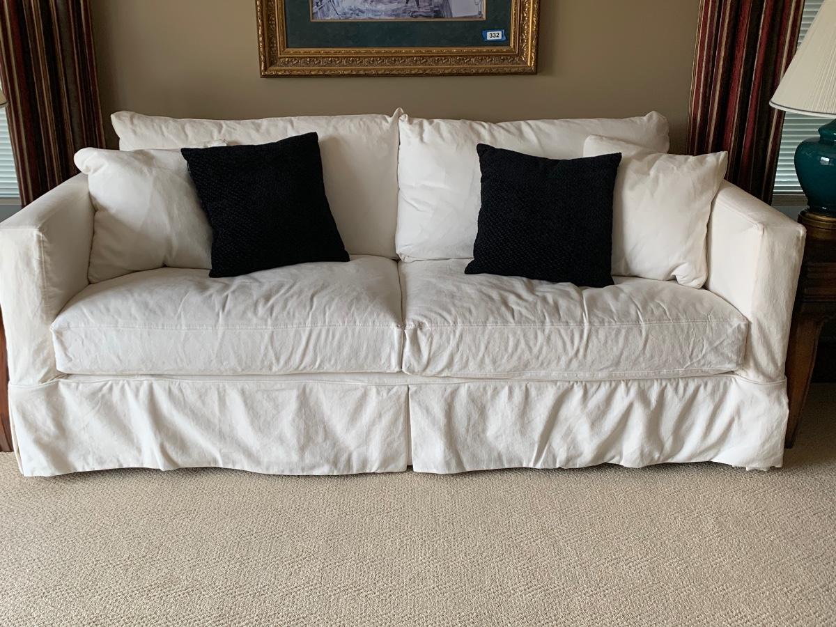 Sofa with custom made slip covers and 4 accent pillows. Sofa is comfortable and is in good shape. Original color appears to be off white. (83 x 37 x35 )