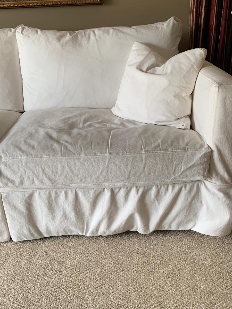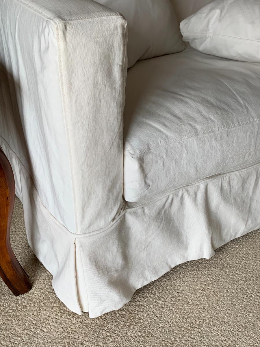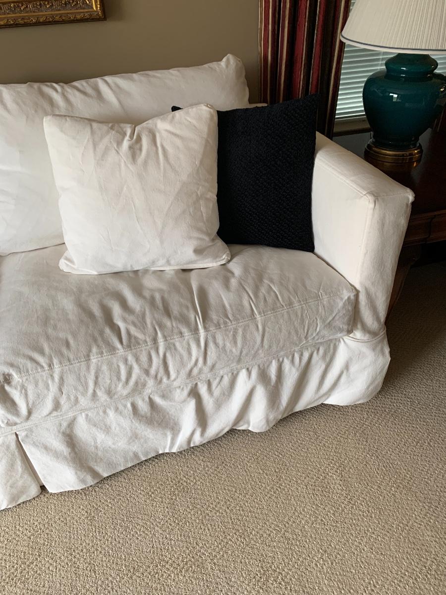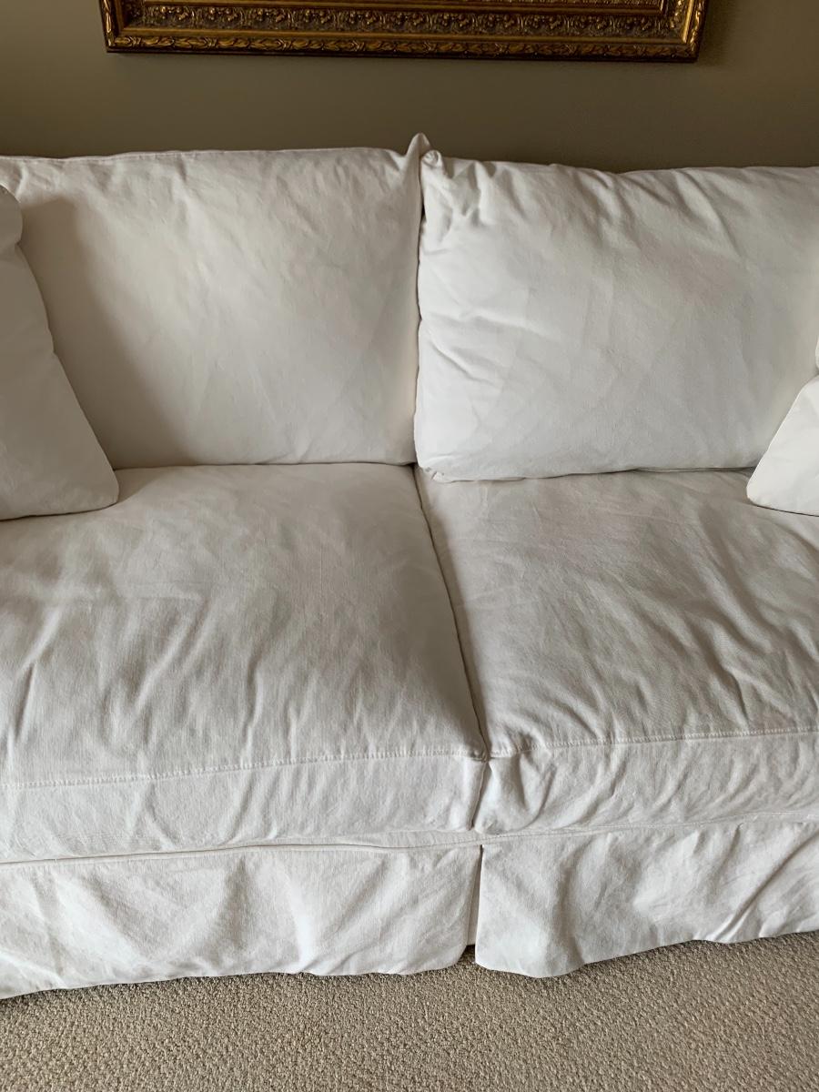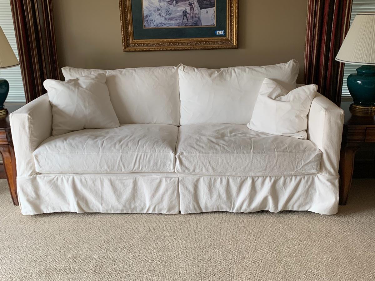 Sofa with custom made slip covers and 4 accent pillows. Sofa is comfortable and is in good shape. Original color appears to be off white. (83 x 37 x35 )