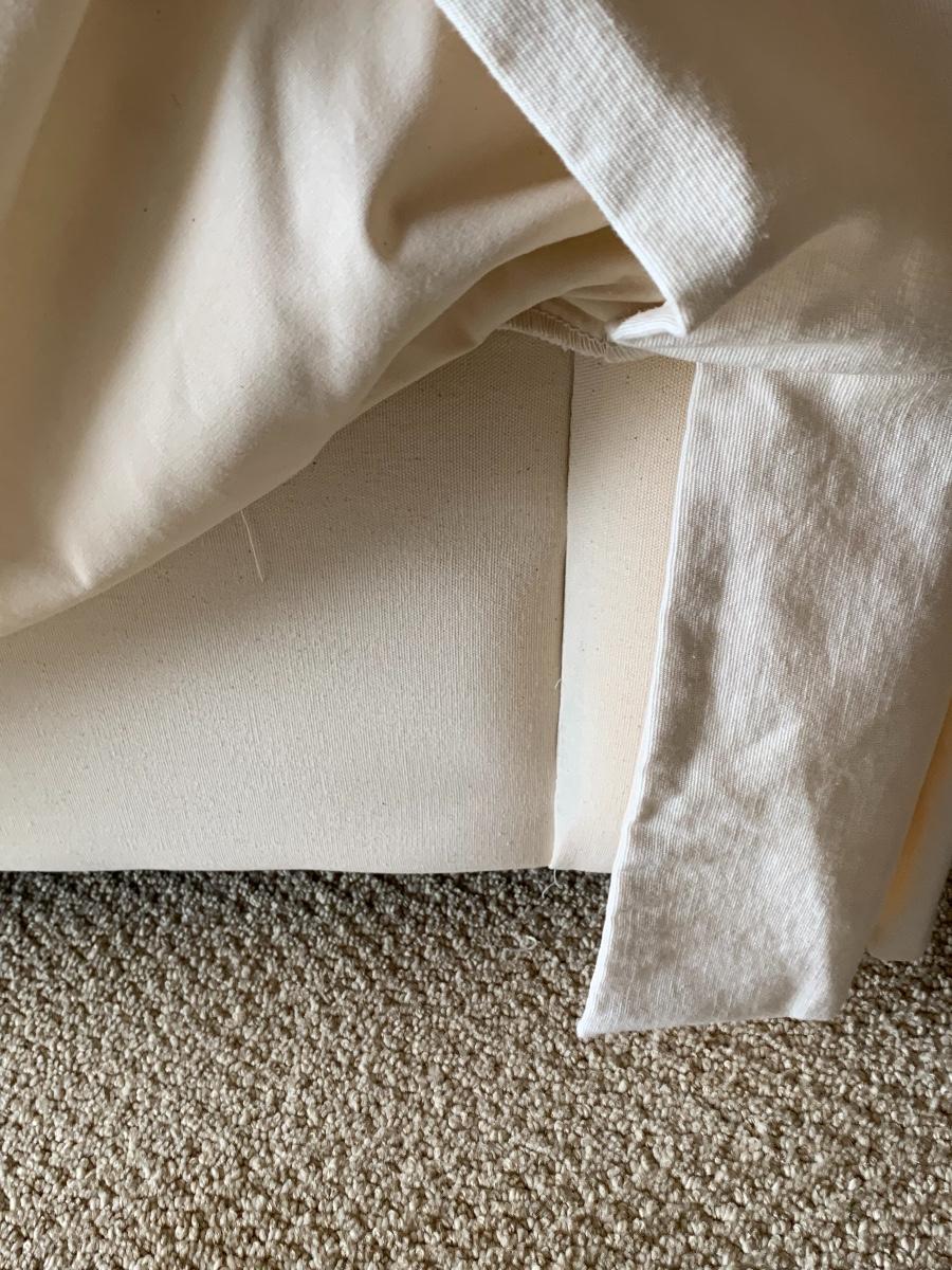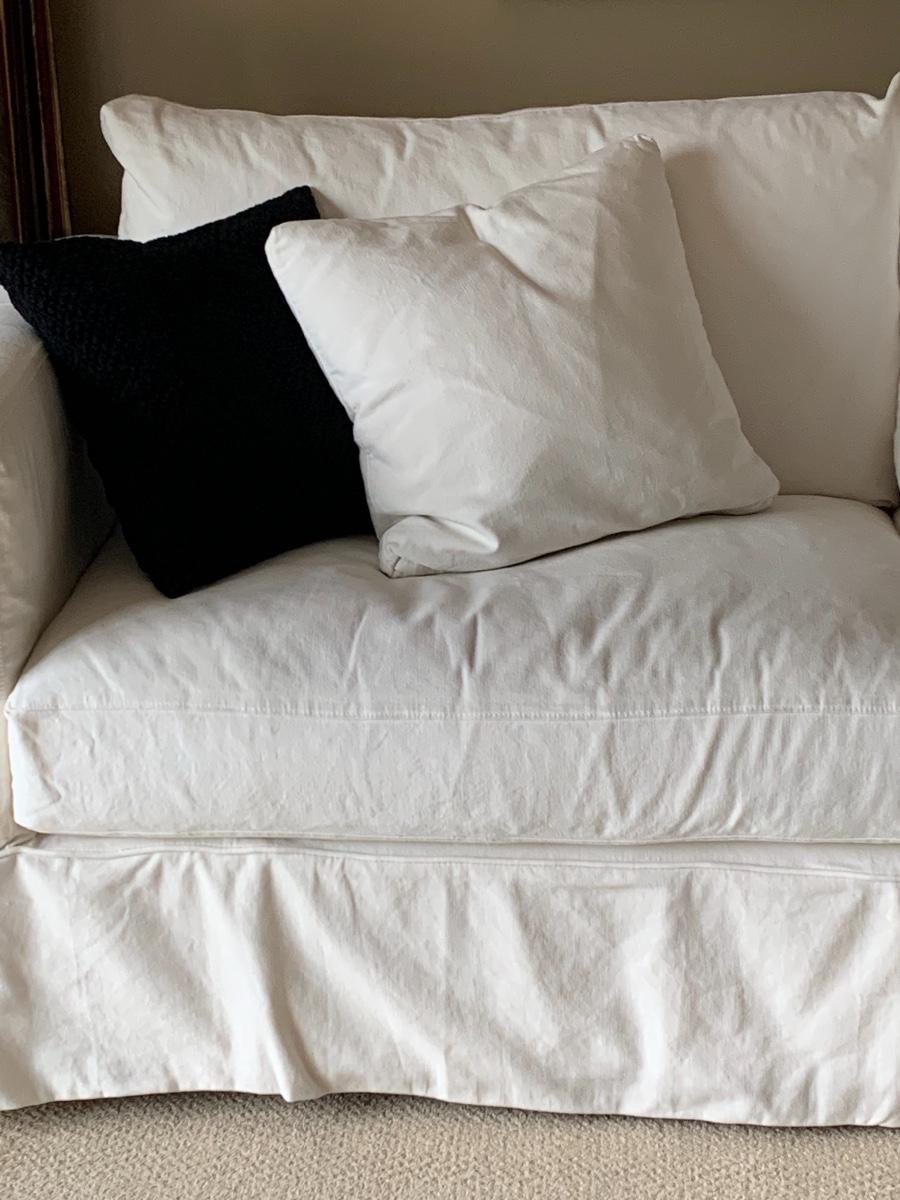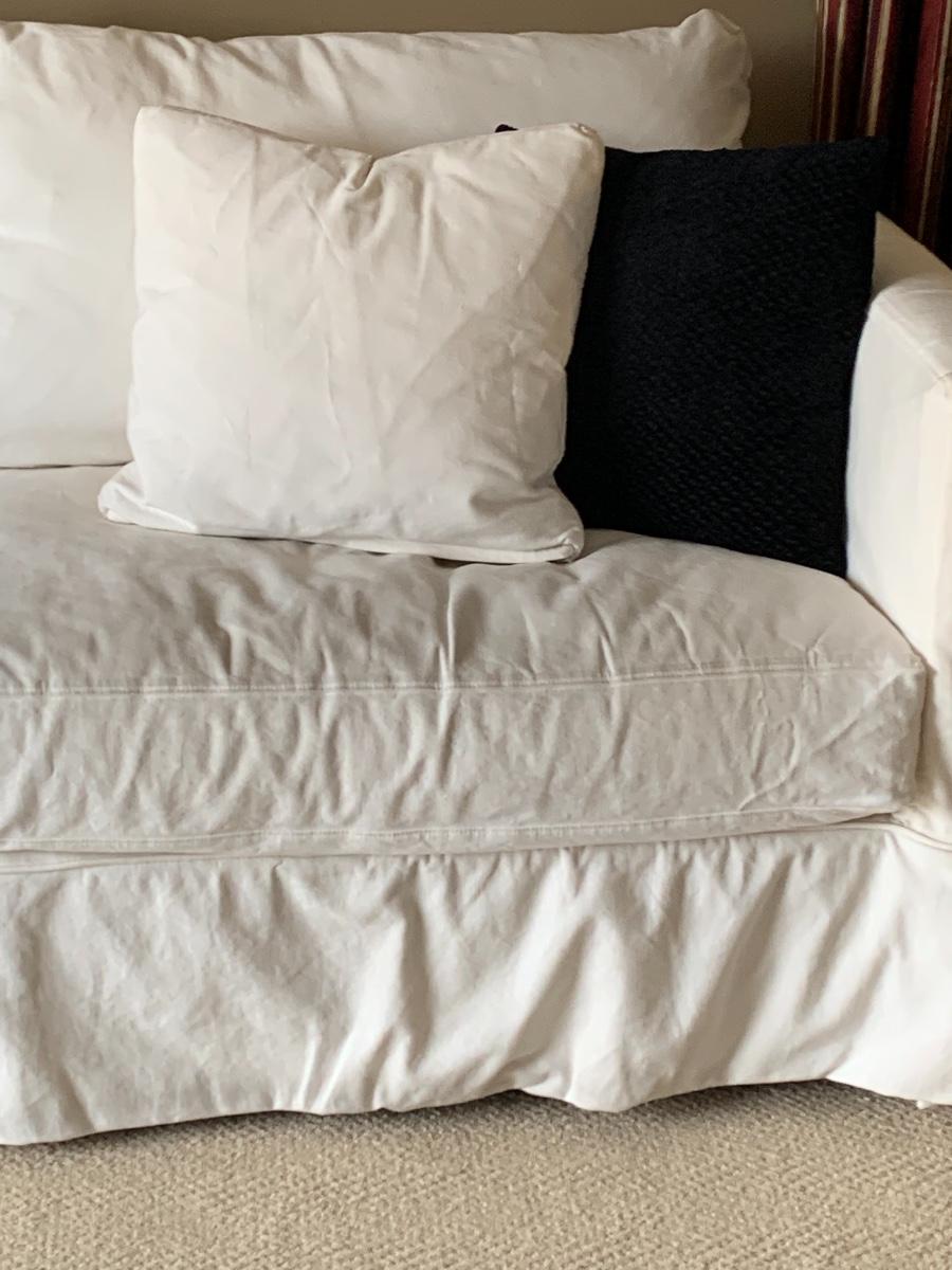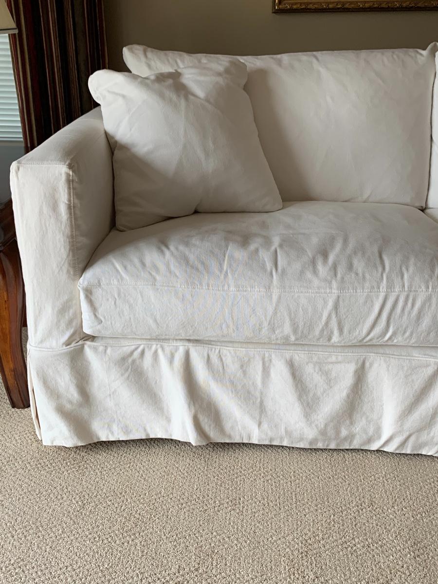 Sofa with custom made slip covers and 4 accent pillows. Sofa is comfortable and is in good shape. Original color appears to be off white. (83 x 37 x35 )